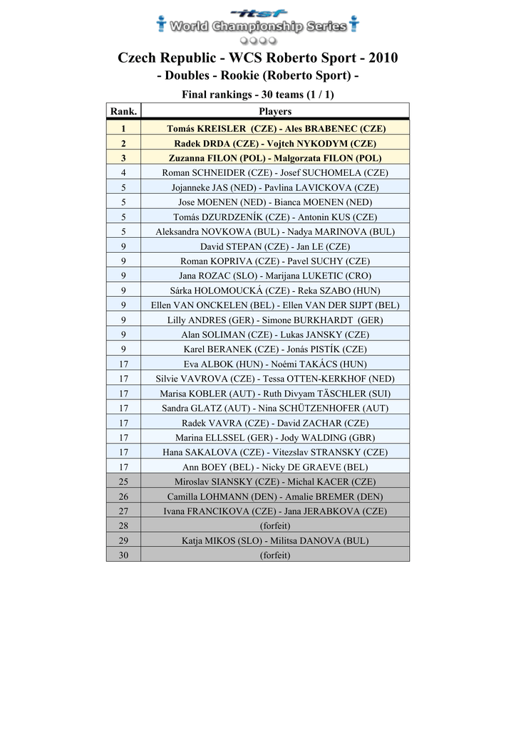 Czech Republic - WCS Roberto Sport - 2010 - Doubles - Rookie (Roberto Sport) Final rankings - 30 teams (1 / 1) Rank. Players 1 Tomás KREISLER (CZE) - Ales BRABENEC (CZE) 2 Radek DRDA (CZE) - Vojtch NYKODYM (CZE) 3 Zuzanna FILON (POL) - Malgorzata FILON (POL) 4 Roman SCHNEIDER (CZE) - Josef SUCHOMELA (CZE) 5 Jojanneke JAS (NED) - Pavlina LAVICKOVA (CZE) 5 Jose MOENEN (NED) - Bianca MOENEN (NED) 5 Tomás DZURDZENÍK (CZE) - Antonin KUS (CZE) 5 Aleksandra NOVKOWA (BUL) - Nadya MARINOVA (BUL) 9 David STEPAN (CZE) - Jan LE (CZE) 9 Roman KOPRIVA (CZE) - Pavel SUCHY (CZE) 9 Jana ROZAC (SLO) - Marijana LUKETIC (CRO) 9 Sárka HOLOMOUCKÁ (CZE) - Reka SZABO (HUN) 9 Ellen VAN ONCKELEN (BEL) - Ellen VAN DER SIJPT (BEL) 9 Lilly ANDRES (GER) - Simone BURKHARDT (GER) 9 Alan SOLIMAN (CZE) - Lukas JANSKY (CZE) 9 Karel BERANEK (CZE) - Jonás PISTÍK (CZE) 17 Eva ALBOK (HUN) - Noémi TAKÁCS (HUN) 17 Silvie VAVROVA (CZE) - Tessa OTTEN-KERKHOF (NED) 17 Marisa KOBLER (AUT) - Ruth Divyam TÄSCHLER (SUI) 17 Sandra GLATZ (AUT) - Nina SCHÜTZENHOFER (AUT) 17 Radek VAVRA (CZE) - David ZACHAR (CZE) 17 Marina ELLSSEL (GER) - Jody WALDING (GBR) 17 Hana SAKALOVA (CZE) - Vitezslav STRANSKY (CZE) 17 Ann BOEY (BEL) - Nicky DE GRAEVE (BEL) 25 Miroslav SIANSKY (CZE) - Michal KACER (CZE) 26 Camilla LOHMANN (DEN) - Amalie BREMER (DEN) 27 Ivana FRANCIKOVA (CZE) - Jana JERABKOVA (CZE) 28 (forfeit) 29 Katja MIKOS (SLO) - Militsa DANOVA (BUL) 30 (forfeit)