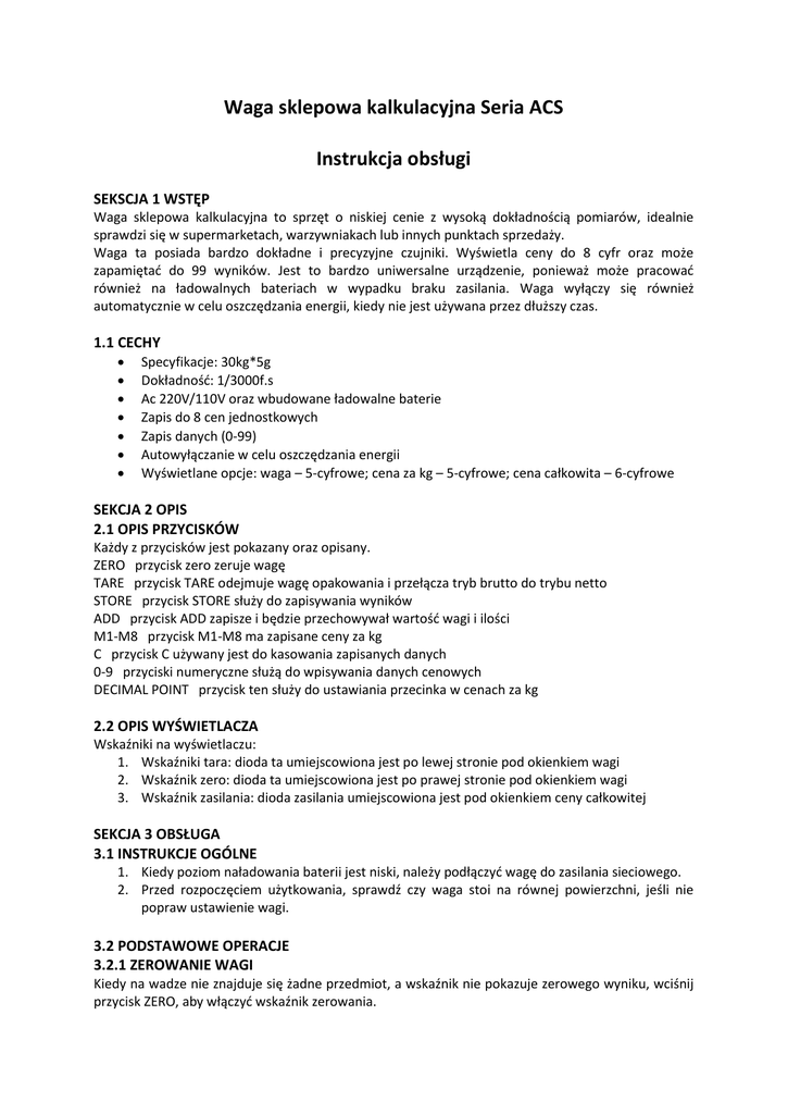 Waga sklepowa kalkulacyjna Seria ACS Instrukcja obsługi SEKSCJA 1 WSTĘP Waga sklepowa kalkulacyjna to sprzęt o niskiej cenie z wysoką dokładnością pomiarów, idealnie sprawdzi się w supermarketach, warzywniakach lub innych punktach sprzedaży. Waga ta posiada bardzo dokładne i precyzyjne czujniki. Wyświetla ceny do 8 cyfr oraz może zapamiętać do 99 wyników. Jest to bardzo uniwersalne urządzenie, ponieważ może pracować również na ładowalnych bateriach w wypadku braku zasilania. Waga wyłączy się również automatycznie w celu oszczędzania energii, kiedy nie jest używana przez dłuższy czas. 1.1 CECHY Specyfikacje: 30kg*5g Dokładność: 1/3000f.s Ac 220V/110V oraz wbudowane ładowalne baterie Zapis do 8 cen jednostkowych Zapis danych (0-99) Autowyłączanie w celu oszczędzania energii Wyświetlane opcje: waga – 5-cyfrowe; cena za kg – 5-cyfrowe; cena całkowita – 6-cyfrowe SEKCJA 2 OPIS 2.1 OPIS PRZYCISKÓW Każdy z przycisków jest pokazany oraz opisany. ZERO przycisk zero zeruje wagę TARE przycisk TARE odejmuje wagę opakowania i przełącza tryb brutto do trybu netto STORE przycisk STORE służy do zapisywania wyników ADD przycisk ADD zapisze i będzie przechowywał wartość wagi i ilości M1-M8 przycisk M1-M8 ma zapisane ceny za kg C przycisk C używany jest do kasowania zapisanych danych 0-9 przyciski numeryczne służą do wpisywania danych cenowych DECIMAL POINT przycisk ten służy do ustawiania przecinka w cenach za kg 2.2 OPIS WYŚWIETLACZA Wskaźniki na wyświetlaczu: 1. Wskaźniki tara: dioda ta umiejscowiona jest po lewej stronie pod okienkiem wagi 2. Wskaźnik zero: dioda ta umiejscowiona jest po prawej stronie pod okienkiem wagi 3. Wskaźnik zasilania: dioda zasilania umiejscowiona jest pod okienkiem ceny całkowitej SEKCJA 3 OBSŁUGA 3.1 INSTRUKCJE OGÓLNE 1. Kiedy poziom naładowania baterii jest niski, należy podłączyć wagę do zasilania sieciowego. 2. Przed rozpoczęciem użytkowania, sprawdź czy waga stoi na równej powierzchni, jeśli nie popraw ustawienie wagi. 3.2 PODSTAWOWE OPERACJE 3.2.1 ZEROWANIE WAGI Kiedy na wadze nie znajduje się żadne przedmiot, a wskaźnik nie pokazuje zerowego wyniku, wciśnij przycisk ZERO, aby włączyć wskaźnik zerowania. 3.2.2 WAŻENIE Upewnij się, że waga jest w pozycji zerowej, umieść dany przedmiot na wadze, waga tego przedmiotu będzie wyświetlona w okienku wagi. 3.2.3 TARA Umieść pojemnik na wadze, kiedy wyświetlany wynik jest już stabilny wciśnij przycisk tarowania, waga opakowania zostanie zapamiętana. Zdejmij pojemnik z wagi i raz jeszcze wciśnij przycisk tarowania. 3.2.4 OSTRZEŻENIE O ZBYT CIĘŻKIM PRZEDIMOCIE Nie waż obiektów, których waga przekracza maksymalną możliwą wagę, w momencie, gdy włączy się alarm, zdejmij obiekt, aby nie spowodować uszkodzenia czujnika ważenia. 3.2.5 USTAWIANIE CENY JEDNOSTKOWEJ Aby móc używać wagi w celach handlowych należy ustawić cenę jednostkową sprzedawanych towarów, a później używać tych przeliczników w celu obliczenia ceny całkowitej ważonych obiektów. Kiedy waga wyświetla ciężar danego produktu, ustaw cenę jednostkową za pomocą przycisków numerycznych, ustawiona cena będzie wyświetlona w okienku ceny jednostkowej, okienko ceny całkowitej pokazuje cenę ostateczną danego towaru. Aby usunąć poprzednią cenę jednostkową, wciśnij przycisk C. 3.3 ZAPISYWANIE DANYCH 3.3.1 PRZYGOTOWANIE DO ZAPISU Za każdym razem przed zapisaniem danych upewnij się, że na wadze nie ma żadnego przedmiotu, obecna wartość zapisywania wynosi 0, a wskaźnik wagi jest stabilny. 3.3.2. ZAPISYWANIE Umieść ważony obiekt na wadze, zaczekaj aż wynik się ustabilizuje, wciśnij przycisk ADD, okienko wyświetli ADD n – oznacza ilość wciśnięcia przycisku ADD. Jeżeli wprowadziłeś cenę jednostkową dla tego obiektu, wyświetli się zarówno waga jak i cena. Umieść obiekt na wadze, pozwól, aby wyświetlany wynik się ustabilizował, wprowadź cenę jednostkową za pomocą przycisków numerycznych, cena ta wyświetli się na okienku ceny jednostkowej, pojawi się również cena całkowita. Teraz wciśnij przycisk ADD, co spowoduje, że otrzymane wyniki wagi i ceny się zapiszą. Następnie, zdejmij pierwszy obiekt z wagi, umieść kolejny obiekt na wadze, pozwól, aby wyświetlany wynik się ustabilizował, wprowadź cenę jednostkową za pomocą przycisków numerycznych, ponownie wciśnij przycisk ADD. Okienko ceny jednostkowej wyświetli ADD 2, a okienko wagi jak i okienko ceny całkowitej wyświetli wagę i cenę danego obiektu. Możesz przeprowadzać takie operacje do 99 razy. 3.3.3 USUWANIE ZAPISANYCH WYNIKÓW Możesz usunąć zapisane wyniki za pomocą wciśnięcia przycisku C (czyszczenie) w każdej wybranej chwili. 3.4 ZAPISYWANIE CENY JEDNOSTKOWEJ Waga ACS może przechowywać do 8 ustawionych cen jednostkowych. 3.4.1 ZAPISYWANIE CEN JEDNOSTKOWYCH Wciśnij przycisk STORE, następnie wprowadź odpowiednią cenę przy użyciu przycisków numerycznych. Teraz wciśnij przycisk M* (*=1 do 8). Wartość będzie zapisana odpowiednio pod przyciskiem M* (*=1 do 8). Jeżeli pod danym przyciskiem zapisałeś już wcześniej inną wartość, stara będzie zastąpiona nową wartością. 3.4.2 WCZYTYWANIE CENY JEDNOSTKOWEJ Jeżeli chcesz użyć ceny jednostkowej zapisanej w wadze, podczas ważenia wciśnij odpowiedni przycisk M* (*=1 do 8) w momencie, gdy wartość wagi jest już stabilna, cena jednostkowa zostanie wczytana i waga wyświetli ceną całkowitą. SEKCJA 4 ŚRODKI OSTROŻNOŚCI 4.1 BATERIA Bateria musi być ładowana w odpowiedni sposób po tym jak używana wagi bez zasilania sieciowego. Normalnie, ładuj baterię prze 1,2 godziny po godzinie pracy. Jeżeli waga nie jest używana przez dłuższy czas, wtedy ładuj ją ciągle przez 24 godziny. W przeciwnym wypadku bateria może zostać uszkodzona. Przed ładowaniem baterii wyłącz wagę. 4.2 WODA/TEMPERATURA Chroń wagę przed opadami deszcze, zalaniem
