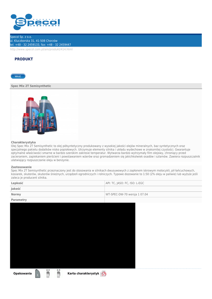 Specol Sp. z o.o. ul. Kluczborska 31, 41-508 Chorzów tel. +48 - 32 2459133, fax: +48 - 32 2459447 http://www.specol.com.pl/ain/produkt/414.html PRODUKT Spec Mix 2T Semisynthetic Charakterystyka Olej Spec Mix 2T Semisynthetic to olej półsyntetyczny produkowany z wysokiej jakości olejów mineralnych, baz syntetycznych oraz specjalnego pakietu dodatków nisko popiołowych. Utrzymuje elementy silnika i układu wydechowe w znakomitej czystości. Gwarantuje optymalne właściwości smarne w bardzo szerokim zakresie temperatur. Wytwarza bardzo wytrzymały film olejowy, chroniący przed zacieraniem, zapiekaniem pierścieni i powstawaniem wżerów oraz gromadzeniem się jakichkolwiek osadów i szlamów. Zawiera rozpuszczalnik ułatwiający rozpuszczanie oleju w benzynie. Zastosowanie Spec Mix 2T Semisynthetic przeznaczony jest do stosowania w silnikach dwusuwowych z zapłonem iskrowym motocykli, pił łańcuchowych, kosiarek, skuterów, skuterów śnieżnych, urządzeń ogrodniczych i rolniczych. Typowe dozowanie to 1:50 (2% oleju w paliwie) lub wyższe jeśli zaleca je producent silnika. Lepkość API: TC, JASO: FC, ISO: L-EGC Jakość Normy WT-SPEC-DW-70 wersja 1 07.04 Parametry PARAMETRY Spec Mix 2T - lepkość kinematyczna w temperaturze 100 oC, mm2/s 9,0 - wskaźnik lepkości 149 - temperatura płynięcia, oC -40 - temperatura zapłonu, oC 80 - popiół siarczanowy, % 0,2 - zawartość wody, % Nie zawiera - zawartość ciał obcych, % Nie zawiera Uwaga: Powyższe wartości parametrów fizyko-chemicznych są wartościami typowymi. Wartości rzeczywiste są umieszczane na orzeczeniach laboratoryjnych dołączonych do każdej partii produktu. Opakowania Karta charakterystyk