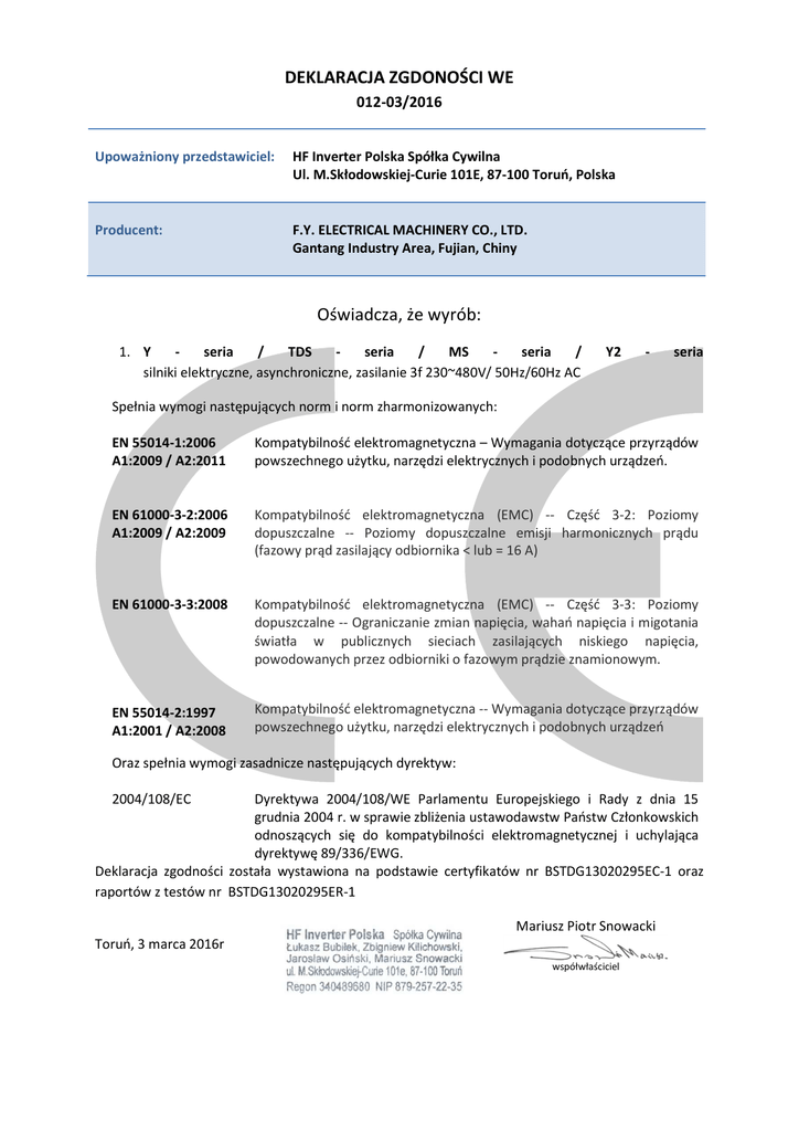 DEKLARACJA ZGDONOŚCI WE 012-03/2016 Upoważniony przedstawiciel: HF Inverter Polska Spółka Cywilna Ul. M.Skłodowskiej-Curie 101E, 87-100 Toruń, Polska Producent: F.Y. ELECTRICAL MACHINERY CO., LTD. Gantang Industry Area, Fujian, Chiny Oświadcza, że wyrób: 1. Y seria / TDS seria / MS seria / silniki elektryczne, asynchroniczne, zasilanie 3f 230~480V/ 50Hz/60Hz AC Y2 - seria Spełnia wymogi następujących norm i norm zharmonizowanych: EN 55014-1:2006 A1:2009 / A2:2011 Kompatybilność elektromagnetyczna – Wymagania dotyczące przyrządów powszechnego użytku, narzędzi elektrycznych i podobnych urządzeń. EN 61000-3-2:2006 A1:2009 / A2:2009 Kompatybilność elektromagnetyczna (EMC) -- Część 3-2: Poziomy dopuszczalne -- Poziomy dopuszczalne emisji harmonicznych prądu (fazowy prąd zasilający odbiornika < lub = 16 A) EN 61000-3-3:2008 Kompatybilność elektromagnetyczna (EMC) -- Część 3-3: Poziomy dopuszczalne -- Ograniczanie zmian napięcia, wahań napięcia i migotania światła w publicznych sieciach zasilających niskiego napięcia, powodowanych przez odbiorniki o fazowym prądzie znamionowym. EN 55014-2:1997 A1:2001 / A2:2008 Kompatybilność elektromagnetyczna -- Wymagania dotyczące przyrządów powszechnego użytku, narzędzi elektrycznych i podobnych urządzeń Oraz spełnia wymogi zasadnicze następujących dyrektyw: 2004/108/EC Dyrektywa 2004/108/WE Parlamentu Europejskiego i Rady z dnia 15 grudnia 2004 r. w sprawie zbliżenia ustawodawstw Państw Członkowskich odnoszących się do kompatybilności elektromagnetycznej i uchylająca dyrektywę 89/336/EWG. Deklaracja zgodności została wystawiona na podstawie certyfikatów nr BSTDG13020295EC-1 oraz raportów z testów nr BSTDG13020295ER-1 Toruń, 3 marca 2016r Mariusz Piotr Snowacki współwłaściciel