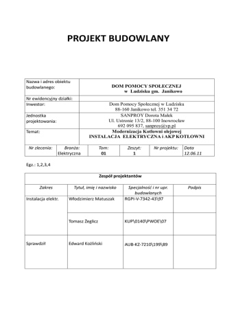 PROJEKT BUDOWLANY Nazwa i adres obiektu budowlanego: DOM POMOCY SPOŁECZNEJ w Ludzisku gm. Janikowo Nr ewidencyjny działki: Inwestor: Dom Pomocy Społecznej w Ludzisku 88-160 Janikowo tel. 351 34 72 SANPROY Dorota Małek Ul. Ustronie 13/2, 88-100 Inowrocław 692 095 837, [email protected] Modernizacja Kotłowni olejowej INSTALACJA ELEKTRYCZNA i AKP KOTŁOWNI Jednostka projektowania: Temat: Nr zlecenia: Branża: Elektryczna Tom: 01 Zeszyt: 1 Nr projektu: Data 12.06.11 Egz.: 1,2,3,4 Zespół projektantów Zakres Instalacja elektr. Sprawdził Tytuł, imię i nazwisko Włodzimierz Matuszak Specjalność i nr upr. budowlanych RGPI-V-7342-43\97 Tomasz Żeglicz KUP\0140\PWOE\07 Edward Kożliński AUB-KZ-7210\199\89 Podpis ZAWARTOŚĆ OPRACOWANIA I. Opis techniczny 1. Zakres opracowania 2. Podstawa opracowania 3. Opis instalacji 3.1. Rozdzielnica kotłowni 3.2. Sterowanie 3.3. Oświetlenie 3.4. Uziemienia i połączenia wyrównawcze 3.5. Sygnalizacja 4. Ochrona od porażeń 5. Wytyczne wykonawcze II. Obliczenia III. Zestawienie materiałów IV. Rysunki 1. Schemat zasilania TE – 01 2. Schemat technologiczno – pomiarowy TE - 02 3. Rozdzielnica RK-1 Schemat zasadniczy TE – 03 4. Rozdzielnica RK -1 Montaż aparatów TE – 04 5. Schemat sterowania TE – 05 6. Schemat sygnalizacji TE - 06 7. Plan instalacji oświetlenia TE- 07 8. Plan instalacji siły i AKP TE – 08 I. OPIS TECHNICZNY 1. Zakres opracowania Zakres opracowania obejmuje instalacje elektryczne i akp kotłowni : - zasilanie kotłowni - rozdzielnicę kotłowni RK-1 - instalację siły - instalację sterowania - aparaturę kontrolno – pomiarową - instalację oświetlenia - instalację uziemiającą i połączeń wyrównawczych 2. Podstawa opracowania - zlecenie inwestora - branża instalacyjna i budowlana niniejszego projektu - obowiązujące przepisy , warunki techniczne oraz normy 3. Opis instalacji 3.1. Rozdzielnica kotłowni RK-1 Projektuje się rozdzielnicę kotłowni w obudowie szafki z tworzywa Rozdzielnicę RK-1 zasilić z istn.RK kotłowni zlokalizowanej w na poziomie Parteru. Z rozdzielnicy RK-1zasilane będą: - regulatory typu VITOTRONIC 100x2, 333 - Stacja uzdatniania wody - oświetlenie kotłowni - gniazda wt.230V dla elektronarzędzi - gniazdo wtyczkowe 24 V SELV pompy P1-P4 3.2. Sterowanie Projektowane kotły Vitoplex 200 kW z II stopniowymi palnikami atmosferycznym przewiduje się wyposażyć w cyfrowe regulatory kotła VITOTRONIC 100 Typ GC1 do współpracy z regulatorami zewn. VITOTRONIC 333\regulator kaskadowy\ z modułem komunikacyjnym LON. Kotły zabezpieczone są optymalnie przy zastosowaniu regulatora Vitotronic 333. Regulator obsługuje obieg grzewczy,- rys TE-02 Temperatura na zasilaniu obiegu grzewczego ustalana jest przez czujniki temperatury wody na zasilaniu \czujniki kontaktowe.\ Do dostrojenia regulatora do budynku i instalacji grzewczej,należy nastawić krzywą grzewczą. Przebieg krzywej grzewczej ustala wartość zadaną temperatury wody w kotle w zależności od temperatury zewnętrznej. Regulacja następuje zgodnie z ustaloną temperaturą zewnętrzną. Ta jest ustalana wspólnie z temperatury rzeczywistej i stłumionej. Przebieg krzywej grzewczej można zmienić dokonując wyboru odpowiedniej wartości zadanej lub rodzaju eksploatacji. 3.3. Oświetlenie Projektuje się oświetlenie ogólne lampami typu TCW PACYFIK. Zastosowano oprawy kroploszczelne o stopniu ochrony IP54.Wymagane natężenie oświetlenia w kotłowni zgodnie z PN-84E02033 wynosi 100Lx. Instalację wykonać w\g rys TE – 07 W kotłowni przewidziano ponadto: - gniazdo wtyczkowe 24V 50Hz SELV – OSWIETLENIA BEZP. - Gniazdo 230 V 50 Hz dla elektronarzędzi Pomieszczenia magazynowe należy podłączyć z osobnego wydzielonego obwodu elektrycznego oświetlenia w RK-1 3.4. Uziemienia i połączenia wyrównawcze Wszystkie części dostępne i przewodzące części obce należy połączyć metalicznie. Projektuje się SZYNĘ UZIEMIAJACA, którą należy zainstalować w kotłowni i połączyć z uziomem pograżalnym wykonanym osprzętem firmy GALMAR. Wykonać magistralę uziemiającą poprzez szynę wyrównawczą od której Przewodem LY żo 10mm przy pomocy zacisków wykonać połączenia z: - instalacją zimnej wody punktem „PE” RK rozdzielaczami c.o i c.w. naczynie wzbiorcze przeponowe Wkłady kominowe kotłów należy na dachu połączyć ze zwodem instalacji odgromowej budynku przy pomocy opaski metalowej i drutu Ø8mm. 3.5. Sygnalizacja Poprzez system LON regulatory posiadają możliwość diagnozowania sygnałów awaryjnych urządzeń kotłowni. Projektuje się zbiorczą sygnalizację z jej kontrolą i kasowaniem. poza kotłownią\. Projektuje się sygnalizator akustyczno optyczny. Rysunki związane TE-02, TE-03,TE-05,TE-06,TE-08 3. Ochrona od porażeń Sieć TNS . Środkiem ochronnym przed dotykiem pośrednim jest szybkie wyłączanie zasilania wykonane przez: - wyłącznik różnicowo prądowy dla całej rozdzielnicy RK - wyłączniki samoczynne typu S301 FAEL LEGRAND dla obwodów zasilających poszczególne odbiorniki - połączenia wyrównawcze główne 4. Wytyczne wykonawcze - instalacje elektryczne wymienione w opisie wykonać jako hermetyczne o stopniu ochrony IP 44 - przewody prowadzić w korytkach instalacyjnych PCV, - podejścia do urządzeń przewodów wykonać w wężach elastycznych typu PESHEL PCV - MAGISTRALĘ UZIEMIAJĄCĄ – mocować n\t na uchwytach - po zakonczeniu robót montażowych wykonać pomiary rezystancji izolacji, pomiary ochronne i próby funkcjonalne. ZESTAWIENIE MATERIAŁÓW L.P. Oznacz schemat WYSZCZEGÓLNIENIE Obiekt Dom Pomocy Społecznej Ludzisko Typ Tytuł Instalacja elektryczna i AKP Dane Techn. Jedn. ilosc katalog AKP 4 Regulator VITOTRONIC 100 230V Z modułem komun.LON 7143002 Regulator VITOTRONIC 333 Z 230V PODSTAWĄ DO MOCOWANIA n ścianie K7-K12 Przekaźnik P184 zanurzeniowy czujnik temp. 7450641 z tuleją zanurzeniową 5 Czujnik temp.T1 7450641 „ 2 „ 6 Czujnik temp. w podgrze