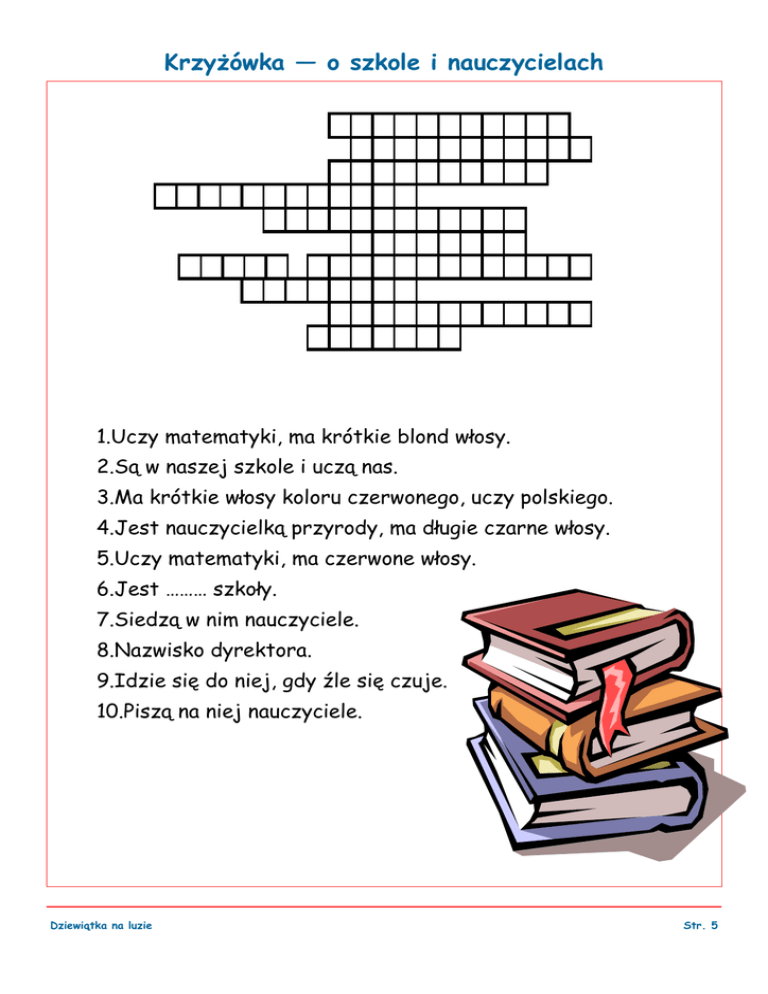 KrzyŜówka — o szkole i nauczycielach 1.Uczy matematyki, ma krótkie blond włosy. 2.Są w naszej szkole i uczą nas. 3.Ma krótkie włosy koloru czerwonego, uczy polskiego. 4.Jest nauczycielką przyrody, ma długie czarne włosy. 5.Uczy matematyki, ma czerwone włosy. 6.Jest ……… szkoły. 7.Siedzą w nim nauczyciele. 8.Nazwisko dyrektora. 9.Idzie się do niej, gdy źle się czuje. 10.Piszą na niej nauczyciele. Dziewiątka na luzie Str. 5 Transfery lata 2007 Jednym z najdroŜszych trasferów piłkarskich było przejście Fernanda Torresa z Atletico Madryt do Liverpoolu. Kosztował on 40 m l d e u r o . Torres miał śwetny debiut w premiership. Strzelał gole i asystował. No w końcu musi strzelać, bo inaczej Rafa Benitez by się na niego pogniewał. Torres to świetny piłkarz dysponujący dobrymi zwodami i techniką Jednym z najciekawszych transferów było przejście Thierrego Henry z Arsenalu do Barcelony. Henry kosztował Barcę 24 mld euro. W pierwszych meczach, w których grał nie pokazał świetnej formy, poniewaŜ nie grał w piłke przez dwa miesiące, ale juŜ pozbierał się i gra tak jak to było w Arsenalu i nawet strzelił swojego pierwszego gola dla Barcy w lidze mistrzów. Między innymi dzięki niemu zespół wygrał z Lyonem 3:0. Gol Henrego był trzecim golem zdobytym dla Barcy Polak grający w bundeslidze Ebi Smolarek przeszedł z Barusi Dortmund do Racingu Santander. Debiut Ebiego nie był udany, poniewaŜ w pierwszym meczu, w którym zagrał otrzymał czerwoną kartkę za brutalny faul na zawodniku Barcelony. W następnym meczu Polak pokazał, Ŝe warto było za niego wydać 4,5 mld euro. Ebi niedawno strzelił swojego pierwszego gola w racingu. Był to szczególnie waŜny strzał dla naszej piłki, poniewaŜ był to pierwszy gol strzelony od dziesięciu lat w premiera divisione. Polacy coraz bliŜej Mistrzostw Europy Polska reprezentacja pod dowództwem Leo Benhackachera osiąga coraz lepsze wyniki. Na początku eliminacji Polacy nie grali najlepiej, poniewaŜ pozostał ślad po wcześniejszych rządach Pawla Janasa, lecz Leo Benhacker wyprowadził naszą druŜynę na prostą. Holenderski trener wprowadził do składu nowych, młodych zawodników i opłacało się POLSKA ZACZĘŁA WYGRYWAĆ A wszystko zaczęło się w rundzie wiosennej od zwycięstwa na Kazachstanem, potem wygrana 2:1 z wielką Portugalią i jeszcze wiele meczy z innymi druŜynami. Lecz nie zawsze bylo milo. W rundzie jesiennej przegraliśmy z Armenią 0:1, po- Dziewiątka na luzie tem były remisy z Portugalią na ich własnym terenie i z Finlandią w Helsinkach. Nadszedł wreszcie mecz z Kazachstanem, w którym Polska wygrała 3:1 z klasycznym hattrickiem w wykonaniu Ebiego Smolarka. Polakom brakuje tylko jednego zwycięstwa z Belgią, by wejść do ME. Twórcami zwycięstwa z kazachami byli : Ebi Smolarekpomocnik,strzelec trzech goli dla Polski, Jacek Krzynówek skrzydłowy, w ostatnim czasie jest w szczytowej formie, wszystkie bramki padły dzięki jego waleczności, Artur Borucbramkarz, co prawda nie miał za duŜo roboty, ale gdy Kazachowie wyprowadzili kontrę nie miał za wiele do powiedzenia, Maciej śurawskinapastnik, po jego wejściu znacznie oŜywiła się gra polskiej druŜyny, Jacek Bąk- obrońca, dzięki jego asyście padła druga bramka dla polskiej druŜyny, Ma rc in Was ilews kiobrńca, po śmierci ojca chłopak pozbierał się i zagrał dobry mecz. CHŁOPAKI TAK TRZYMAĆ ! Polska— Kazachstan 3:1 Str. 7 Plener malarski 2 października, w ramach obchodów 10 lecia kształcenia integracyjnego w Koninie, nasza szkoła zorganizowała plener malarski uczniów klas integracyjnych szkół konińskich. Mimo niesprzyjającej pogody plener malarski odbył się … pod dachem. Swojej gościnności uŜyczyli nam Urząd Miasta Konina, Miejska Biblioteka Publiczna i Koniński Dom Kultury. Uczniowie z entuzjazmem podeszli do realizacji tematu, który brzmiał Konin — moje miasto. Efektem działań plastycznych są prace wykonane róŜnymi technikami. Podziwiać je będzie moŜna na poplenerowej wystawie 1 grudnia w Górniczym Domu Kultury. Będą one jedno- cześnie scenografią do finału obchodów 10 lecia kształcenia integracyjnego w Koninie. Dzień Nauczyciela Święto nauczycieli przypadło w tym roku w niedzielę, ale my nie zapomnieliśmy o swoich ukochanych belfrach i świętowaliśmy w piątek 12 października. Pozwoliliśmy w tym dniu odpocząć naszym nauczycielom i prowadziliśmy za nich lekcje, a dobra wróŜka i czarodziej częstowali wszystkich pracowników szkoły cukierkami. Nie zabrakło oczywiście Ŝyczeń, uścisków, całusów i bukietów kwiatów. śyczymy naszym nauczycielom wszystkiego najlepszego. Aktualności z Ŝycia naszej szkoły Ślubowanie klas I 19 października zostali przyjęci do naszej społeczności uczniowie czterech klas pierwszych. W uroczystej scenerii przyrzekali na sztandar naszej szkoły, Ŝe Dziewiątka na luzie Str. 7 Dziewiątka na luzie Miesięcznik uczniów Szkoły Podstawowej z Oddziałami Integracyjnymi nr 9 w Koninie Redakcja : Anna Nalewaj, Anna Pawlak, Aleksandra Urbańska, Sandra, Bartosz Bilski, Piotr, Magdalena Molenda, Aleksandra Wasilewska, Zuzanna śabierek, Anna , Korekta i opieka merytoryczna : Ewa Strzykowska Sponsorzy wydania