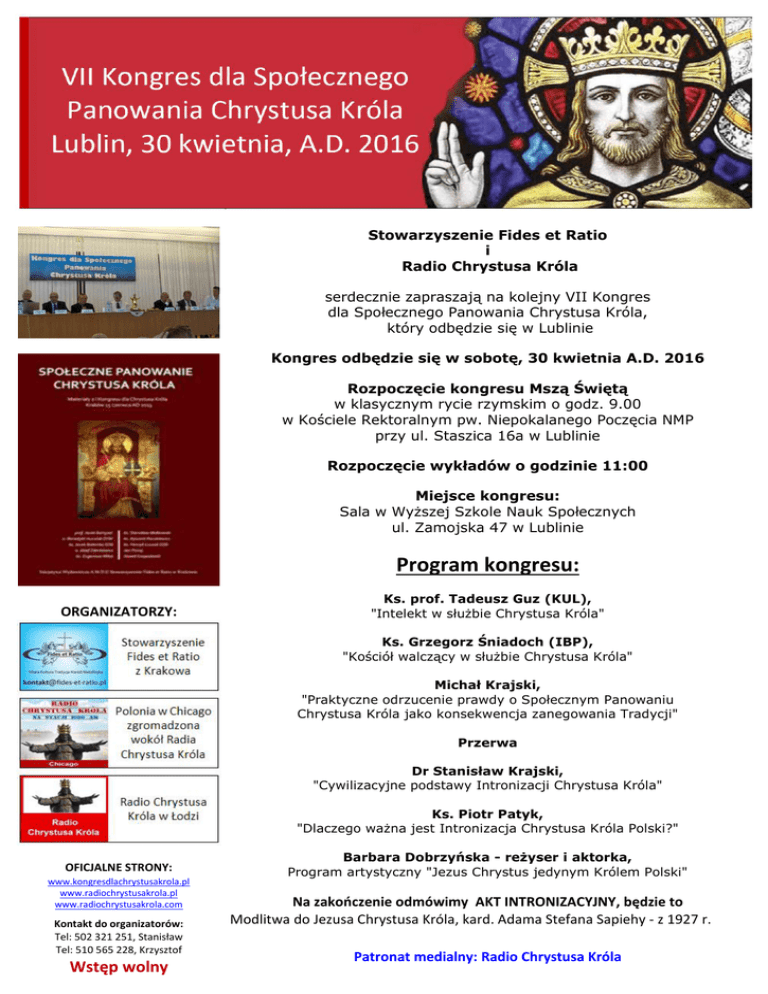 Stowarzyszenie Fides et Ratio i Radio Chrystusa Króla serdecznie zapraszają na kolejny VII Kongres dla Społecznego Panowania Chrystusa Króla, który odbędzie się w Lublinie Kongres odbędzie się w sobotę, 30 kwietnia A.D. 2016 Rozpoczęcie kongresu Mszą Świętą w klasycznym rycie rzymskim o godz. 9.00 w Kościele Rektoralnym pw. Niepokalanego Poczęcia NMP przy ul. Staszica 16a w Lublinie Rozpoczęcie wykładów o godzinie 11:00 Miejsce kongresu: Sala w Wyższej Szkole Nauk Społecznych ul. Zamojska 47 w Lublinie Program kongresu: ORGANIZATORZY: Ks. prof. Tadeusz Guz (KUL), "Intelekt w służbie Chrystusa Króla" Ks. Grzegorz Śniadoch (IBP), "Kościół walczący w służbie Chrystusa Króla" Michał Krajski, "Praktyczne odrzucenie prawdy o Społecznym Panowaniu Chrystusa Króla jako konsekwencja zanegowania Tradycji" Przerwa Dr Stanisław Krajski, "Cywilizacyjne podstawy Intronizacji Chrystusa Króla" Ks. Piotr Patyk, "Dlaczego ważna jest Intronizacja Chrystusa Króla Polski?" OFICJALNE STRONY: www.kongresdlachrystusakrola.pl www.radiochrystusakrola.pl www.radiochrystusakrola.com Kontakt do organizatorów: Tel: 502 321 251, Stanisław Tel: 510 565 228, Krzysztof Wstęp wolny Barbara Dobrzyńska - reżyser i aktorka, Program artystyczny "Jezus Chrystus jedynym Królem Polski" Na zakończenie odmówimy AKT INTRONIZACYJNY, będzie to Modlitwa do Jezusa Chrystusa Króla, kard. Adama Stefana Sapiehy - z 1927 r. Patronat medialny: Radio Chrystusa Króla