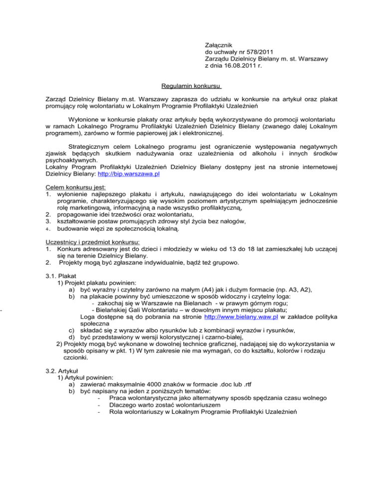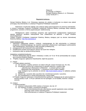 Załącznik do uchwały nr 578/2011 Zarządu Dzielnicy Bielany m. st. Warszawy z dnia 16.08.2011 r. Regulamin konkursu Zarząd Dzielnicy Bielany m.st. Warszawy zaprasza do udziału w konkursie na artykuł oraz plakat promujący rolę wolontariatu w Lokalnym Programie Profilaktyki Uzależnień Wyłonione w konkursie plakaty oraz artykuły będą wykorzystywane do promocji wolontariatu w ramach Lokalnego Programu Profilaktyki Uzależnień Dzielnicy Bielany (zwanego dalej Lokalnym programem), zarówno w formie papierowej jak i elektronicznej. Strategicznym celem Lokalnego programu jest ograniczenie występowania negatywnych zjawisk będących skutkiem nadużywania oraz uzależnienia od alkoholu i innych środków psychoaktywnych. Lokalny Program Profilaktyki Uzależnień Dzielnicy Bielany dostępny jest na stronie internetowej Dzielnicy Bielany: http://bip.warszawa.pl Celem konkursu jest: 1. wyłonienie najlepszego plakatu i artykułu, nawiązującego do idei wolontariatu w Lokalnym programie, charakteryzującego się wysokim poziomem artystycznym spełniającym jednocześnie rolę marketingową, informacyjną a nade wszystko profilaktyczną, 2. propagowanie idei trzeźwości oraz wolontariatu, 3. kształtowanie postaw promujących zdrowy styl życia bez nałogów, 4. budowanie więzi ze społecznością lokalną. Uczestnicy i przedmiot konkursu: 1. Konkurs adresowany jest do dzieci i młodzieży w wieku od 13 do 18 lat zamieszkałej lub uczącej się na terenie Dzielnicy Bielany. 2. Projekty mogą być zgłaszane indywidualnie, bądź też grupowo. - 3.1. Plakat 1) Projekt plakatu powinien: a) być wyraźny i czytelny zarówno na małym (A4) jak i dużym formacie (np. A3, A2), b) na plakacie powinny być umieszczone w sposób widoczny i czytelny loga: - zakochaj się w Warszawie na Bielanach - w prawym górnym rogu; - Bielańskiej Gali Wolontariatu – w dowolnym innym miejscu plakatu; Loga dostępne są do pobrania na stronie http://www.bielany.waw.pl w zakładce polityka społeczna c) składać się z wyrazów albo rysunków lub z kombinacji wyrazów i rysunków, d) być przedstawiony w wersji kolorystycznej i czarno-białej, 2) Projekty mogą być wykonane w dowolnej technice graficznej, nadającej się do wykorzystania w sposób opisany w pkt. 1) W tym zakresie nie ma wymagań, co do kształtu, kolorów i rodzaju czcionki. 3.2. Artykuł 1) Artykuł powinien: a) zawierać maksymalnie 4000 znaków w formacie .doc lub .rtf b) być napisany na jeden z poniższych tematów: - Praca wolontarystyczna jako alternatywny sposób spędzania czasu wolnego - Dlaczego warto zostać wolontariuszem - Rola wolontariuszy w Lokalnym Programie Profilaktyki Uzależnień 4. Projekty należy składać w formie elektronicznej na płycie CD lub DVD oraz w formie papierowej (wydruk plakatu w kolorze) 5. Każdy projekt musi być podpisany i zawierać: imię (imiona) i nazwisko (nazwiska) autorów projektu, wiek, oznaczenie placówki/instytucji i ewentualnie nauczyciela lub opiekuna zespołu. Projekty nie opisane nie będą oceniane. 6. Każda osoba lub zespół mogą zgłosić maksymalnie dwa projekty. 7. Wszystkie prace zgłoszone na konkurs oraz prawa autorskie przechodzą na własność organizatora. 8. Udział w konkursie jest jednocześnie akceptacją postanowień Regulaminu i zgodą na filmowanie, fotografowanie oraz publikowanie projektów. 9. Organizatorzy zastrzegają sobie prawo do nierozstrzygnięcia konkursu. Terminy składania projektów i rozstrzygnięcie konkursu 1. Projekty należy składać w podpisanej kopercie, opatrzonej klauzulą „KONKURS – PLAKAT lub ARTYKUŁ PROFILAKTYCZNY” w Wydziale Spraw Społecznych i Zdrowia dla Dzielnicy Bielany, ul. Żeromskiego 29, pok. 116, do dnia 31 października 2011 r. 2. Oceny i wyboru plakatu oraz artykułu dokona komisja składająca się z przedstawicieli: a) Zarządu Dzielnicy Bielany b) Wydziału Oświaty i Wychowania dla Dzielnicy Bielany c) Wydziału Spraw Społecznych i Zdrowia dla Dzielnicy Bielany d) Dzielnicowego Zespołu Realizacji Programu Profilaktyki i Rozwiązywania Problemów Alkoholowych 3. Wyniki konkursu oraz prezentacja najlepszych prac zostaną podane do publicznej wiadomości na stronie internetowej Dzielnicy Bielany www.bielany.waw.pl. Najlepsze artykuły zostaną opublikowane w miesięczniku „Nasze Bielany”. 4. Uroczyste wręczenie nagród dla zwycięzcy/zwycięzców konkursu i wyróżnionych uczestników nastąpi podczas „Gali Wolontariatu” organizowanej przez Zarząd Dzielnicy Bielany z okazji Międzynarodowego Dnia Wolontariusza, w grudniu 2011 r. Zarząd Dzielnicy Bielany m . st. Warszawy Burmistrz Rafał Miastowski ............................................................. Zastępca Burmistrza Kacper Pietrusiński ............................................................. Zastępca Burmistrza Marek Lipiński ............................................................. Zastępca Burmistrza Piotr Rudzki ............................................................. Zastępca Burmistrza Grzegorz Pietruczuk .............................................................