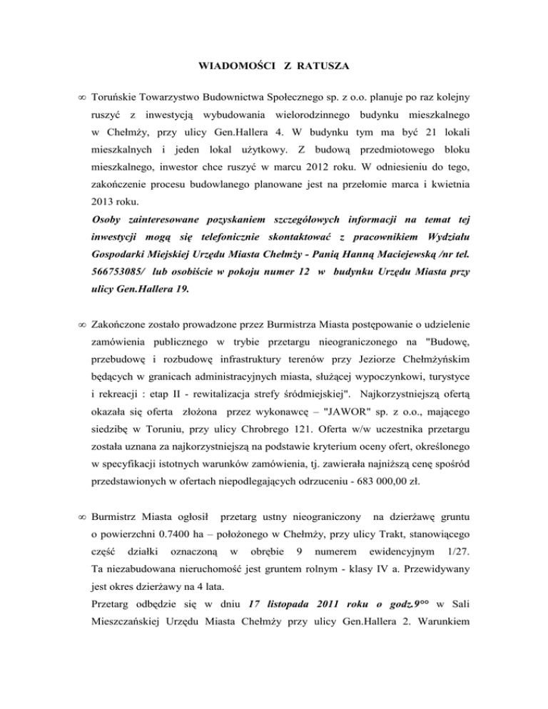 WIADOMOŚCI Z RATUSZA • Toruńskie Towarzystwo Budownictwa Społecznego sp. z o.o. planuje po raz kolejny ruszyć z inwestycją wybudowania wielorodzinnego budynku mieszkalnego w ChełmŜy, przy ulicy Gen.Hallera 4. W budynku tym ma być 21 lokali mieszkalnych i jeden lokal uŜytkowy. Z budową przedmiotowego bloku mieszkalnego, inwestor chce ruszyć w marcu 2012 roku. W odniesieniu do tego, zakończenie procesu budowlanego planowane jest na przełomie marca i kwietnia 2013 roku. Osoby zainteresowane pozyskaniem szczegółowych informacji na temat tej inwestycji mogą się telefonicznie skontaktować z pracownikiem Wydziału Gospodarki Miejskiej Urzędu Miasta ChełmŜy - Panią Hanną Maciejewską /nr tel. 566753085/ lub osobiście w pokoju numer 12 w budynku Urzędu Miasta przy ulicy Gen.Hallera 19. • Zakończone zostało prowadzone przez Burmistrza Miasta postępowanie o udzielenie zamówienia publicznego w trybie przetargu nieograniczonego na "Budowę, przebudowę i rozbudowę infrastruktury terenów przy Jeziorze ChełmŜyńskim będących w granicach administracyjnych miasta, słuŜącej wypoczynkowi, turystyce i rekreacji : etap II - rewitalizacja strefy śródmiejskiej". Najkorzystniejszą ofertą okazała się oferta złoŜona przez wykonawcę – "JAWOR" sp. z o.o., mającego siedzibę w Toruniu, przy ulicy Chrobrego 121. Oferta w/w uczestnika przetargu została uznana za najkorzystniejszą na podstawie kryterium oceny ofert, określonego w specyfikacji istotnych warunków zamówienia, tj. zawierała najniŜszą cenę spośród przedstawionych w ofertach niepodlegających odrzuceniu - 683 000,00 zł. • Burmistrz Miasta ogłosił przetarg ustny nieograniczony na dzierŜawę gruntu o powierzchni 0.7400 ha – połoŜonego w ChełmŜy, przy ulicy Trakt, stanowiącego część działki oznaczoną w obrębie 9 numerem ewidencyjnym 1/27. Ta niezabudowana nieruchomość jest gruntem rolnym - klasy IV a. Przewidywany jest okres dzierŜawy na 4 lata. Przetarg odbędzie się w dniu 17 listopada 2011 roku o godz.9°° w Sali Mieszczańskiej Urzędu Miasta ChełmŜy przy ulicy Gen.Hallera 2. Warunkiem 2 przystąpienia do przetargu jest wpłacenie przez potencjalnego uczestnika wadium w kwocie 247,00 zł. Osoby zainteresowane postępowaniem przetargowym mogą zapoznać się z jego szczegółami na stronie internetowej Urzędu Miasta ChełmŜy – www.bip.chelmza.pl /zakładka przetargi/. • W pasie drogowym przy ulicy Bydgoskiej, na wysokości od Placu Sybiraków do ulicy Stanisława Zagrodzkiego wysadzonych zostało 1900 krzewów kwitnących tawuły van Houtte'a oraz 110 drzew - lipy i brzozy / sadzonych na przemian/. Koszty zakupu roślin oraz ich posadzenia pokryte zostaną z budŜetu miasta. W ten sposób ostatecznie zakończy się inwestycja związana z przebudową ulicy Bydgoskiej. Tereny te nabiorą szczególnych barw w okresie kwitnienia krzewów w maju. • Intensywne prace budowlane w okolicach Bulwaru 1000-lecia dobiegają końca. Prowadzone w ramach inwestycji pn. „Rewitalizacja strefy śródmiejskiej ChełmŜy w części zlokalizowanej przy Jeziorze ChełmŜyńskim od ul. Tumskiej do ul. Toruńskiej – etap I” działania rewitalizacyjne wkroczyły na ostatnią prostą. Zwieńczeniem wszystkich zrealizowanych do tej pory zadań jest trwająca obecnie modernizacja nawierzchni Bulwaru 1000-lecia. Ten najdłuŜszy i najwaŜniejszy ciąg pieszo-rowerowy strefy przyjeziornej wyłoŜony został kostką klinkierową w kolorze Ŝółtym oraz w przypadku ścieŜki rowerowej szarą kostką betonową. Modernizacji nawierzchni towarzyszyło równieŜ wykonanie nowej kanalizacji deszczowej oraz instalacja stylowych lamp, które w porze nocnej podkreślać będą walory tego miejsca, nadając mu niepowtarzalny klimat. PoniewaŜ strefa przyjeziorna jest miejscem wypoczynku dla mieszkańców oraz turystów, wzdłuŜ Bulwaru rozlokowanych zostanie 14 ławek posadowionych na placach utwardzonych o nawierzchni z kostki kamiennej. Obecnie trwają prace wykończeniowe oraz budowa pochylni dla osób niepełnosprawnych, prowadzącej do strefy przyjeziornej od strony ulicy Sądowej. Ostatni etap projektu obejmuje równieŜ przygotowanie nawierzchni pod strefę aktywnego wypoczynku – skate park oraz montaŜ dwóch kamer monitoringu wizyjnego. Skate park o powierzchni blisko 906 m2, wyłoŜony zostanie nawierzchnią syntetyczną, gwarantującą bezpieczne i komfortowe warunki korzystania z obiektu. 3 W ramach prowadzonych prac wykończeniowych przewiduje się równieŜ zainstalowanie drewnianych siedzisk „amfiteatru” połoŜonego w bezpośrednim sąsiedztwie plaŜy miejskiej. Zakończenie wszystkich prac w ramach pierwszego etapu rewitalizacji nastąpi w listopadzie br. Projekt jest realizowany przy współudziale środków z Europejskiego Funduszu Rozwoju Regionalnego w ramach Działania 7.1 Rewitalizacja zdegradowanych dzielnic miast Regionalnego Programu Operacyjnego Województwa KujawskoPomorskiego na lata 2007-2013. Wartość całkowita realizowanego projektu wynosi 5 954 810,98 zł. Dofinansowanie w kwocie 3 052 171,13 zł stanowi 54,42% kosztów kwalifikowalnych projektu. Pozostałe wydatki gmina miasto ChełmŜa pokryje ze środków własnych. Przebudowana nawierzchnia Bulwaru 1000-lecia chełmŜan oraz licznych gości odwiedzających nasze miasto. - miejsca spacerów 4 W nowej szacie ciąg pieszo-rowerowy na Bulwarze -1000 lecia • Miejski Ośrodek Pomocy Społecznej w ChełmŜy kieruje do Ośrodka Wsparcia Caritas Diecezji Toruńskiej na ulicę Polną 20 , bezdomnych z terenu Miasta ChełmŜa. Jak do tej pory wydano 4 takie skierowania. MOPS zwraca się z apelem do mieszkańców, aby informowali pracowników Ośrodka o osobach , które w nadchodzącym okresie zimowym wymagają pomocy, a same o nią nie wystąpią oraz o przypadkach, które ze względu na swój charakter wymagają doraźnej interwencji socjalnej. W nadchodzącej porze roku MOPS będzie ze szczególną wnikliwo