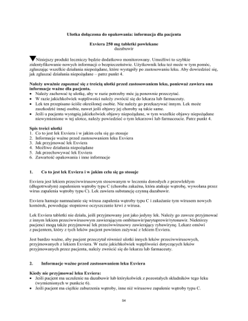 Ulotka dołączona do opakowania: informacja dla pacjenta Exviera 250 mg tabletki powlekane dazabuwir Niniejszy produkt leczniczy będzie dodatkowo monitorowany. Umożliwi to szybkie zidentyfikowanie nowych informacji o bezpieczeństwie. Użytkownik leku też może w tym pomóc, zgłaszając wszelkie działania niepożądane, które wystąpiły po zastosowaniu leku. Aby dowiedzieć się, jak zgłaszać działania niepożądane – patrz punkt 4. Należy uważnie zapoznać się z treścią ulotki przed zastosowaniem leku, ponieważ zawiera ona informacje ważne dla pacjenta. Należy zachować tę ulotkę, aby w razie potrzeby móc ją ponownie przeczytać. W razie jakichkolwiek wątpliwości należy zwrócić się do lekarza lub farmaceuty. Lek ten przepisano ściśle określonej osobie. Nie należy go przekazywać innym. Lek może zaszkodzić innej osobie, nawet jeśli objawy jej choroby są takie same. Jeśli u pacjenta wystąpią jakiekolwiek objawy niepożądane, w tym wszelkie objawy niepożądane niewymienione w tej ulotce, należy powiedzieć o tym lekarzowi lub farmaceucie. Patrz punkt 4. Spis treści ulotki 1. Co to jest lek Exviera i w jakim celu się go stosuje 2. Informacje ważne przed zastosowaniem leku Exviera 3. Jak przyjmować lek Exviera 4. Możliwe działania niepożądane 5. Jak przechowywać lek Exviera 6. Zawartość opakowania i inne informacje 1. Co to jest lek Exviera i w jakim celu się go stosuje Exviera jest lekiem przeciwwirusowym stosowanym w leczeniu dorosłych z przewlekłym (długotrwałym) zapaleniem wątroby typu C (choroba zakaźna, która atakuje wątrobę, wywołana przez wirus zapalenia wątroby typu C). Lek zawiera substancję czynną dazabuwir. Exviera hamuje namnażanie się wirusa zapalenia wątroby typu C i zakażanie tym wirusem nowych komórek, powodując stopniowe oczyszczanie krwi z wirusa. Lek Exviera tabletki nie działa, jeśli przyjmowany jest jako jedyny lek. Należy go zawsze przyjmować z innym lekiem przeciwwirusowym zawierającym ombitaswir/parytaprewir/rytonawir. Niektórzy pacjenci mogą także przyjmować lek przeciwwirusowy zawierający rybawirynę. Lekarz omówi z pacjentem, który z tych leków pacjent powinien zażywać z lekiem Exviera. Jest bardzo ważne, aby pacjent przeczytał również ulotki innych leków przeciwwirusowych, przyjmowanych z lekiem Exviera. W razie jakichkolwiek wątpliwości dotyczących leków przyjmowanych przez pacjenta, należy zwrócić się do lekarza lub farmaceuty. 2. Informacje ważne przed zastosowaniem leku Exviera Kiedy nie przyjmować leku Exviera: Jeśli pacjent ma uczulenie na dazabuwir lub którykolwiek z pozostałych składników tego leku (wymienionych w punkcie 6). Jeśli pacjent ma ciężkie zaburzenia wątroby, inne niż wirusowe zapalenie wątroby typu C. 54 Jeśli pacjent przyjmuje którykolwiek z leków wymienionych w poniższej tabeli. W przypadku, gdy leki Exviera i ombitaswir/parytaprewir/rytonawir zostaną przyjęte z tymi lekami, mogą wystąpić ciężkie lub zagrażające życiu działania niepożądane. Leki te mogą wpływać na działanie leków Exviera i ombitaswiru/parytaprewiru/rytonawiru lub leki Exviera i ombitaswir/parytaprewir/rytonawir mogą wpływać na działanie wymienionych leków. Leki, których nie wolno przyjmować z lekiem Exviera Lek lub substancja czynna Cel stosowania leku karbamazepina, fenytoina, fenobarbital padaczka efawirenz, etrawiryna, newirapina zakażenie HIV enzalutamid rak gruczołu krokowego leki zawierające etynyloestradiol, takie jak antykoncepcja większość doustnych środków antykoncepcyjnych i systemów terapeutycznych dopochwowych stosowanych w antykoncepcji gemfibrozyl aby zmniejszyć stężenie cholesterolu i innych tłuszczów we krwi mitotan niektóre nowotwory nadnerczy ryfampicyna zakażenia bakteryjne dziurawiec zwyczajny (Hypericum w przypadku niepokoju i łagodnej depresji perforatum) lek ziołowy dostępny bez recepty Nie stosować leku Exviera, jeśli którykolwiek z powyższych punktów dotyczy pacjenta. W razie jakichkolwiek wątpliwości przed rozpoczęciem stosowania leku Exviera należy zwrócić się do lekarza lub farmaceuty. Ostrzeżenia i środki ostrożności Przed rozpoczęciem przyjmowania leku Exviera należy poinformować lekarza lub farmaceutę, jeśli u pacjenta występuje inna choroba wątroby niż wirusowe zapalenie wątroby typu C. Podczas leczenia lekami Exviera i ombitaswir/parytaprewir/rytonawir, należy powiedzieć lekarzowi, jeśli u pacjenta występują następujące objawy, ponieważ mogą być one oznaką nasilenia zaburzeń wątroby: – nudności, wymioty lub utrata apetytu, – zażółcenie skóry lub oczu, – ciemniejsza niż zwykle barwa moczu. Jeśli którykolwiek z powyższych punktów dotyczy pacjenta (lub pacjent nie jest pewny) należy powiedzieć o tym lekarzowi lub farmaceucie przed przyjęciem leku Exviera. Badania krwi Lekarz zleci badania krwi przed rozpoczęciem, w czasie i po zakończeniu stosowania leku Exviera. Są one wykonywane, aby lekarz mógł: podjąć decyzję, jakie inne leki pacjent powinien przyjmować z lekiem Exviera i jak długo, stwierdzić czy leczenie jest skuteczne i czy u pacjenta nie występuje już wirus zapalenia wątroby typu C, sprawdzić czy u pacjenta nie występują działania niepożądane leku Exviera lub innych leków przeciwwirusowych przepisanych pacjentowi do stosowania z lekiem Exviera (takich jak ombitaswir/parytaprewir/rytonawir i rybawiryna). Dzieci i młodzież Nie należy podawać leku Exviera dzieciom i młodzieży w wieku poniżej 18 lat. Nie badano stosowania leku Exviera u dzieci i młodzieży. 55 Lek Exviera a inne leki Należy powiedzieć lekarzowi lub farmaceucie o wszystkich lekach przyjmowanych przez pacjenta obecnie lub ostatnio, a także o lekach, które pacjent planuje przyjmować. Pewnych leków nie wolno przyjmować z lekiem Exviera – patrz tabela powyżej „Leki, których nie wolno przyjmować z lekiem Exviera”. Prz