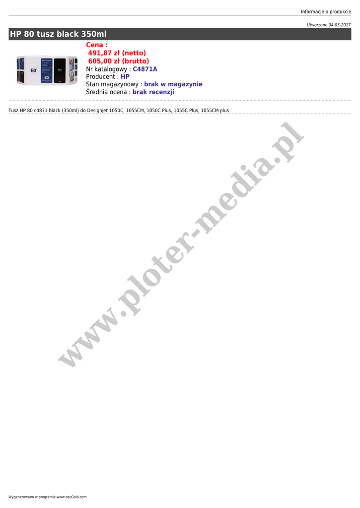 Informacje o produkcie Utworzono 04-03-2017 HP 80 tusz black 350ml Cena : 491,87 zł (netto) 605,00 zł (brutto) Nr katalogowy : C4871A Producent : HP Stan magazynowy : brak w magazynie Średnia ocena : brak recenzji w w w .p lo t er - m ed i a. pl Tusz HP 80 c4871 black (350ml) do Designjet 1050C, 1055CM, 1050C Plus, 1055C Plus, 1055CM plus Wygenerowano w programie www.oscGold.com