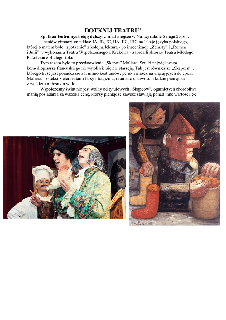 DOTKNIJ TEATRU! Spotkań teatralnych ciąg dalszy… miał miejsce w Naszej szkole 5 maja 2016 r. Uczniów gimnazjum z klas: IA, IB, IC, IIA, IIC, IIIC na lekcję języka polskiego, której tematem było „spotkanie” z kolejną lekturą - po inscenizacji „Zemsty” i „Romea i Julii” w wykonaniu Teatru Współczesnego z Krakowa - zaprosili aktorzy Teatru Młodego Pokolenia z Białegostoku. Tym razem było to przedstawienie „Skąpca” Moliera. Sztuki największego komediopisarza francuskiego niewątpliwie się nie starzeją. Tak jest również ze „Skąpcem”, którego treść jest ponadczasowa, mimo kostiumów, peruk i masek nawiązujących do epoki Moliera. To tekst z elementami farsy i tragizmu, dramat o chciwości i kulcie pieniądza z wątkiem miłosnym w tle. Współczesny świat nie jest wolny od tytułowych „Skąpców”, ogarniętych chorobliwą manią posiadania za wszelką cenę, którzy pieniądze zawsze stawiają ponad inne wartości. ;-c