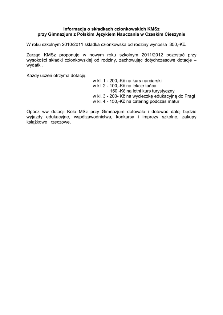 Informacja o składkach członkowskich KMSz przy Gimnazjum z Polskim Językiem Nauczania w Czeskim Cieszynie W roku szkolnym 2010/2011 składka członkowska od rodziny wynosiła 350,-Kč. Zarząd KMSz proponuje w nowym roku szkolnym 2011/2012 pozostać przy wysokości składki członkowskiej od rodziny, zachowując dotychczasowe dotacje – wydatki. Każdy uczeń otrzyma dotację: w kl. 1 - 200,-Kč na kurs narciarski w kl. 2 - 100,-Kč na lekcje tańca 150,-Kč na letni kurs turystyczny w kl. 3 - 200- Kč na wycieczkę edukacyjną do Pragi w kl. 4 - 150,-Kč na catering podczas matur Opócz ww dotacji Koło MSz przy Gimnazjum dotowało i dotować dalej będzie wyjazdy edukacyjne, współzawodnictwa, konkursy i imprezy szkolne, zakupy książkowe i rzeczowe.