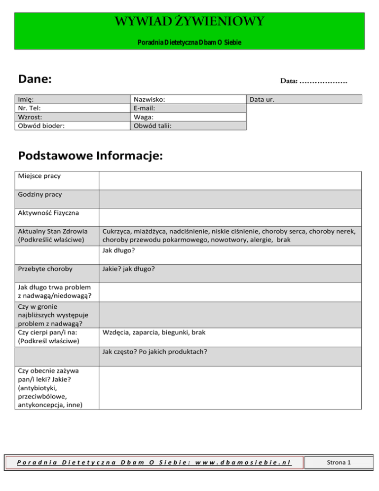 Poradnia Dietetyczna Dbam O Siebie Dane: Imię: Nr. Tel: Wzrost: Obwód bioder: Nazwisko: E-mail: Waga: Obwód talii: Data ur. Podstawowe Informacje: Miejsce pracy Godziny pracy Aktywność Fizyczna Aktualny Stan Zdrowia (Podkreślić właściwe) Cukrzyca, miażdżyca, nadciśnienie, niskie ciśnienie, choroby serca, choroby nerek, choroby przewodu pokarmowego, nowotwory, alergie, brak Jak długo? Przebyte choroby Jakie? jak długo? Jak długo trwa problem z nadwagą/niedowagą? Czy w gronie najbliższych występuje problem z nadwagą? Czy cierpi pan/i na: (Podkreśl właściwe) Wzdęcia, zaparcia, biegunki, brak Jak często? Po jakich produktach? Czy obecnie zażywa pan/i leki? Jakie? (antybiotyki, przeciwbólowe, antykoncepcja, inne) Poradnia Dietetyczna Dbam O Siebie: www.dbamosiebie.nl Strona 1 Jaki jest pana/i cel? Ile by pan/i chciał/a ważyć? Kompozycja posiłków: Ile posiłków jada pan/i w ciągu dnia? Z jakich produktów składa się pana/i śniadanie? Z jakich produktów składa się pana/i obiad? Z jakich produktów składa się pana/i kolacja? Czy podjada pan/i między posiłkami? Co pan/i podjada? Czy zwraca pan/i uwagę na kaloryczność i wartości odżywcze produktów? Produkty lubiane/nielubiane Wstawić ( X ) w odpowiedniej kolumnie Mleko Mleko kokosowe Mleko migdałowe Mleko sojowe Jogurt owocowy Jogurt naturalny Kefir Maślanka Śmietana Majonez Ser żółty Ser Tofu Ser Twarogowy Serek Wiejski Inny ser/jaki? Lubię/Jem/ Nie jem ale mogę jeść Nie lubię/Nie chcę tego jeść Poradnia Dietetyczna Dbam O Siebie: www.dbamosiebie.nl Strona 2 Jaja Wieprzowina Wołowina Kurczak Indyk Cielęcina Wędlina Ryby: Jakie? Warzywa: Jakie? Owoce: Jakie? Pieczywo jasne Pieczywo ciemne Pieczywo pełnoziarniste Pieczywo typu wasa Pieczywo chrupkie Płatki Ryżowe Ryż biały Ryż basmati Ryż brązowy Makaron jasny Makaron razowy Kasz gryczana Kasza jaglana Kasza Kuskus Soczewica Płatki owsiane Płatki kukurydziane Otręby Ziemniaki Masło Margaryna Olej słonecznikowy Olej rzepakowy Oliwa z oliwek Olej kokosowy Awokado Oliwki Cukier Poradnia Dietetyczna Dbam O Siebie: www.dbamosiebie.nl Strona 3 Orzechy włoskie Orzechy laskowe Migdały Pistacje Inne orzechy: jakie? Bakalie Nasiona(np. nasiona lnu, pestki dyni)/ jakie? Miód, dżem Woda niegazowana Woda gazowana Pepsi, cola, fanta itp. Herbata Herbata zielona Herbata owocowa Kawa Soki warzywne Soki owocowe Inne napoje: Jakie? Słodycze (czekolada, cukierki, batoniki, żelki, inne) jakie? Jak często? Paluszki, chipsy, chrupki, krakersy, inne : Jakie? Jak często? Sól Pieprz Przyprawy ostre Przyprawy ziołowe Papierosy: ile dziennie? Alkohol: jaki ? jak często? Stosowane suplementy diety: Jakie? Poradnia Dietetyczna Dbam O Siebie: www.dbamosiebie.nl Strona 4 Dotychczas stosowane kuracje odchudzające Rodzaj Kiedy? Jak długo? Jaki ubytek wagi? Ile kilo wróciło? Dodatkowe Informacje Wypełnienia powyżej ankiety jest całkowicie fakultatywne, a pozyskane w niej informacje posłużą jedynie właściwemu dopasowaniu programu żywieniowego do preferencji klienta. Wypełniając i przesyłając niniejszą ankietę wyrażam zgodę na przetwarzanie moich danych osobowych przez Dbam o Siebie, w celu przygotowania diety zgodnie z moimi preferencjami żywieniowymi oraz potrzebami zdrowotnymi. Podstawę do przetwarzania danych osobowych zawartych w niniejszej deklaracji stanowią przepisy ustawy z dnia 29 sierpnia 1997 r. o ochronie danych osobowych (Dz. U. z 2002 r. Nr 101, poz. 926 ze zm.). Zgoda na przetwarzanie moich danych obejmuje także przetwarzanie tych danych w przyszłości, o ile nie zmieni się cel ich przetwarzania. Oświadczam, że zostałem/am poinformowany/a o prawie wglądu do moich danych osobowych oraz do ich poprawiania. Oświadczam, że podane dane w niniejszej deklaracji są kompletne i prawdziwe. Podpis: Dbam O Siebie www.dbamosiebie.nl Tel. +31 684 522 853 E-mail. [email protected] Poradnia Dietetyczna Dbam O Siebie: www.dbamosiebie.nl Strona 5