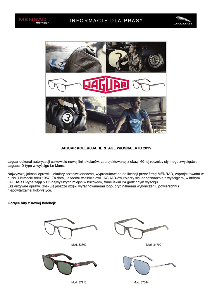 JAGUAR KOLEKCJA HERITAGE WIOSNA/LATO 2015 Jaguar dokonał autoryzacji całkowicie nowej linii okularów, zaprojektowanej z okazji 60-tej rocznicy słynnego zwycięstwa Jaguara D-type w wyścigu Le Mans. Najwyższej jakości oprawki i okulary przeciwsłoneczne, wyprodukowane na licencji przez firmę MENRAD, zaprojektowano w duchu i klimacie roku 1957. Ta data, każdemu wielbicielowi JAGUAR-ów kojarzy się jednoznacznie z wyścigiem, w którym JAGUAR D-type zajął 5 z 6 najwyższych miejsc w kultowym, francuskim 24 godzinnym wyścigu. Ekskluzywne oprawki zyskują jeszcze dzięki wyrafinowanemu logo, oryginalnemu wykończeniu powierzchni i niepowtarzalnej kolorystyce. Gorące hity z nowej kolekcji: Mod. 33700 Mod. 37116 Mod. 31700 Mod. 37344 Przecierane (Mod. 33700) W stylu casual: męskie oprawki JAGUAR wykonane z metalu, z matowymi, przecieranymi frontami. Dostępne w czterech wersjach kolorystycznych: brązowe (kol. 1002), niebieskie (kol. 1004), szare (kol. 1000) i antracytowe (kol. 1001). Klasyka z elementem zaskoczenia (Mod. 31700) Ukłon w stronę stylu retro: oprawka JAGUAR ze szczotkowana powierzchnią frontu, ozdobioną delikatnymi nitami. Dostępne w trzech wersjach kolorystycznych: szczotkowane brązowe (kol. 6471), brązowe z niebieskim (kol. 6604), czarne z czerwonym (kol. 6852). Letni niezbędnik (Mod. 37116) For cool guys: przeciwsłoneczne okulary w stylu retro, z ozdobnymi nitami i historycznym logo JAGUAR na programowo szerokich zausznikach. Dostępne w trzech wersjach kolorystycznych: czarne z błękitnymi soczewkami (kol. 8840), brązowe (kol. 8940) i czarne z soczewkami CR39 (kol. 6100). Odcienie błękitu (Mod. 37344) Nierozłączna para: przeciwsłoneczne awiatorki z ciemnoniebieskimi frontami i niebieskimi szkłami – niezastąpiony dodatek na letnie dni. Dostępne w trzech kombinacjach kolorystycznych: niebieskie ze srebrem (kol. 310), brązowe ze zlotem (kol. 600), czarne z antracytem (kol. 610). Wszystkie oprawki dostępne są w naszym sklepie: www.menrad.com JAGUAR: „Jaguar to coś więcej niż tylko doskonała maszyna. To istota, tak samo żywa, jak człowiek siedzący za kierownicą. Konstruowanie i budowa samochodu to proces przypominający powołanie do życia żywej istoty” - mówią w ostatniej kampanii reklamowej samochodu JAGUAR. Założona w 1922 roku i znana obecnie na całym świecie marka, cieszy się zasłużoną sławą twórcy wyjątkowego, wyrafinowanego i luksusowego samochodu dla najbardziej wymagających klientów. Przez 75 lat ich samochody, zarówno te klasy premium jak i sportowe, uzyskiwały oszałamiające osiągi, kusiły luksusem, zapewniały niezwykłe i ekscytujące doznania z jazdy. Doznania, jakich dostarczyć może, tylko prowadzenie samochodu JAGUAR. www.jaguar.com MENRAD the vision: Menrad the vision - firma rodzinna znajdująca się obecnie w rękach czwartego pokolenia rodziny, zajmuje się sprzedażą oprawek korekcyjnych i okularów przeciwsłonecznych od ponad 100 lat. Firma zarządzana obecnie przez braci Hermana and Eberharda Müller-Menrad, ma swoją siedzibę w Niemczech i zatrudnia ponad 1000 pracowników na całym świecie. Swoje oprawki korekcyjne i okulary przeciwsłoneczne sprzedaje w ponad 100 krajach świata. Główne marki w portfelu firmy Menrad to: MENRAD, DAVIDOFF, JOOP!, JAGUAR i MORGAN. Sieć dystrybucji firmy Menrad the vision obejmuje jedenaście filii firmy w: Niemczech, Austrii, Szwajcarii, Francji, Wielkiej Brytanii/Irlandii, Holandii, Polsce, we Włoszech, Turcji, Chinach i na Bliskim Wschodzie. Sprzedaż w innych krajach realizowana jest przez znajdujący się w Niemczech departament eksportu. Marki GANT, GUESS i HACKETT, REVO, SPINE i SUPERDRY dystrybuowane są w wielu krajach w Europie. www.menrad.com Kontakt: Menrad Polska Sp.z o.o ul. Transportowców 11, 02-858 Warszawa; telefon: (22) 259 88 80 fax: (22) 250 88 81; e-mail: [email protected]; internet: www.menrad.pl _______________________________________________________________________________________________________________