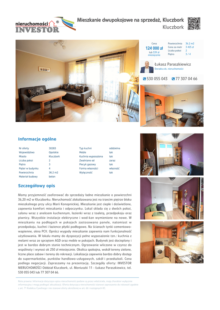 Mieszkanie dwupokojowe na sprzedaż, Kluczbork Kluczbork Cena 124 000 zł lub 539 zł miesięcznie Powierzchnia Cena za metr Liczba pokoi Piętro 36.2 m2 3 425 zł 2 3/4 Łukasz Paraszkiewicz Doradca ds. nieruchomości 530 055 043 Informacje ogólne Nr oferty 30283 Typ kuchni oddzielna Województwo Opolskie Meble tak Miasto Kluczbork Kuchnia wyposażona tak Liczba pokoi 2 Zwalniane od zaraz Piętro 3 Piecyk gazowy tak Pięter w budynku 4 Forma własności własność Powierzchnia 36.2 m2 Wyłączność tak Materiał budowy beton Szczegółowy opis Mamy przyjemność zaoferować do sprzedaży ładne mieszkanie o powierzchni 36,20 m2 w Kluczborku. Nieruchomość zlokalizowana jest na trzecim piętrze bloku mieszkalnego przy ulicy Marii Konopnickiej. Mieszkanie jest ciepłe i doświetlone, zapewnia komfort mieszkania i odpoczynku. Lokal składa się z dwóch pokoi, salonu wraz z aneksem kuchennym, łazienki wraz z toaletą, przedpokoju oraz piwnicy. Wszystkie instalacje elektryczne i wod-kan wymienione na nowe. W mieszkaniu na podłogach w pokojach zastosowano panele, natomiast w przedpokoju, kuchni i łazience płytki podłogowe. Na ścianach tynki cementowowapienne, okna PCV. Oprócz wygody mieszkanie zapewnia nam funkcjonalność użytkowania. W lokalu mamy do dyspozycji pełne wyposażenie tzn.: kuchnia z melami wraz ze sprzętem AGD oraz meble w pokojach. Budynek jest docieplony i jest w bardzo dobrym stanie technicznym. Ogrzewanie wliczone w czynsz do wspólnoty i wynosi ok 250 zł miesięcznie. Okolica spokojna, wokół tereny zielone, liczne place zabaw i tereny do rekreacji. Lokalizacja zapewnia bardzo dobry dostęp do supermarketów, punktów handlowo-usługowych, szkół i przedszkoli. Cena podlega negocjacji. Zapraszamy na prezentację. Szczegóły oferty: INVESTOR NIERUCHOMOŚCI Oddział Kluczbork, ul. Moniuszki 11 - Łukasz Paraszkiewicz, tel. 530 055 043 lub 77 307 04 66. Nota prawna: Informacje dotyczące opisu nieruchomości podane są przez właściciela, mają charakter wyłącznie informacyjny i mogą podlegać aktualizacji. Oferta dotycząca nieruchomości stanowi zaproszenie do rokowań zgodnie z art. 71 Kodeksu Cywilnego i nie stanowi oferty określonej w art. 66 i następnych KC. 77 307 04 66 Oddział Kluczbork, ul. Moniuszki 11 , 46-200 Kluczbork 77 400 01 76 • [email protected] • www.investor.net.pl 2017-03-04 01:34:25 Strona 1 z 1