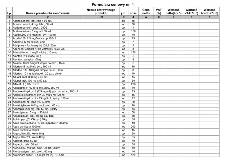 Formularz cenowy nr 1 Lp. 1 1 2 3 4 5 6 7 8 9 10 11 12 13 14 15 16 17 18 19 20 21 22 23 24 25 26 27 28 29 30 31 32 33 34 35 36 37 38 39 Nazwa przedmiotu zamówienia 2 Acenocumarol tabl.1mg x 60 szt. Acenocumarol, 4 mg, tabl., 60 szt Acidum boricum subst. 250G Acidum folicum 5 mg tabl.30 szt. Acodin.300 (15 mg/5 ml) syr. 100 ml Acodin150 7,5 mg/5ml syrop 100ml Addamel N 10 ml x 20 amp Addiphos – fosforany inj.10fiol .20ml Adenocor 3mg/ml r-r do wstrzyk.6 fiolek 2ml Adrenaliinum, 1 mg/1 ml, inj., 10 amp Alantan 2% maść, 30 g Alantan ,zasypka 100 g Alcaine 0,5% 5mg/ml krople do oczu, 15 ml Allertec (5 mg/5ml), syr., 100 ml Allertec, 1%, 10mg/ml, krople doust., 10ml Allertec, 10 mg, tabl.powl., 20 szt., blister Allupol tabl. 300 mg x 30 szt. Allupol tabl. 100 mg x 50 szt. Altacet, 1 g tabl. 6 szt. Alugastrin, (1,02 g/15 ml), zaw. 250 ml Ambroxoli hydrochl. (7,5 mg/ml), płyn do inhal., 100 ml Ambroxoli hydrochl. syr. 30 mg/5 ml 120 ml Ambroxoli hydrochlor.15mg/5ml , syrop, 150 ml Aminosteril N-Hepa 8%, 500ml Amitriptylinum, 0,01g, tabl.powl., 60 szt. Amizepin, 200 mg, tab, 50 szt. Blistry Amlodipinum 5 mg x 30 tabl. Amlodipinum, tabl. 10 mg x30 tabl. Aphtin płyn,(C. Olsztyn) 10 g Aqua pro injectione, 10 ml, inj(poliet) 100 amp. Aqua purificata 1000ml Aqua purificata 250ml Argosuflan 2%, krem 40 g Argosuflan 2%, krem 400g Ascofer, draż 50 szt Aspargin, tab. 50 szt Atenolol 50 mg tab. powl. 30 szt. Blistry Atorvastatyna tabl. powl., 40 mg Atropinum sulfur., 0,5 mg/1 ml, inj., 10 amp Nazwa oferowanego produktu (2) j.m. ilość 3 op op op. op. op. op. op. op. op op op. op. op. op op. op op op. op. op. op. op. op op. op. op. op op. op. op. op op op. op. op. op. op. op op 4 15 30 1 150 10 15 7 5 3 120 5 6 6 10 6 40 15 50 200 10 15 15 12 30 10 15 50 50 80 10 200 15 60 35 40 50 10 40 120 Cena netto VAT (%) Wartość netto(4 x 5) 5 6 7 Wartość Wartość VAT(7x 6) brutto (7+ 8) 8 9 40 41 42 43 44 45 46 47 48 49 50 51 52 53 54 55 56 57 58 59 60 61 62 63 64 65 66 67 68 69 70 71 72 73 74 75 76 77 78 79 80 81 82 83 Atropinum sulfur., 1 mg/1 ml, inj., 10 amp Atrovent N (20 mcg/dawkę) aer, wziewny, 200 daw.,10 ml Atrovent płyn do inhal. 20 ml (0,25mg/ml) Avedol, tabl. powl 12,5mg x30 Avedol, tabl. powl 6,25mg x30 Baneocin maść 20 g Barium Sulfur płyn 200g x 1op Bebilon Pepti 1, prosz. modyfik. Mleko 450 g Berodual, roztw., do inhalacji, imp 20ml Berotec N,(100 mcg/dawkę), aer. imp, 200 daw, 10 ml Betadine płyn 10% 30 ml, roztwór na skórę Betahistini dihydrochl. 24 mg tabl 60 szt Betahistini dihydrochlo. 16 mg x 60 tabl Betaloc ZOK 25 tabl.o przed.uwaln.23,75 mg x28 Betaloc ZOK 50 tabl.o przed.uwal.47,50 mg x 28 Betaloc, 5 mg/5 ml, inj. doz., 5 amp Biodacyna 500 mg 1 fiolka Biofazolin 1 g 1 fiol. Biofuroksym 1,5 g 1 fiol., Biofuroksym 750mg 1fiol. Biosotal 40, 40 mg, tabl., 60 szt. Biosotal 80, 80 mg, tabl., 30 szt Biotrakson 1 g x 1 fiol Biotum 1 g x fiolka Bisacodyl, 10 mg.czop.doodbyt., 5 szt Bisacodyl, 5 mg, tabl powl. 30 szt. Biseptol 480 mg/5 ml x 10amp Biseptol 480 tabl. X 20 szt Biseptol(240 mg/ 5 ml) zaw., doustna 100 ml Bisocard 10mg, tabl.(2x30 szt) Bisocard 5mg, tabl. 60 szt Bromergon, 2.5 mg., tabl. 30 szt Bupivacainum h/chlor 0.5%, 20 ml, inj., 5 fiol Buscolysin, inj, 20mg /1ml, 10 amp Butapirazol 5% maść 30g, tuba Butapirazol, 250 mg,czop., 5 szt Calcium lactogluconas tab mus..x 16 Calcium, syr., smak pomarańczowy, 150 ml Captopril 12,5 mg tabl. 30 szt. Captopril 25 mg tabl. 30 szt. Carbo Medicinalis, 300 mg., tabl.,(PRz) 20 szt Cavinton, 10 mg/2 ml, inj., 10 amp Cebion krople100mg/ml 30ml Celestone 4 mg/ 1 ml, inj., 1 amp op op. op. op op. op. op. op. op op. op. op. op. op. op. op. szt szt szt szt. op. op. szt szt op. op. op op op. op op op. op. op op op. op. op. op op op. op. op op. 120 10 5 50 60 5 30 5 6 10 10 20 25 100 150 10 1000 1500 2500 300 5 10 200 150 30 20 35 60 12 12 60 10 6 10 5 100 50 30 40 15 30 50 5 100 84 85 86 87 88 89 90 91 92 93 94 95 96 97 98 99 100 101 102 103 104 105 106 107 108 109 110 111 112 113 114 115 116 117 118 119 120 121 122 123 124 125 126 Cerutin, tab. Powl., 125 szt., blistry Chlorchinaldin, 2 mg., tab. Do ssania, 20 szt Chlorek etylu, aer. 70 g Chlorheksydyna płyn 0,5l Chlorsuccilin, 20 mg, inj., 10 fiol (liof) Cilan tabl.powlekane 1mg x 30 Cilan tabletki powlekane, 5 mg, 30 szt Cinnaarizinum 25 mg, tabl, 50 szt. Cipronex 2mg/ml 100ml Cipronex 2mg/ml 200ml Cipronex 500mg tabl x 10 szt Clemastinum, (0.5 mg/5 ml) syr., 100 ml Clemastinum, 1 mg, tabl., 30 szt. Clemastinum, 2mg/ 2ml, inj.4ml x, 5 amp, Clindamacin MIP 300 mg, tabl. powl. 16 szt Clindamacin MIP 600 mg, tabl. powl, 12szt Clindamycin inj. 300mg / 2ml x5 amp a4ml Clopidogrel 75mg x 28 tabl Clotrimazol 100 mg. tabl. dopochw.),6 szt Clotrimazolum 1% krem , 20 mg Cocarboxylasum, 50 mg, inj, 5 amp.(ss)+roz Colchicum Dispert draż. 0,5 mg20 draż. Controloc 20mg x100 tabl., dojelit. Controloc 40mg x100 tabl., dojelit. Cordarone, 150 mg/3 ml, inj.doz, 6 amp. Corhydron 100 mg/2ml inj doz. 5 fiolek + rozp. Corhydron 25 mg/1ml inj doz. 5 fiolek + rozp. Crotamiton, 10%, maść,40 g Cutivate krem 15 g Cyclonamine, 250 mg, tabl., 30 szt Cyclonamine, inj. 12,5% , 250mg/2ml, inj., 50 amp Cytotec 0,2mg x42 tabl Czopki glicerynowe, 1 g, 10 szt Delacet płyn 100ml Devikap płyn15000 j.m./ml krople 10ml Dexaven, 4 mg/1 ml, inj., 10 amp Dexaven, 8 mg/2 ml, inj., 10 amp Diclac inj.im roztwór 75mg/3ml x 10amp. Dicortineff, zaw., do oczu i uszu, 5 ml Digoxin 0,1 mg 30 szt Digoxin, 0,25 mg, tabl., 30 szt. Digoxin, 0,5 mg/2 ml, inj., 5 amp Diosminex 500mg x 60 tabl op. op. op. op. op. op op op op. op. op op op op op. op. op. op. op. op. op. op. op op op. op. op. op. op op. op. op op. op op op. op. op op op. op op op 200 15 5 3 48 40 30 10 1600 400 220 5 60 160 10 20 20 30 70 50 40 20 25 25 40 900 100 5 5 60 40 4 15 3 5 40 350 30 100 30 20 20 50 127 128 129 130 131 132 133 134 135 136 137 138 139 140 141 142 143 144 145 146 147 148 149 150 151 152 153 154 155 156 157 158 159 160 161 162 163 164 165 16