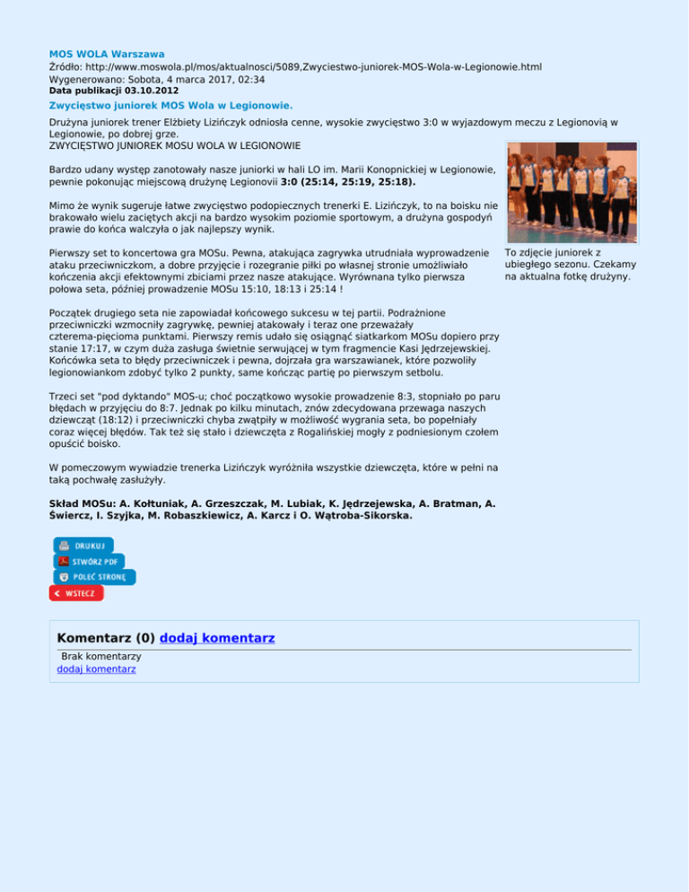 MOS WOLA Warszawa Źródło: http://www.moswola.pl/mos/aktualnosci/5089,Zwyciestwo-juniorek-MOS-Wola-w-Legionowie.html Wygenerowano: Sobota, 4 marca 2017, 02:34 Data publikacji 03.10.2012 Zwycięstwo juniorek MOS Wola w Legionowie. Drużyna juniorek trener Elżbiety Lizińczyk odniosła cenne, wysokie zwycięstwo 3:0 w wyjazdowym meczu z Legionovią w Legionowie, po dobrej grze. ZWYCIĘSTWO JUNIOREK MOSU WOLA W LEGIONOWIE Bardzo udany występ zanotowały nasze juniorki w hali LO im. Marii Konopnickiej w Legionowie, pewnie pokonując miejscową drużynę Legionovii 3:0 (25:14, 25:19, 25:18). Mimo że wynik sugeruje łatwe zwycięstwo podopiecznych trenerki E. Lizińczyk, to na boisku nie brakowało wielu zaciętych akcji na bardzo wysokim poziomie sportowym, a drużyna gospodyń prawie do końca walczyła o jak najlepszy wynik. Pierwszy set to koncertowa gra MOSu. Pewna, atakująca zagrywka utrudniała wyprowadzenie ataku przeciwniczkom, a dobre przyjęcie i rozegranie piłki po własnej stronie umożliwiało kończenia akcji efektownymi zbiciami przez nasze atakujące. Wyrównana tylko pierwsza połowa seta, później prowadzenie MOSu 15:10, 18:13 i 25:14 ! Początek drugiego seta nie zapowiadał końcowego sukcesu w tej partii. Podrażnione przeciwniczki wzmocniły zagrywkę, pewniej atakowały i teraz one przeważały czterema-pięcioma punktami. Pierwszy remis udało się osiągnąć siatkarkom MOSu dopiero przy stanie 17:17, w czym duża zasługa świetnie serwującej w tym fragmencie Kasi Jędrzejewskiej. Końcówka seta to błędy przeciwniczek i pewna, dojrzała gra warszawianek, które pozwoliły legionowiankom zdobyć tylko 2 punkty, same kończąc partię po pierwszym setbolu. Trzeci set "pod dyktando" MOS-u; choć początkowo wysokie prowadzenie 8:3, stopniało po paru błędach w przyjęciu do 8:7. Jednak po kilku minutach, znów zdecydowana przewaga naszych dziewcząt (18:12) i przeciwniczki chyba zwątpiły w możliwość wygrania seta, bo popełniały coraz więcej błędów. Tak też się stało i dziewczęta z Rogalińskiej mogły z podniesionym czołem opuścić boisko. W pomeczowym wywiadzie trenerka Lizińczyk wyróżniła wszystkie dziewczęta, które w pełni na taką pochwałę zasłużyły. Skład MOSu: A. Kołtuniak, A. Grzeszczak, M. Lubiak, K. Jędrzejewska, A. Bratman, A. Świercz, I. Szyjka, M. Robaszkiewicz, A. Karcz i O. Wątroba-Sikorska. Komentarz (0) dodaj komentarz Brak komentarzy dodaj komentarz To zdjęcie juniorek z ubiegłego sezonu. Czekamy na aktualna fotkę drużyny.