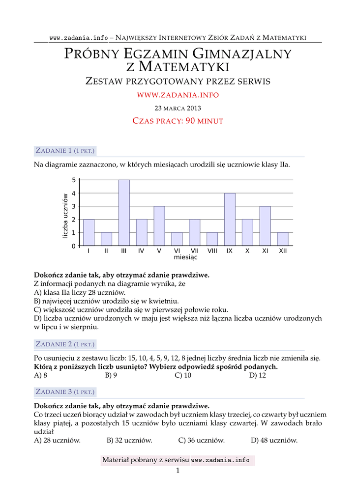 www.zadania.info – N AJWI EKSZY ˛ I NTERNETOWY Z BIÓR Z ADA Ń Z M ATEMATYKI P RÓBNY E GZAMIN G IMNAZJALNY Z M ATEMATYKI Z ESTAW PRZYGOTOWANY PRZEZ SERWIS WWW. ZADANIA . INFO 23 MARCA 2013 C ZAS PRACY: 90 MINUT Z ADANIE 1 (1 PKT.) Na diagramie zaznaczono, w których miesiacach ˛ urodzili si˛e uczniowie klasy IIa. liczba uczniów 5 4 3 2 1 0 I II III IV V VI VII miesiąc VIII IX X XI XII Dokończ zdanie tak, aby otrzymać zdanie prawdziwe. Z informacji podanych na diagramie wynika, że A) klasa IIa liczy 28 uczniów. B) najwi˛ecej uczniów urodziło si˛e w kwietniu. C) wi˛ekszość uczniów urodziła si˛e w pierwszej połowie roku. D) liczba uczniów urodzonych w maju jest wi˛eksza niż łaczna ˛ liczba uczniów urodzonych w lipcu i w sierpniu. Z ADANIE 2 (1 PKT.) Po usuni˛eciu z zestawu liczb: 15, 10, 4, 5, 9, 12, 8 jednej liczby średnia liczb nie zmieniła si˛e. Która˛ z poniższych liczb usuni˛eto? Wybierz odpowiedź spośród podanych. A) 8 B) 9 C) 10 D) 12 Z ADANIE 3 (1 PKT.) Dokończ zdanie tak, aby otrzymać zdanie prawdziwe. Co trzeci uczeń bioracy ˛ udział w zawodach był uczniem klasy trzeciej, co czwarty był uczniem klasy piatej, ˛ a pozostałych 15 uczniów było uczniami klasy czwartej. W zawodach brało udział A) 28 uczniów. B) 32 uczniów. C) 36 uczniów. D) 48 uczniów. Materiał pobrany z serwisu www.zadania.info 1 www.zadania.info – N AJWI EKSZY ˛ I NTERNETOWY Z BIÓR Z ADA Ń Z M ATEMATYKI Informacja do zadań 4 i 5 W sobot˛e Patrycja wyruszyła z Ptasiej Doliny na górski spacer, w trakcie którego odwiedziła kolejno dwa pobliskie szczyty: Kacza˛ Gór˛e i Łab˛ ˛ edzia˛ Gór˛e. Na schematycznej mapce przedstawiono drog˛e jaka˛ pokonała Patrycja, a na wykresie – jak zmieniała si˛e w trakcie spaceru jej wzgl˛edna wysokość (w metrach) mierzona od poziomu Ptasiej Doliny. 200 :0 0 12 :0 0 13 :0 0 14 :0 0 15 :0 0 16 :0 0 17 :0 0 :0 0 godzina 11 8: 00 100 00 Łabędzia Góra 300 10 Ptasia Dolina 400 9: Kacza Góra wysokość od poziomu Ptasiej Doliny (w metrach) 500 Z ADANIE 4 (1 PKT.) Jaka jest różnica wysokości mi˛edzy Łab˛edzia˛ Góra,˛ a Kacza˛ Góra? ˛ Wybierz odpowiedź spośród podanych. A) 50 m B) 100 m C) 150 m D) 400 m Z ADANIE 5 (2 PKT.) Oceń prawdziwość podanych zdań. Wybierz P, jeśli zdanie jest prawdziwe, lub F – jeśli jest fałszywe. Na każdym ze szczytów Patrycja zrobiła godzinna˛ przerw˛e. Od momentu zejścia z Kaczej Góry do momentu wejścia na Łab˛ ˛ edzia˛ Gór˛e upłyn˛eły 4 godziny. Patrycja wróciła do punktu wyjścia po 9 godzinach. W ciagu ˛ przedostatniej godziny spaceru Patrycja zeszła w dół o 100 metrów. P F P F P P F F Z ADANIE 6 (1 PKT.) W pudełku znajduje si˛e 18 losów, wśród których sa˛ 2 losy wygrywajace. ˛ Oceń prawdziwość podanych zdań. Wybierz P, jeśli zdanie jest prawdziwe, lub F – jeśli jest fałszywe. Prawdopodobieństwo wyciagni˛ ˛ ecia losu przegrywajacego ˛ jest dziewi˛eciokrotnie wi˛eksze, niż wyciagni˛ ˛ ecia losu wygrywajacego. ˛ Jeżeli do pudełka włożymy dwa losy wygrywajace ˛ to prawdopodobieństwo wygranej wzrośnie o 100%. Materiał pobrany z serwisu www.zadania.info 2 P F P F www.zadania.info – N AJWI EKSZY ˛ I NTERNETOWY Z BIÓR Z ADA Ń Z M ATEMATYKI Z ADANIE 7 (1 PKT.) Dokończ zdanie tak, aby otrzymać zdanie prawdziwe. Cena ksia˛żki po podwyżce o 20% wynosi 84 zł. Cena tej ksia˛żki przed podwyżka˛ była równa A) 70 zł. B) 56 zł. C) 67,20 zł. D) 82,35 zł. Z ADANIE 8 (1 PKT.) Samolot pasażerski spala średnio 10 ton paliwa w ciagu ˛ godziny lotu. Oceń prawdziwość podanych zdań. Wybierz P, jeśli zdanie jest prawdziwe, lub F – jeśli jest fałszywe. W ciagu ˛ minuty lotu samolot spala ponad 200 kg paliwa. Spalenie przez samolot 1800 kg paliwa trwa krócej niż 12 minut. P P F F Z ADANIE 9 (1 PKT.) Korzystajac ˛ z tego, że (97)3 = 912673, wskaż wartość liczby Zaznacz dobra˛ odpowiedź. A) 0,0097 B) 0,097 C) 0,97 √ 3 0, 912673. D) 9,7 Z ADANIE 10 (1 PKT.) Do okr˛egu o środku O należa˛ punkty A i B. Okrag ˛ ma promień 48, a łuk AB ma długość 40π. A O B Jaka˛ miar˛e ma kat ˛ środkowy oparty na tym łuku? Wybierz odpowiedź spośród podanych. A) 72◦ B) 120◦ C) 150◦ D) 240◦ Informacja do zadań 11 – 13 Marcel narysował prostokat ˛ położony w układzie współrz˛ednych tak jak na pierwszym rysunku. Kolejne przystajace ˛ do niego prostokaty ˛ rysował w taki sposób, że kolejny rysowany prostokat ˛ był obrócony o 90◦ oraz lewy dolny wierzchołek tego prostokata ˛ był prawym górnym wierzchołkiem poprzedniego prostokata ˛ (rysunek 2.). Materiał pobrany z serwisu www.zadania.info 3 www.zadania.info – N AJWI EKSZY ˛ I NTERNETOWY Z BIÓR Z ADA Ń Z M ATEMATYKI y y 1 1 x 1 x 1 Rysunek 1. Rysunek 2. Z ADANIE 11 (1 PKT.) Dokończ zdanie tak, aby otrzymać zdanie prawdziwe. Marcel narysował w ten sposób pi˛eć prostokatów. ˛ Współrz˛edna x prawego górnego wierzchołka piatego ˛ prostokata ˛ jest równa A) 11 B) 10 C) 9 D) 8 Z ADANIE 12 (1 PKT.) Oceń prawdziwość podanych zdań. Wybierz P, jeśli zdanie jest prawdziwe, lub F – jeśli jest fałszywe. Jeżeli punkt ( x, y) jest prawym górnym wierzchołkiem 20 prostokata ˛ to x=y x = 80 P P F F Z ADANIE 13 (1 PKT.) Dokończ zdanie tak, aby otrzymać zdanie prawdziwe. Współrz˛edne prawego górnego wierzchołka 39 prostokata ˛ sa˛ równe ( a, b). Współrz˛edne prawego górnego wierzchołka kolejnego prostokata ˛ sa˛ równe A) ( a + 3, b + 1) B) ( a + 1, b + 3) C) ( a + 4, b + 2) D) ( a + 2, b + 4) Z ADANIE 14 (1 PKT.) Dany jest trapez prostokatny ˛ ABCD, w którym trójkat ˛ ABC jest trójkatem ˛ równobocznym o boku długości 6 cm. D C B A Oceń prawdziwość podanych zdań. Wybierz P, jeśli zdanie jest prawdziwe, lub F – jeśli jest fałszywe. |CD | = 4 cm √ | AD | = 3 3 cm P P F F Materiał pobrany z serwisu www.zadania.info 4 www.zadania.info – N AJWI EKSZY ˛ I NT