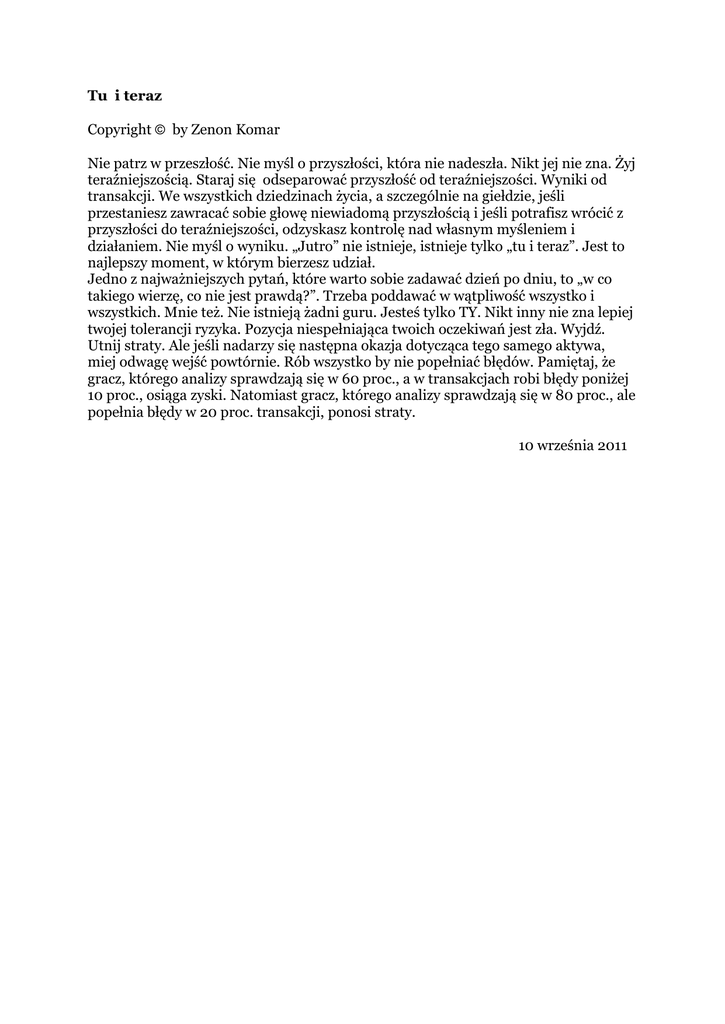 Tu i teraz Copyright © by Zenon Komar Nie patrz w przeszłość. Nie myśl o przyszłości, która nie nadeszła. Nikt jej nie zna. Żyj teraźniejszością. Staraj się odseparować przyszłość od teraźniejszości. Wyniki od transakcji. We wszystkich dziedzinach życia, a szczególnie na giełdzie, jeśli przestaniesz zawracać sobie głowę niewiadomą przyszłością i jeśli potrafisz wrócić z przyszłości do teraźniejszości, odzyskasz kontrolę nad własnym myśleniem i działaniem. Nie myśl o wyniku. „Jutro” nie istnieje, istnieje tylko „tu i teraz”. Jest to najlepszy moment, w którym bierzesz udział. Jedno z najważniejszych pytań, które warto sobie zadawać dzień po dniu, to „w co takiego wierzę, co nie jest prawdą?”. Trzeba poddawać w wątpliwość wszystko i wszystkich. Mnie też. Nie istnieją żadni guru. Jesteś tylko TY. Nikt inny nie zna lepiej twojej tolerancji ryzyka. Pozycja niespełniająca twoich oczekiwań jest zła. Wyjdź. Utnij straty. Ale jeśli nadarzy się następna okazja dotycząca tego samego aktywa, miej odwagę wejść powtórnie. Rób wszystko by nie popełniać błędów. Pamiętaj, że gracz, którego analizy sprawdzają się w 60 proc., a w transakcjach robi błędy poniżej 10 proc., osiąga zyski. Natomiast gracz, którego analizy sprawdzają się w 80 proc., ale popełnia błędy w 20 proc. transakcji, ponosi straty. 10 września 2011