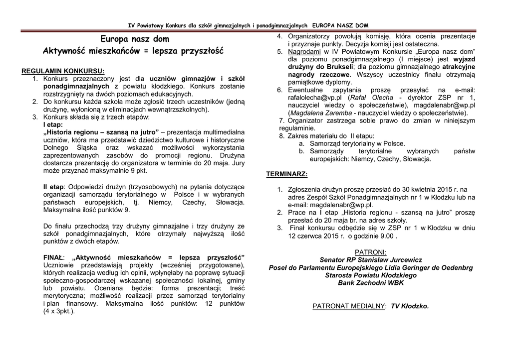 IV Powiatowy Konkurs dla szkół gimnazjalnych i ponadgimnazjalnych EUROPA NASZ DOM Europa nasz dom Aktywność mieszkańców = lepsza przyszłość REGULAMIN KONKURSU: 1. Konkurs przeznaczony jest dla uczniów gimnazjów i szkół ponadgimnazjalnych z powiatu kłodzkiego. Konkurs zostanie rozstrzygnięty na dwóch poziomach edukacyjnych. 2. Do konkursu każda szkoła może zgłosić trzech uczestników (jedną drużynę, wyłonioną w eliminacjach wewnątrzszkolnych). 3. Konkurs składa się z trzech etapów: I etap: „Historia regionu – szansą na jutro” – prezentacja multimedialna uczniów, która ma przedstawić dziedzictwo kulturowe i historyczne Dolnego Śląska oraz wskazać możliwości wykorzystania zaprezentowanych zasobów do promocji regionu. Drużyna dostarcza prezentację do organizatora w terminie do 20 maja. Jury może przyznać maksymalnie 9 pkt. II etap: Odpowiedzi drużyn (trzyosobowych) na pytania dotyczące organizacji samorządu terytorialnego w Polsce i w wybranych państwach europejskich, tj. Niemcy, Czechy, Słowacja. Maksymalna ilość punktów 9. Do finału przechodzą trzy drużyny gimnazjalne i trzy drużyny ze szkół ponadgimnazjalnych, które otrzymały najwyższą ilość punktów z dwóch etapów. FINAŁ: „Aktywność mieszkańców = lepsza przyszłość” Uczniowie przedstawiają projekty (wcześniej przygotowane), których realizacja według ich opinii, wpłynęłaby na poprawę sytuacji społeczno-gospodarczej wskazanej społeczności lokalnej, gminy lub powiatu. Oceniana będzie: forma prezentacji; treść merytoryczna; możliwość realizacji przez samorząd terytorialny i plan finansowy. Maksymalna ilość punktów: 12 punktów (4 x 3pkt.). 4. Organizatorzy powołują komisję, która ocenia prezentacje i przyznaje punkty. Decyzja komisji jest ostateczna. 5. Nagrodami w IV Powiatowym Konkursie „Europa nasz dom” dla poziomu ponadgimnazjalnego (I miejsce) jest wyjazd drużyny do Brukseli; dla poziomu gimnazjalnego atrakcyjne nagrody rzeczowe. Wszyscy uczestnicy finału otrzymają pamiątkowe dyplomy. 6. Ewentualne zapytania proszę przesyłać na e-mail: [email protected] (Rafał Olecha - dyrektor ZSP nr 1, nauczyciel wiedzy o społeczeństwie), [email protected] (Magdalena Zaremba - nauczyciel wiedzy o społeczeństwie). 7. Organizator zastrzega sobie prawo do zmian w niniejszym regulaminie. 8. Zakres materiału do II etapu: a. Samorząd terytorialny w Polsce. b. Samorządy terytorialne wybranych państw europejskich: Niemcy, Czechy, Słowacja. TERMINARZ: 1. Zgłoszenia drużyn proszę przesłać do 30 kwietnia 2015 r. na adres Zespół Szkół Ponadgimnazjalnych nr 1 w Kłodzku lub na e-mail: [email protected]. 2. Prace na I etap „Historia regionu - szansą na jutro” proszę przesłać do 20 maja br. na adres szkoły. 3. Finał konkursu odbędzie się w ZSP nr 1 w Kłodzku w dniu 12 czerwca 2015 r. o godzinie 9.00 . PATRONI: Senator RP Stanisław Jurcewicz Poseł do Parlamentu Europejskiego Lidia Geringer de Oedenbrg Starosta Powiatu Kłodzkiego Bank Zachodni WBK PATRONAT MEDIALNY: TV Kłodzko. IV Powiatowy Konkurs dla szkół gimnazjalnych i ponadgimnazjalnych EUROPA NASZ DOM IV KONKURS POWIATOWY EUROPA NASZ DOM Aktywność mieszkańców = lepsza przyszłość Organizator: Zespół Szkół Ponadgimnazjalnych nr 1 im. prof. Wacława Żenczykowskiego w Kłodzku ul. Bohaterów Getta 6, 57-300 Kłodzko