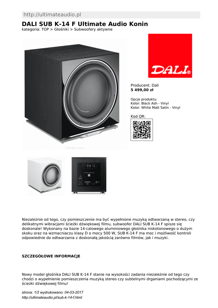 http://ultimateaudio.pl DALI SUB K-14 F Ultimate Audio Konin kategoria: TOP > Głośniki > Subwoofery aktywne Producent: Dali 5 499,00 zł Opcje produktu: Kolor: Black Ash - Vinyl Kolor: White Matt Satin - Vinyl Kod QR: Niezależnie od tego, czy pomieszczenie ma być wypełnione muzyką odtwarzaną w stereo, czy delikatnymi wibracjami ścieżki dźwiękowej filmu, subwoofer DALI SUB K-14 F spisze się doskonale! Wykonany na bazie 14-calowego aluminiowego głośnika niskotonowego o dużym skoku oraz na wzmacniaczu klasy D o mocy 500 W, SUB K-14 F ma moc i możliwość kontroli odpowiednie do odtwarzania z doskonałą jakością zarówno filmów, jak i muzyki. SZCZEGÓŁOWE INFORMACJE Nowy model głośnika DALI SUB K-14 F stanie na wysokości zadania niezależnie od tego czy chodzi o wypełnienie pomieszczenia muzyką stereo czy subtelnymi drganiami pochodzącymi ze ścieżki dźwiękowej filmu! strona: 1/2 wydrukowano: 04-03-2017 http://ultimateaudio.pl/sub-k-14-f.html Głośnik DALI SUB K-14 F zbudowano na bazie aluminiowego głośnika niskotonowego o dużej amplitudzie drgań o średnicy 14 cali oraz wzmacniacza klasy D o mocy 500 W, dzięki czemu ma on fantastyczną moc i kontrolę nad odtwarzaniem dźwięku filmowego i muzyki. Podłącz swój subwoofer do wzmacniacza za pomocą wejścia LFE lub line-out i przygotuj się, że efekt dosłownie wgniecie Cię w fotel. Komponenty głośnika SUB K-14 F Aluminiowy głośnik niskotonowy o dużej amplitudzie drgań i średnicy 14 cali Wzmacniacz klasy D o mocy 500 W Wytrzymała podstawa z aluminium Obudowa w kolorze białym lub czarnym Ścianka przednia biała o wysokim połysku lub czarna Linia produktowa SUBWOOFERY Zakres częstotliwości (+/-3 dB) [Hz] 29 - 160 Maks. SPL [dB] 115 Częstotliwość podziału [Hz] 40 - 120 Przetwornik niskotonowy 1 x 14" long stroke Low frequency driver, Diaphragm type Aluminiowy Typ obudowy Bass Reflex Strojenie bass-reflexu [Hz] 34 Maks. moc wzmacniacza [W RMS] 500 Ciągła moc wzmacniacza [W RMS] 450 Impedancja wejściowa [Ω] 10k Wejścia Mono (LFE) RCA Stereo (z filtrem dolnoprzepustowym) Ekranowanie magnetyczne No Rekomendowane umiejscowienie Podłogowy Funkcje Częstotliwość zwrotnicy Przełącznik fazy Tryb czuwania (Automatycznie) Włącz/Wyłącz Głośność (Gain) Maks. zużycie energii [W] 650 Maks. wymiary z podstawą i maskownicą (wys. x szer. x 429 x 396 x 428 gł.) [mm] Masa [kg] 26.4 Dołączone akcesoria Instrukcja obsługi Pilot Gwoździe z gwintem M8 strona: 2/2 wydrukowano: 04-03-2017 http://ultimateaudio.pl/sub-k-14-f.html