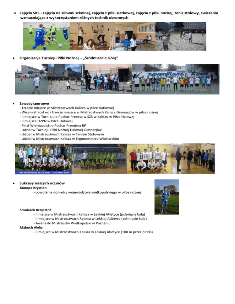 Zajęcia SKS - zajęcia na siłowni szkolnej, zajęcia z piłki siatkowej, zajęcia z piłki nożnej, tenis stołowy, ćwiczenia wzmacniające z wykorzystaniem różnych technik obronnych Organizacja Turnieju Piłki Nożnej – „Śródmieście Górą” Zawody sportowe - Trzecie miejsce w Mistrzostwach Kalisza w piłce siatkowej - Wicemistrzostwo i trzecie miejsce w Mistrzostwach Kalisza Gimnazjów w piłce nożnej - II miejsce w Turnieju o Puchar Prezesa w SZS w Kaliszu w Piłce Halowej - II miejsce OZPN w Piłce Halowej - Finał Wielkopolski o Puchar Premiera RP - Udział w Turnieju Piłki Nożnej Halowej Gimnazjów - Udział w Mistrzostwach Kalisza w Tenisie Stołowym - Udział w Mistrzostwach Kalisza w Ergonometrze Wioślarskim Sukcesy naszych uczniów Konopa Krystian - powołanie do kadry województwa wielkopolskiego w piłce nożnej Smolarek Krzysztof - I miejsce w Mistrzostwach Kalisza w Lekkiej Atletyce (pchnięcie kulą) - II miejsce w Mistrzostwach Rejonu w Lekkiej Atletyce (pchnięcie kulą) - Awans do Mistrzostw Wielkopolski w Poznaniu Makuch Aleks - II miejsce w Mistrzostwach Kalisza w Lekkiej Atletyce (100 m przez płotki) Promowanie uczniów aktywnie trenujących w kaliskich klubach sportowych i odnoszących sukcesy. - Piotr Secler kl.3b - rzut oszczepem(600m) - 37,77m - Anna Smolarek kl.2d - 60 m - 8.40s, 100 m - 13.98s - Krzysztof Smolarek - rzut dyskiem (1 kg) - 48.01m - Hubert Pietrasiak - kulturystyka – żelazny ciąg 105 kg - Michał Latosiński – wioślarstwo Zajęcia sportowe i ruchowe - darmowe zajęcia taneczne dla chętnych prowadzone przez trenerów z ODT (hip-hop i taniec współczesny)– 2 razy w tygodniu. - zajęcia sportowo-rekreacyjne na lodowisku (kl 1b, 1d, 2d, SKR „Ciasna Bike”) - gry i zabawy ruchowe w wodzie – wyjścia na basen (kl. 3a, 2a, 1a) - Mikołajkowy Turniej Piłki Siatkowej Dziewcząt - Zimowy Turniej Piłki Siatkowej Dziewcząt - Świąteczny Turniej Minipiłki Nożnej - zimowe zabawy na śniegu – śniegowe rzeźby (kl. 1c) - lekcje na ścince wspinaczkowej - piesze wyjścia do Schroniska dla Bezdomnych Zwierząt w Kaliszu