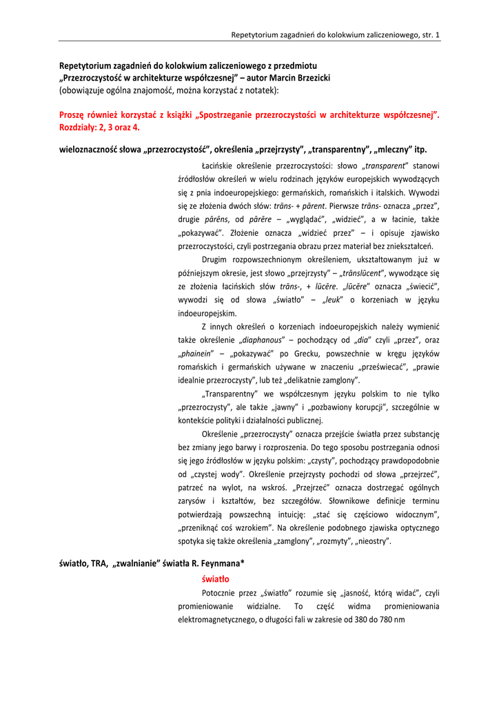 Repetytorium zagadnień do kolokwium zaliczeniowego, str. 1 Repetytorium zagadnień do kolokwium zaliczeniowego z przedmiotu „Przezroczystość w architekturze współczesnej” – autor Marcin Brzezicki (obowiązuje ogólna znajomość, można korzystać z notatek): Proszę również korzystać z książki „Spostrzeganie przezroczystości w architekturze współczesnej”. Rozdziały: 2, 3 oraz 4. wieloznaczność słowa „przezroczystość”, określenia „przejrzysty”, „transparentny”, „mleczny” itp. Łacińskie określenie przezroczystości: słowo „transparent” stanowi źródłosłów określeń w wielu rodzinach języków europejskich wywodzących się z pnia indoeuropejskiego: germańskich, romańskich i italskich. Wywodzi się ze złożenia dwóch słów: trāns- + pārent. Pierwsze trāns- oznacza „przez”, drugie pārēns, od pārēre – „wyglądać”, „widzieć”, a w łacinie, także „pokazywać”. Złożenie oznacza „widzieć przez” – i opisuje zjawisko przezroczystości, czyli postrzegania obrazu przez materiał bez zniekształceń. Drugim rozpowszechnionym określeniem, ukształtowanym już w późniejszym okresie, jest słowo „przejrzysty” – „trānslūcent”, wywodzące się ze złożenia łacińskich słów trāns-, + lūcēre. „lūcēre” oznacza „świecić”, wywodzi się od słowa „światło” – „leuk” o korzeniach w języku indoeuropejskim. Z innych określeń o korzeniach indoeuropejskich należy wymienić także określenie „diaphanous” – pochodzący od „dia” czyli „przez”, oraz „phainein” – „pokazywać” po Grecku, powszechnie w kręgu języków romańskich i germańskich używane w znaczeniu „przeświecać”, „prawie idealnie przezroczysty”, lub też „delikatnie zamglony”. „Transparentny” we współczesnym języku polskim to nie tylko „przezroczysty”, ale także „jawny” i „pozbawiony korupcji”, szczególnie w kontekście polityki i działalności publicznej. Określenie „przezroczysty” oznacza przejście światła przez substancję bez zmiany jego barwy i rozproszenia. Do tego sposobu postrzegania odnosi się jego źródłosłów w języku polskim: „czysty”, pochodzący prawdopodobnie od „czystej wody”. Określenie przejrzysty pochodzi od słowa „przejrzeć”, patrzeć na wylot, na wskroś. „Przejrzeć” oznacza dostrzegać ogólnych zarysów i kształtów, bez szczegółów. Słownikowe definicje terminu potwierdzają powszechną intuicję: „stać się częściowo widocznym”, „przeniknąć coś wzrokiem”. Na określenie podobnego zjawiska optycznego spotyka się także określenia „zamglony”, „rozmyty”, „nieostry”. światło, TRA, „zwalnianie” światła R. Feynmana* światło Potocznie przez „światło” rozumie się „jasność, którą widać”, czyli promieniowanie widzialne. To część widma promieniowania elektromagnetycznego, o długości fali w zakresie od 380 do 780 nm Repetytorium zagadnień do kolokwium zaliczeniowego, str. 2 Światło w każdym ośrodku rozchodzi się z inną prędkością, ale przy grubościach warstw – rzędu kilkunastu milimetrów – opóźnienia są niedostrzegalne. Jedną z analogii, której używa się do opisania sposobu przenikania promieniowania elektromagnetycznego przez materiał, jest porównanie fotonu do osoby, która „przeciska się przez gęsty tłum. Nawet jeśli porusza się w określonym tempie, zderzenia z innymi osobami są nieuniknione, i spowodują spowolnienie”. „zwalnianie” światła R. Feynmana* Prędkość światła jest stała w próżni, w powietrzu wynosi mniej więcej 8 8 8 2,90*10 m/s, w wodzie 2,24*10 m/s, a w szkle 1,97* 10 m/s Światło w światłowodzie podróżuje z prędkością 66% światła w próżni, ok. 200 tys. km/s. . TRA Każde ciało przepuszczające światło można scharakteryzować za pomocą trzech podstawowych współczynników: przepuszczania, odbicia i pochłaniania światła. Wielkości te określają podstawowe cechy optyczne ciała przezroczystego: T – współczynnik przepuszczania światła (transmitance) nazywany także transmitancją lub przepuszczalnością światła – określa, jaka część padającego strumienia światła zostaje przez ciało przepuszczona; R – współczynnik odbicia (reflectance) – określa, jaka część padającego strumienia światła zostaje odbita, czyli wypromieniowana wtórnie jako promieniowanie widzialne; A – współczynnik pochłaniania (absorbance) – określa, jaka część padającego strumienia światła zostaje pochłonięta przez ciało podczas przepuszczania. Część energii po zaabsorbowaniu powoduje wzrost energii wewnętrznej ciała, podnosi jego temperaturę. Światło (promieniowanie widzialne jest formą energii) może zostać w ciele również rozproszone, ale wtedy opuszcza to ciało w postaci wielokierunkowego strumienia i nie wpływa na bilans energii wewnętrznej. T+R+A = 1 model optyczny Ogólna relacja strumieni wyraża się w prostym stwierdzeniu: im mniej promieni przenika, tym więcej ulega odbiciu. Postrzeganie przezroczystości jest w równym stopniu zależne od wartości strumieni światła (natężenia światła) oddziałujących na taflę z dwóch stron, jak od wartości współczynników charakteryzujących materiał (T, R, oraz A). Przedstawienie tej zależności jest istotne dla praktyki architektonicznej. Strumień światła pochodzący z jasnego obiektu, którego Repetytorium zagadnień do kolokwium zaliczeniowego, str. 3 obraz pozorny zostanie utworzony w tafli zdominuje strumień światła przenikający przez taflę. To często występujące w praktyce zjawisko nie mogło być opisane przy wykorzystaniu narzędzi modelu Richardsa i Stevensa. Przy stałych parametrach (T, R, A) tafli postrzeganie jej jako przezroczystej będzie zależne od warunków oświetlenia (proporcji strumieni światła), kiedy warunki oświetlenia można 