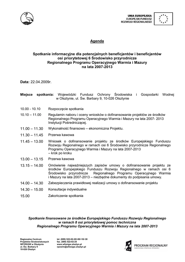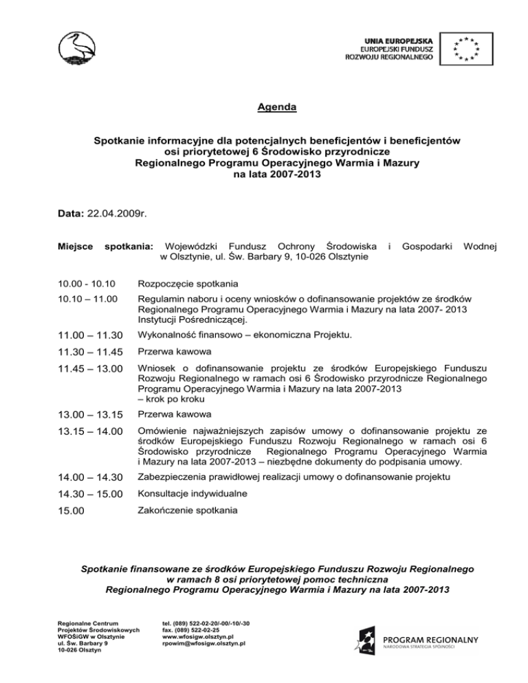 Agenda Spotkanie informacyjne dla potencjalnych beneficjentów i beneficjentów osi priorytetowej 6 Środowisko przyrodnicze Regionalnego Programu Operacyjnego Warmia i Mazury na lata 2007-2013 Data: 22.04.2009r. Miejsce spotkania: Wojewódzki Fundusz Ochrony Środowiska w Olsztynie, ul. Św. Barbary 9, 10-026 Olsztynie i Gospodarki Wodnej 10.00 - 10.10 Rozpoczęcie spotkania 10.10 – 11.00 Regulamin naboru i oceny wniosków o dofinansowanie projektów ze środków Regionalnego Programu Operacyjnego Warmia i Mazury na lata 2007- 2013 Instytucji Pośredniczącej. 11.00 – 11.30 Wykonalność finansowo – ekonomiczna Projektu. 11.30 – 11.45 Przerwa kawowa 11.45 – 13.00 Wniosek o dofinansowanie projektu ze środków Europejskiego Funduszu Rozwoju Regionalnego w ramach osi 6 Środowisko przyrodnicze Regionalnego Programu Operacyjnego Warmia i Mazury na lata 2007-2013 – krok po kroku 13.00 – 13.15 Przerwa kawowa 13.15 – 14.00 Omówienie najważniejszych zapisów umowy o dofinansowanie projektu ze środków Europejskiego Funduszu Rozwoju Regionalnego w ramach osi 6 Środowisko przyrodnicze Regionalnego Programu Operacyjnego Warmia i Mazury na lata 2007-2013 – niezbędne dokumenty do podpisania umowy. 14.00 – 14.30 Zabezpieczenia prawidłowej realizacji umowy o dofinansowanie projektu 14.30 – 15.00 Konsultacje indywidualne 15.00 Zakończenie spotkania Spotkanie finansowane ze środków Europejskiego Funduszu Rozwoju Regionalnego w ramach 8 osi priorytetowej pomoc techniczna Regionalnego Programu Operacyjnego Warmia i Mazury na lata 2007-2013 Regionalne Centrum Projektów Środowiskowych WFOŚiGW w Olsztynie ul. Św. Barbary 9 10-026 Olsztyn tel. (089) 522-02-20/-00/-10/-30 fax. (089) 522-02-25 www.wfosigw.olsztyn.pl [email protected]