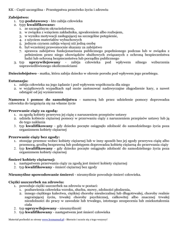 KK - Część szczególna - Przestępstwa przeciwko życiu i zdrowiu Zabójstwo: 1. typ podstawowy - kto zabija człowieka 2. typy kwalifikowane: 1. ze szczególnym okrucieństwem, 2. w związku z wzięciem zakładnika, zgwałceniem albo rozbojem, 3. w wyniku motywacji zasługującej na szczególne potępienie, 4. z użyciem materiałów wybuchowych 5. jednym czynem zabija więcej niż jedną osobę 6. był wcześniej prawomocnie skazany za zabójstwo 7. sprawca zabójstwa funkcjonariusza publicznego popełnionego podczas lub w związku z pełnieniem przez niego obowiązków służbowych związanych z ochroną bezpieczeństwa ludzi lub ochroną bezpieczeństwa lub porządku publicznego 3. typ uprzywilejowany - zabija człowieka pod wpływem silnego wzburzenia usprawiedliwionego okolicznościami Dzieciobójstwo - matka, która zabija dziecko w okresie porodu pod wpływem jego przebiegu. Eutanazja: 1. zabija człowieka na jego żądanie i pod wpływem współczucia dla niego 2. w wyjątkowych wypadkach sąd może zastosować nadzwyczajne złagodzenie kary, a nawet odstąpić od jej wymierzenia Namowa i pomoc do samobójstwa - namową lub przez udzielenie pomocy doprowadza człowieka do targnięcia się na własne życie Przerwanie ciąży za zgodą: 1. za zgodą kobiety przerywa jej ciążę z naruszeniem przepisów ustawy 2. udziela kobiecie ciężarnej pomocy w przerwaniu ciąży z naruszeniem przepisów ustawy lub ją do tego nakłania 3. typ kwalifikowany - gdy dziecko poczęte osiągnęło zdolność do samodzielnego życia poza organizmem kobiety ciężarnej Przerwanie ciąży bez zgody: 1. stosując przemoc wobec kobiety ciężarnej lub w inny sposób bez jej zgody przerywa ciążę albo przemocą, groźbą bezprawną lub podstępem doprowadza kobietę ciężarną do przerwania ciąży 2. typ kwalifikowany - gdy dziecko poczęte osiągnęło zdolność do samodzielnego życia poza organizmem kobiety ciężarnej Śmierć kobiety ciężarnej: 1. następstwem przerwania ciąży za zgodą jest śmierć kobiety ciężarnej 2. typ kwalifikowany - śmierć ciężarnej bez zgody Nieumyślne spowodowanie śmierci - nieumyślnie powoduje śmierć człowieka. Ciężki uszczerbek na zdrowiu: 1. powoduje ciężki uszczerbek na zdrowiu w postaci: 1. pozbawienia człowieka wzroku, słuchu, mowy, zdolności płodzenia, 2. innego ciężkiego kalectwa, ciężkiej choroby nieuleczalnej lub długotrwałej, choroby realnie zagrażającej życiu, trwałej choroby psychicznej, całkowitej albo znacznej trwałej niezdolności do pracy w zawodzie lub trwałego, istotnego zeszpecenia lub zniekształcenia ciała 2. typ uprzywilejowany - nieumyślność 3. typ kwalifikowany - następstwem jest śmierć człowieka Materiał pochodzi ze strony www.lexmanual.pl - Bierzcie i uczcie się z tego wszyscy! KK - Część szczególna - Przestępstwa przeciwko życiu i zdrowiu Inne uszkodzenie ciała: 1. powoduje naruszenie czynności narządu ciała lub rozstrój zdrowia niż ciężki (tzw. powyżej 7 dni) 2. powoduje naruszenie czynności narządu ciała lub rozstrój zdrowia trwający nie dłużej niż 7 dni 3. typ uprzywilejowany - nieumyślność 4. ściganie poniżej 7 dni i nieumyślności poniżej 7 dni - prywatnoskargowe, chyba że osoba najbliższa jest pokrzywdzoną wspólnie mieszkającą ze sprawcą 5. ściganie nieumyślności na wniosek osoby najbliższej Uszkodzenia prenatalne: 1. powoduje uszkodzenie ciała dziecka poczętego lub rozstrój zdrowia zagrażający jego życiu 2. nie popełnia przestępstwa lekarz, jeżeli uszkodzenie ciała lub rozstrój zdrowia dziecka poczętego są następstwem działań leczniczych, koniecznych dla uchylenia niebezpieczeństwa grożącego zdrowiu lub życiu kobiety ciężarnej albo dziecka poczętego 3. nie podlega karze matka dziecka poczętego, która dopuszcza się czynu określonego wyżej Bójka i pobicie: 1. bierze udział w bójce lub pobiciu, w którym naraża się człowieka na bezpośrednie niebezpieczeństwo utraty życia albo nastąpienie skutku pod postacią ciężkiego lub średniego uszczerbku 2. typ kwalifikowany - następstwem bójki lub pobicia jest ciężki uszczerbek na zdrowiu człowieka 3. typ kwalifikowany - następstwem bójki lub pobicia jest śmierć człowieka 4. biorąc udział w bójce lub pobiciu człowieka, używa broni palnej, noża lub innego podobnie niebezpiecznego przedmiotu Narażenie na niebezpieczeństwo: 1. naraża człowieka na bezpośrednie niebezpieczeństwo utraty życia albo ciężkiego uszczerbku na zdrowiu 2. typ kwalifikowany - na sprawcy ciąży obowiązek opieki nad osobą narażoną na niebezpieczeństwo 3. typ uprzywilejowany - nieumyślność (wtedy na wniosek pokrzywdzonego) 4. nie podlega karze - sprawca, który dobrowolnie uchylił grożące niebezpieczeństwo Narażenie na zarażenie: 1. wiedząc, że jest zarażony wirusem HIV, naraża bezpośrednio inną osobę na takie zarażenie 2. wiedząc, że jest dotknięty chorobą weneryczną lub zakaźną, ciężką chorobą nieuleczalną lub realnie zagrażającą życiu, naraża bezpośrednio inną osobę na zarażenie taką chorobą 3. ściganie obu przestępstw na wniosek pokrzywdzonego Nieudzielenie pomocy: 1. człowiekowi znajdującemu się w położeniu grożącym bezpośrednim niebezpieczeństwem utraty życia albo ciężkiego uszczerbku na zdrowiu nie udziela pomocy, mogąc jej udzielić bez narażenia siebie lub innej osoby na niebezpieczeństwo utraty życia albo ciężkiego uszczerbku na zdrowiu 2. nie popełnia przestępstwa, kto nie udziela pomocy, do której jest konieczne poddanie się zabiegowi lekarskiemu albo w warunkach, w których możliwa jest niezwłoczna pomoc ze strony instytucji lub osoby do tego powołanej Materiał pochodzi ze strony www.lexmanual.pl - Bierzcie i uczcie się z tego wszyscy!