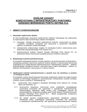 Załącznik nr 1 do Zarządzenia nr 41/2008 z dnia 16.12.2008 r. OGÓLNE ZASADY KORZYSTANIA Z INFRASTRUKTURY PORTOWEJ ZARZĄDU MORSKIEGO PORTU GDYNIA S.A. I. OBIEKTY HYDROTECHNICZNE 1. Obowiązki użytkownika obiektu. W celu prawidłowego utrzymania użytkowanych obiektów zobowiązuje się użytkownika do wykonywania niżej wymienionego zakresu obowiązków: 1.1. zimowego i letniego utrzymania użytkowanych terenów: oczyszczanie ze śniegu i gołoledzi, sprzątanie, zamiatanie oraz utrzymanie w sprawności oświetlenia zgodnie z przepisami Urzędu Morskiego; 1.2. udostępniania użytkowanego majątku do komisyjnej kontroli ustanowionej przez właściciela (Zarząd Morskiego Portu Gdynia S.A.); 1.3. dostosowywania środków trwałych Zarządu Morskiego Portu Gdynia S.A. do właściwości fizyko-chemicznych przeładowywanych towarów masowych. 2. Eksploatacja budowli hydrotechnicznej. W przypadku eksploatacji budowli morskiej zgodnie z jej przeznaczeniem funkcjonalnym, obowiązują parametry techniczno-użytkowe budowli podane w dokumentacji technicznej znajdującej się w Dziale Budowli Hydrotechnicznych. Najważniejszy parametr – wielkość dopuszczalnego obciążenia budowli i szerokość pasa w jakim obowiązuje – podano na tablicach informacyjnych usytuowanych w rejonie budowli. 3. Użytkowanie budowli hydrotechnicznej w sposób inny niż określony w punkcie „2”niniejszych zasad. W przypadku zmiany dotychczasowej technologii użytkowania całości lub części budowli morskiej na technologię niezgodną z przeznaczeniem funkcjonalnym budowli morskiej, o którym mowa w punkcie 2, zobowiązuje się: 3.1. użytkownika, który podpisał z Zarządem Morskiego Portu Gdynia S.A. umowę najmu lub dzierżawy, do: 3.1.1. opracowania ekspertyzy technicznej przez projektanta posiadającego uprawnienia budowlane bez ograniczeń w specjalności hydrotechnicznej, dopuszczającej dokonanie takiej zmiany oraz określającej warunki jej przeprowadzenia. Ekspertyza podlega opinii Działu Budowli Hydrotechnicznych Zarządu Morskiego Portu Gdynia S.A. - dalsze postępowanie uzależnione będzie od wyników ekspertyzy; 3.1.2. dla każdej operacji przeładunkowej zapewnienia dodatkowo nadzoru niezależnej osoby, posiadającej uprawnienia budowlane bez ograniczeń w specjalności hydrotechnicznej, nad zgodnością przeprowadzanych operacji Str.1 z 5 Ogólnych zasad korzystania z infrastruktury portowej ZMPG-a S.A. wprowadzonych zarządzeniem nr 41/2008 z dnia 16.12.2008r. z ekspertyzą. Na potwierdzenie tego faktu należy dostarczyć do Działu Głównego Dyspozytora Portu oświadczenie osoby nadzorującej o przyjęciu nadzoru nad operacjami przeładunkowymi jw. (wraz z kserokopią ww. uprawnień budowlanych i aktualną przynależnością do właściwej Izby Inżynierów Budownictwa); 3.1.3. powiadomienia stosownych działów Zarządu Morskiego Portu Gdynia S.A. – Działu Głównego Dyspozytora Portu i Działu Budowli Hydrotechnicznych – na 3 doby robocze przed planowaną operacją przeładunkową. W zgłoszeniu należy podać istotne dane techniczne mające wpływ na przeładunek, przywołać stosowną ekspertyzę techniczną i złożyć w Dziale Głównego Dyspozytora Portu stosowne dokumenty poświadczające ustanowienie nadzoru nad operacją. Dział Głównego Dyspozytora Portu po otrzymaniu ww. opinii i dokumentów wyraża zgodę na przeprowadzenie operacji przeładunkowej. 3.2. użytkownika, który nie ma podpisanej umowy najmu lub dzierżawy z Zarządem Morskiego Portu Gdynia S.A., w przypadku przeprowadzania operacji przeładunkowych, do sporządzenia dodatkowo: 3.2.1. oświadczenia o przyjęciu zobowiązania, przez osobę upoważnioną do reprezentowania użytkownika, do przestrzegania procesu technologicznego (założeń projektowych) podanego w ekspertyzie technicznej/projekcie i do pokrycia kosztów naprawy ewentualnych uszkodzeń budowli oraz kosztów usunięcia ewentualnych szkód związanych z prowadzoną przez niego działalnością na terenie Zarządu Morskiego Portu Gdynia S.A. oraz złożenia go w Dziale Głównego Dyspozytora Portu. Brak ww. dokumentu jest równoznaczny z odmową wydania zgody przez Dział Głównego Dyspozytora Portu na wykonanie operacji przeładunkowej; 3.2.2. protokołu stanu technicznego budowli przed przeprowadzeniem operacji przeładunkowej i dokumentacji ewentualnych uszkodzeń budowli po każdej operacji przeładunkowej (po przeprowadzeniu wizji lokalnej przez osobę wymienioną w punkcie 3.1.2.) z uzyskaniem akceptacji przedstawiciela Działu Budowli Hydrotechnicznych Zarządu Morskiego Portu Gdynia S.A. Usunięcie szkód oraz uszkodzeń budowli wynikających z porównania tych dwóch dokumentacji powinno się odbywać w oparciu o zobowiązanie wymienione w punkcie 3.2.1. Brak protokołu stanu technicznego budowli hydrotechnicznej przed planowaną operacją przeładunkową jest równoznaczny z odmową wydania zgody przez Dział Głównego Dyspozytora Portu na jej przeprowadzenie. 4. Czasowe wyłączenie obiektów infrastruktury z użytkowania. Zarząd Morskiego Portu Gdynia S.A. zastrzega sobie możliwość okresowego wyłączenia z eksploatacji poszczególnych budowli celem wykonania niezbędnych kontroli, napraw, prac remontowych itp. lub dla zrealizowania zadań wynikających z prowadzonych inwestycji. Termin realizacji robót oraz zakres wyłączonej z eksploatacji budowli zostanie wcześniej uzgodniony, w miarę możliwości, z danym użytkownikiem. 5. Przeprowadzanie robót budowlanych przez użytkownika. Każdorazowa rozbiórka, rozbudowa, przebudowa, naprawa lub remont obiektu, związany ze zmianą sposobu użytkowania w rozumieniu Art. 71 Prawa Budowlanego, wymagać będzie pisemnej akceptacji właściciela obiektu i postępowania zgodnego z przepisami Prawa Budowlanego. Po zmianie stanu środka trwałego Zarządu Morskiego Portu Gdynia S.A. należy wykonać dokumentację powykonawczą oraz obmiar geodezyjny (inwentaryzację) i przekazać