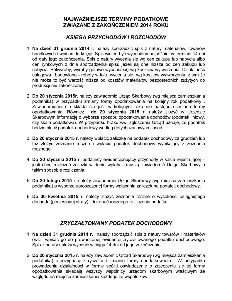 NAJWAŻNIEJSZE TERMINY PODATKOWE ZWIĄZANE Z ZAKOŃCZENIEM 2014 ROKU KSIĘGA PRZYCHODÓW I ROZCHODÓW 1. Na dzień 31 grudnia 2014 r. należy sporządzić spis z natury materiałów, towarów handlowych i wpisać do księgi. Spis winien być wyceniony najpóźniej w terminie 14 dni od daty jego zakończenia. Spis z natury wycenia się wg cen zakupu lub nabycia albo cen rynkowych z dnia sporządzenia spisu jeżeli są one niższe od cen zakupu lub nabycia. Półwyroby, wyroby gotowe wycenia się wg kosztów wytworzenia. Działalność usługowa i budowlana - roboty w toku wycenia się wg kosztów wytworzenia, z tym że nie może to być wartość niższa od kosztów materiałów bezpośrednich zużytych do produkcji nie zakończonej. 2. Do 20 stycznia 2015r. należy zawiadomić Urząd Skarbowy (wg miejsca zamieszkania podatnika) w przypadku zmiany formy opodatkowania na kolejny rok podatkowy . Zawiadomienia nie składa się jeśli w kolejnym roku nie następuje zmiana formy opodatkowania. Również do 20 stycznia 2015 r. należy złożyć w Urzędzie Skarbowym informację o wyborze sposobu opodatkowania dochodów (podatek liniowy, czy skala podatkowa). W przypadku braku ww. zgłoszenia Urząd uznaje, że podatnik będzie płacił podatek dochodowy według dotychczasowych zasad. 3. Do 20 stycznia 2015 r. należy wpłacić zaliczkę na podatek dochodowy za grudzień lub też złożyć zeznanie roczne i wpłacić podatek dochodowy wynikający z zeznania rocznego. 4. Do 20 stycznia 2015 r. podatnicy ewidencjonujący przychody w kasie rejestrującej – jeśli chcą rozliczać zaliczki w dacie wpłaty - muszą zawiadomić Urząd Skarbowy o takim sposobie rozliczenia. 5. Do 20 lutego 2015 r. należy zawiadomić Urząd Skarbowy (wg miejsca zamieszkania podatnika) o wyborze uproszczonej formy wpłacania zaliczek na podatek dochodowy. 6. Do 30 kwietnia 2015 r. należy złożyć zeznanie roczne o wysokości osiągniętego dochodu (poniesionej straty) i dokonać rocznego rozliczenia podatku. ZRYCZAŁTOWANY PODATEK DOCHODOWY 1. Na dzień 31 grudnia 2014 r. należy sporządzić spis z natury towarów i materiałów oraz wpisać go do prowadzonej ewidencji zryczałtowanego podatku dochodowego. Spis z natury należy wycenić w ciągu 14 dni od jego zakończenia. 2. Do 20 stycznia 2015 r. należy zawiadomić Urząd Skarbowy (wg miejsca zamieszkania podatnika) o rezygnacji z ryczałtu i zmianie formy opodatkowania. W przypadku prowadzenia działalności w formie spółki oświadczenie o zrzeczeniu się tej formy opodatkowania składają wszyscy wspólnicy urzędom skarbowym właściwym ze względu na miejsce zamieszkania każdego ze wspólników. 3. Do 31 stycznia 2015 r. należy złożyć do Urzędu Skarbowego właściwego ze względu na miejsce zamieszkania podatnika, zeznanie o wysokości uzyskanego przychodu, wysokości dokonanych odliczeń i należnego ryczałtu od przychodów oraz wpłacić należną zaliczkę za grudzień 2014 r. wynikającą z rozliczenia rocznego (druk PIT-28). W przypadku spółek zeznanie składa każdy ze wspólników do Urzędu Skarbowego wg miejsca zamieszkania. OBOWIĄZKI PŁATNIKA PODATKU DOCHODOWEGO Z TYTUŁU ROCZNEGO ROZLICZENIA PRACOWNIKÓW do 9 stycznia do 31 stycznia do 28 lutego do 31 marca do 30 kwietnia - przyjęcie oświadczenia od pracowników PIT-12 uprawniającego do rozliczenia przez zakład pracy podatku za rok ubiegły - płatnik zobowiązany jest złożyć w Urzędzie Skarbowym PIT-4R za 2014 r. o wysokości wpłaconych zaliczek na podatek dochodowy w poszczególnych miesiącach roku od wypłaconych wynagrodzeń, z tytułu umów zlecenia i o dzieło. - pracownikom, którzy nie złożyli oświadczenia PIT-12, oraz Urzędom Skarbowym według miejsca zamieszkania pracownika należy przekazać imienne informacje PIT-11. W przypadku podatników składających informacje roczne PIT11 w formie papierowej (zakłady zatrudniające do 5-ciu pracowników którzy rozliczają dokumenty sami bez pośrednictwa Biura Rachunkowego), termin na ich złożenie w Urzędzie Skarbowym wyznaczony został na dzień 31 stycznia 2015 r. - przesłanie rocznego rozliczenia podatku PIT-40 dla pracownika oraz do 15 kwietnia do Urzędu Skarbowego wg miejsca zamieszkania pracownika. - złożenie do Urzędu Skarbowego zeznań rocznych przez podatników rozliczających się samodzielnie. Przy dokonywaniu rocznego obliczenia podatku zakład pracy - na wniosek pracownika uwzględnia faktycznie poniesione przez pracownika koszty dojazdu do pracy, jeżeli zostaną udokumentowane wyłącznie imiennymi biletami okresowymi, odlicza od dochodu składki płacone przez pracownika na rzecz organizacji do których przynależność jest obowiązkowa (np. Rada Adwokacka) oraz zwrócone nienależnie pobrane świadczenia jeżeli nie zostały potrącone od dochodu przy poborze zaliczek. W przypadku zatrudnianych emerytów i rencistów należy pamiętać o przesłaniu do Oddziału ZUS w terminie do dnia 28 lutego 2015 r. informacji o wysokości wypłaconego za 2014 rok wynagrodzenia (ze stosunku pracy, umowy-zlecenia, umowy o dzieło itp.). KARTA PODATKOWA Do 31 stycznia 2015 r. należy złożyć (na druku PIT-16A) informację o zapłaconej i odliczonej w poszczególnych miesiącach roku składce na ubezpieczenie zdrowotne. PODATEK VAT Do 15 stycznia 2015 r. należy złożyć informację w przypadku wyboru kasowej metody rozliczania podatku VAT. W tym też terminie należy złożyć rezygnację z tej metody rozliczeń, jeśli podatnik ją dotychczas prowadził.