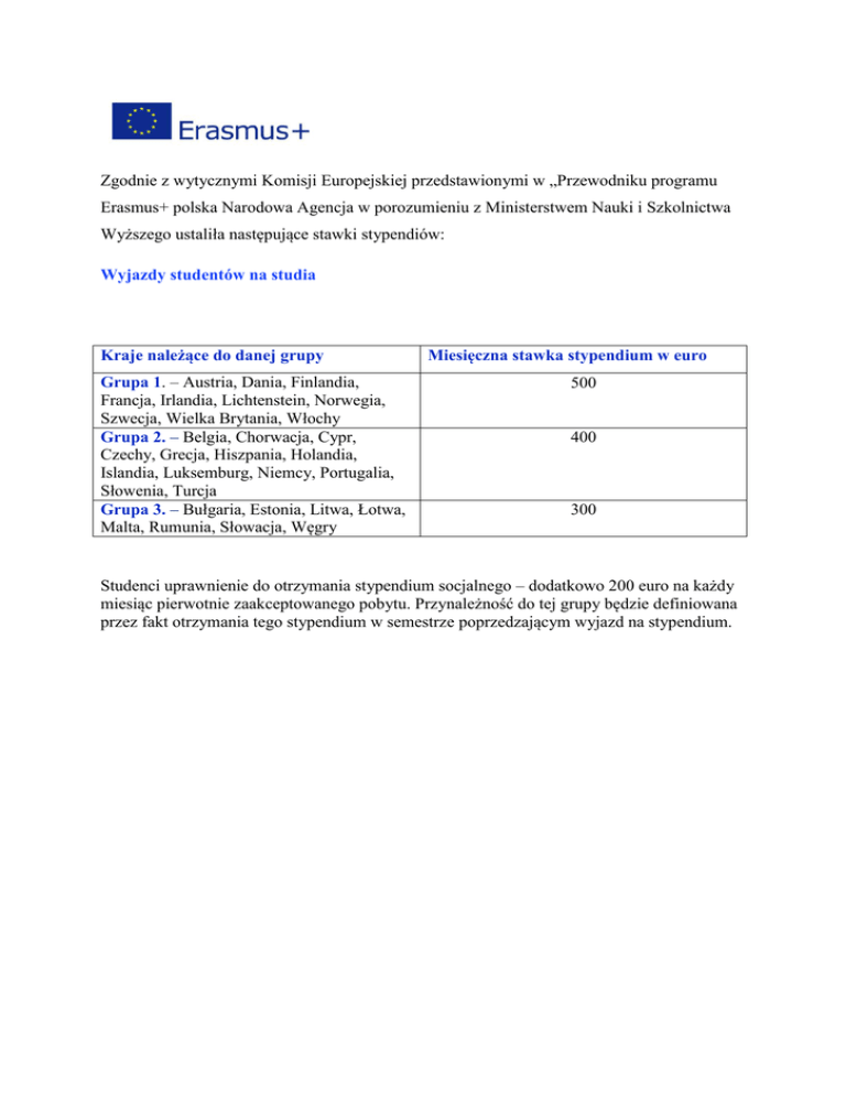 Zgodnie z wytycznymi Komisji Europejskiej przedstawionymi w „Przewodniku programu Erasmus+ polska Narodowa Agencja w porozumieniu z Ministerstwem Nauki i Szkolnictwa Wyższego ustaliła następujące stawki stypendiów: Wyjazdy studentów na studia Kraje należące do danej grupy Grupa 1. – Austria, Dania, Finlandia, Francja, Irlandia, Lichtenstein, Norwegia, Szwecja, Wielka Brytania, Włochy Grupa 2. – Belgia, Chorwacja, Cypr, Czechy, Grecja, Hiszpania, Holandia, Islandia, Luksemburg, Niemcy, Portugalia, Słowenia, Turcja Grupa 3. – Bułgaria, Estonia, Litwa, Łotwa, Malta, Rumunia, Słowacja, Węgry Miesięczna stawka stypendium w euro 500 400 300 Studenci uprawnienie do otrzymania stypendium socjalnego – dodatkowo 200 euro na każdy miesiąc pierwotnie zaakceptowanego pobytu. Przynależność do tej grupy będzie definiowana przez fakt otrzymania tego stypendium w semestrze poprzedzającym wyjazd na stypendium.