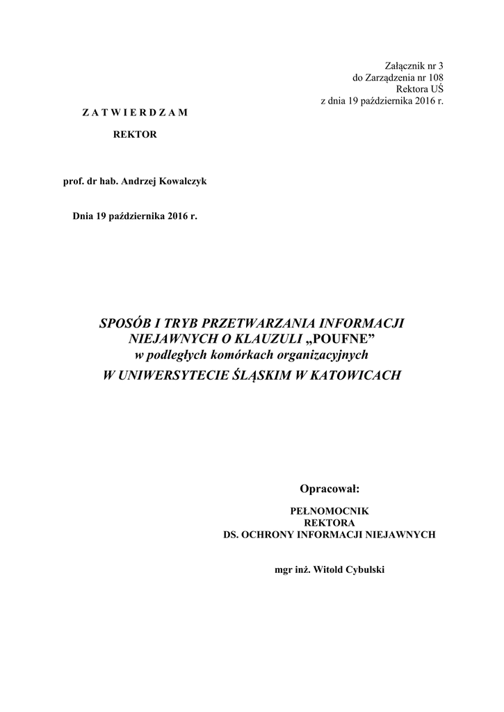 Załącznik nr 3 do Zarządzenia nr 108 Rektora UŚ z dnia 19 października 2016 r. ZATWIERDZAM REKTOR prof. dr hab. Andrzej Kowalczyk Dnia 19 października 2016 r. SPOSÓB I TRYB PRZETWARZANIA INFORMACJI NIEJAWNYCH O KLAUZULI „POUFNE” w podległych komórkach organizacyjnych W UNIWERSYTECIE ŚLĄSKIM W KATOWICACH Opracował: PEŁNOMOCNIK REKTORA DS. OCHRONY INFORMACJI NIEJAWNYCH mgr inż. Witold Cybulski Wstęp ......................................................................................................................................... 3 Rozdział I .................................................................................................................................. 3 Podstawa prawna. ....................................................................................................................... 3 Rozdział II ................................................................................................................................. 3 Założenia ogólne, definicje. ....................................................................................................... 3 Rozdział III ............................................................................................................................... 4 Klasyfikowanie informacji niejawnych. .................................................................................... 4 Rozdział IV................................................................................................................................ 5 Bezpieczeństwo osobowe. .......................................................................................................... 5 Rozdział V ................................................................................................................................. 6 Przetwarzanie materiałów poufnych w kancelarii niejawnej. .................................................... 6 Rozdział VI................................................................................................................................ 6 Obieg dokumentów. ................................................................................................................... 6 Rozdział VII .............................................................................................................................. 7 Wytwarzanie i modyfikowanie materiałów poufnych. .............................................................. 7 Rozdział VIII ............................................................................................................................ 7 Kopiowanie materiałów poufnych. ............................................................................................ 7 Rozdział IX................................................................................................................................ 8 Niszczenie materiałów niejawnych. ........................................................................................... 8 Rozdział X ................................................................................................................................. 9 Przechowywanie i zabezpieczenie materiałów poufnych. ......................................................... 9 Rozdział XI................................................................................................................................ 9 Postępowanie wyjaśniające. ....................................................................................................... 9 Rozdział XII .............................................................................................................................. 9 Odpowiedzialność za ujawnienie informacji niejawnych. ......................................................... 9 Rozdział XIII ............................................................................................................................ 9 Nadzór w zakresie ochrony informacji niejawnych. .................................................................. 9 Rozdział XIV ........................................................................................................................... 10 Postanowienia końcowe, uwagi. .............................................................................................. 10 2 Wstęp Zgodnie art. 43. ust. 3 ustawy z dnia 5 sierpnia 2010 r. o ochronie informacji niejawnych (Dz.U.2016.1167 - t.j.) w Uniwersytecie Śląskim w Katowicach opracowano „Sposób i tryb przetwarzania informacji niejawnych o klauzuli „Poufne” w podległych komórkach organizacyjnych w Uniwersytecie Śląskim w Katowicach” – zwany dalej „Instrukcją o poufnych”. W Uniwersytecie Śląskim zgodnie z art. 43. ust. 5, UOIN została opracowana przez pełnomocnika rektora ds. ochrony informacji niejawnych (zwany dalej: „pełnomocnik ochrony”) oraz zatwierdzona przez rektora i wprowadzona do użytku zarządzeniem rektora „Instrukcja dotycząca sposobu i trybu przetwarzania informacji niejawnych o klauzuli „Zastrzeżone” w podległych komórkach organizacyjnych oraz zakres i warunki stosowania środków bezpieczeństwa fizycznego w celu ich ochrony” – zwana dalej: „Instrukcją o zastrzeżonych”, która wraz z niniejszym dokumentem tworzy spójny system ochrony i zarządzania bezpieczeństwem materiałów zawierających informacje niejawne o klauzulach tajności „Poufne” i „Zastrzeżone” w Uczelni. W opracowaniu określono zasady przetwarzania informacji niejawnych o klauzuli tajności „Poufne”. Rozdział I Podstawa prawna. §1 1. Ustawa z dnia 5 sierpnia 2010 r. o ochronie informacji niejawnych (Dz.U.2016.1167 – t.j.), zwanej dalej „UOIN”. 2. Rozporządzenie Rady Ministrów z dnia 29 maja 2012 roku w sprawie środków bezpieczeństwa fizycznego stosowanych do zabezpieczania informacji niejawnych (Dz.U.2012.683). 3. Rozporządzenie Prezesa Rady Ministrów z dnia 22 grudnia 2011 roku w spr