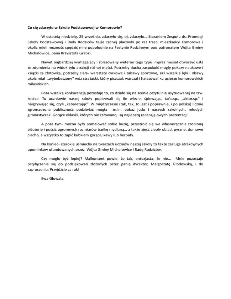 Co się zdarzyło w Szkole Podstawowej w Komorowie? W ostatnią niedzielę, 25 września, zdarzyło się, oj, zdarzyło… Staraniem Zespołu ds. Promocji Szkoły Podstawowej i Rady Rodziców tejże zacnej placówki po raz trzeci mieszkańcy Komorowa i okolic mieli możność spędzić miłe popołudnie na Festynie Rodzinnym pod patronatem Wójta Gminy Michałowice, pana Krzysztofa Grabki. Nawet najbardziej wymagający i zblazowany weteran tego typu imprez musiał otworzyć usta ze zdumienia na widok tylu atrakcji różnej maści. Potrzeby ducha zaspokoić mogły pokazy naukowe i książki za złotówkę, potrzeby ciała- warsztaty cyrkowe i zabawy sportowe, zaś wszelkie lęki i obawy ukoić miał „wybebeszony” wóz strażacki, który piszczał, warczał i hałasował ku uciesze komorowskich milusińskich. Poza wszelką konkurencją pozostaje to, co działo się na scenie przytulnie usytuowanej na tzw. kostce. Tu uczniowie naszej szkoły popisywali się ile wlezie, śpiewając, tańcząc, „aktorząc” i naigrywając się, czyli „kabaretując”. W międzyczasie (tak, tak, to jest i poprawnie, i po polsku) licznie zgromadzona publiczność podziwiać mogła m.in. pokaz judo i naszych szkolnych, młodych gimnastyczek. Gorące oklaski, których nie żałowano, są najlepszą recenzją owych prezentacji. A poza tym- można było pomalować sobie buzię, przystroić się we własnoręcznie zrobioną biżuterię i puścić ogromnych rozmiarów bańkę mydlaną… a także zjeść ciepły obiad, pyszne, domowe ciacho, a wszystko to zapić kubkiem gorącej kawy lub herbaty. Na koniec- szerokie uśmiechy na twarzach uczniów naszej szkoły to także zasługa atrakcyjnych upominków ufundowanych przez Wójta Gminy Michałowice i Radę Rodziców. Czy mogło być lepiej? Malkontent powie, że tak, entuzjasta, że nie… Mnie pozostaje przyłączenie się do podziękowań złożonych przez panią dyrektor, Małgorzatę Głodowską, i do zaproszenia: Przyjdźcie za rok! Ewa Głowala.
