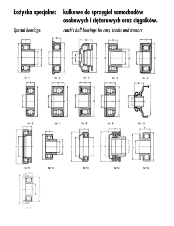Łożyska specjalne: kulkowe do sprzęgieł samochodów osobowych i ciężarowych oraz ciągników. Special bearings: cutch’s ball bearings for cars, trucks and tractors Łożyska specjalne: kulkowe do sprzęgieł samochodów osobowych i ciężarowych oraz ciągników. Special bearings: cutch’s ball bearings for cars, trucks and tractors Średnica docisku Wymiary główne Dimensions Pressure diameter d D B L 29,5 23.5 30,7 32 52,7 15 26 15 14,5 14 14 14 14 18,4 16 25 19,25 27 34 22,8 28,5 21,971 21,971 27 25 Oznaczenie łożyska Bearing designation d1 35,9 37 40,5 50 52,388 38 52,413 55 63,505 65 75 106 Obroty graniczne Limiting speeds dynamic statycz. w smarze static grease *) 800 800 800 830 1030 1030 1030 820 1030 3100 1660 1660 1660 1660 2130 2130 2520 2520 3350 4060 – – – 11000 10000 10000 10000 10000 9500 8500 8500 7500 7500 7500 7000 7500 6300 6300 5600 2500 daN 82.2 – 34 34 39,5 – 39,5 39,5 39,5 39,5 – 90,5 – – 54 54 – – – – – 138 173-722 173Z-722 173-723 CBK-182 A CBK-269 CBK-269 ZRS CBK-269 X1 CBK-302 174-944TNG 114-1075 114-733 CBK-197 114-791-2Z 114Z-791-2Z 114-742 114-744 TN RS CBK-297 CBK-297 X1 114-740 175-1025-2RSC3 1190 1190 1190 1320 1600 1160 1600 1600 1320 3300 2180 2180 2180 2180 2830 2830 3050 3050 3950 3980 w oleju Zmiana konstrukcji wewnętrznej - Modified or changed internal design Z Łożysko z jedną blaszką ochronną - Bearing with one shield 2Z Łożysko z dwoma blaszkami ochronnymi - Bearing with two shield Łożysko z jedną uszczelką jednowargową osadzoną na pierścieniu zewnętrznym - Bearing with one rubber seal (with one lip) mounted on outer ring Nr rys. Fig. No. oil obr. /min. A RS Masa Mass dynam. mm 53 58 62 62 62 62 68 80 81,6 84,5 84,3 84,3 91,6 92 100 100 117 145 Nośność Load rating – – – – – 13000 – – – – – – – – – – – – – – kg 0,069 0,14 0,068 0,13 0,153 0,153 0,163 0,3 0,192 0,445 0,44 0,26 0,38 0,71 0,56 0,66 0,56 0,535 0,87 0,99 TNG Łożysko z koszykiem masywnym poliamidowym wzmocnionym włóknem szklanym prowadzonym na elementach tocznych - Bearing with solid polyamide cage reinforced by glass fibre, centred on rolling elements TN Łożysko z koszykiem masywnym poliamidowym prowadzonym na elementach tocznych - Bearing with solid polyamide cage centred on roling elements X1 Główne wymiary odbiegają od norm międzynarodowych - Main dimensions are not in conformity with the international standards 3 10 3 2 1 12 1 4 11 16 5 6 13 14 7 8 9 9 5 15