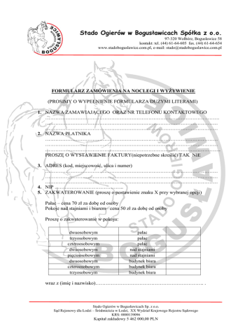 Stado Ogierów w Bogusławicach Spółka z o.o. 97-320 Wolbórz, Bogusławice 58 kontakt: tel. (44) 61-64-605 fax. (44) 61-64-654 www.stadoboguslawice.com.pl, e-mail: [email protected] FORMULARZ ZAMÓWIENIA NA NOCLEGI I WYŻYWIENIE (PROSIMY O WYPEŁNIENIE FORMULARZA DUŻYMI LITERAMI) 1. NAZWA ZAMAWIAJĄCEGO ORAZ NR TELEFONU KONTAKTOWEGO …………………………………………………………………………………………. ………………………………………………………………………………………… ………………………………………………………………………………………… 2. NAZWA PŁATNIKA ………………………………………………………………………………………… ………………………………………………………………………………………… ………………………………………………………………………………………….. PROSZĘ O WYSTAWIENIE FAKTURY(niepotrzebne skreślić) TAK NIE 3. ADRES (kod, miejscowość, ulica i numer) ………………………………………………………………………………………… ………………………………………………………………………………………… ………………………………………………………………………………………… 4. NIP ………………………………….. 5. ZAKWATEROWANIE (proszę o postawienie znaku X przy wybranej opcji) Pałac – cena 70 zł za dobę od osoby Pokoje nad stajniami i biurem– cena 50 zł za dobę od osoby Proszę o zakwaterowanie w pokoju: dwuosobowym trzyosobowym czteroosobowym dwuosobowym pięcioosobowym dwuosobowym czteroosobowym trzyosobowym pałac pałac pałac nad stajniami nad stajniami budynek biura budynek biura budynek biura wraz z (imię i nazwisko)………………………………………………………. . Stado Ogierów w Bogusławicach Sp. z o.o. Sąd Rejonowy dla Łodzi – Śródmieścia w Łodzi, XX Wydział Krajowego Rejestru Sądowego KRS: 0000139096 Kapitał zakładowy 5 462 000,00 PLN Stado Ogierów w Bogusławicach Spółka z o.o. 97-320 Wolbórz, Bogusławice 58 kontakt: tel. (44) 61-64-605 fax. (44) 61-64-654 www.stadoboguslawice.com.pl, e-mail: [email protected] Rezerwacja w terminie: 17/18.03.2017 18/19.03.2017 Uprzejmie informuję, że decyduje kolejność rezerwacji. Na tej podstawie zostaną rozdysponowane pokoje. 6. WYŻYWIENIE (proszę o postawienie znaku X przy wybranej opcji) śniadanie obiad śniadanie obiad 18.03.2017 18.03.2017 19.03.2017 19.03.2017 Ceny posiłków: śniadanie 20 zł, obiad 25 zł. 7. UWAGA: Formularz dotyczy zamawiających nocleg z wyżywieniem lub samo wyżywienie. 8. Zamówienie należy przesłać w nieprzekraczalnym terminie do 05.03.2017 r. na adres e-mail: [email protected]; tel. 44 6164605 (pn.-pt. 8-16). 9. Wszelkie zmiany we wcześniej przesłanym formularzu należy zgłaszać e-mailowy z dopiskiem w prawym górnym rogu formularza na pierwszej stronie KOREKTA. 10. NUMER KONTAKTOWY……………………………………….. 11. Każdy przesłany formularz zostanie potwierdzony e-mailem zwrotnym w ciągu 3 dni. Brak potwierdzenia oznacza, że nie otrzymaliśmy od Państwa e-maila. Wówczas proszę o kontakt telefoniczny. DZIĘKUJEMY I ZAPRASZAMY DO STADA OGIERÓW W BOGUSŁAWICACH. Stado Ogierów w Bogusławicach Sp. z o.o. Sąd Rejonowy dla Łodzi – Śródmieścia w Łodzi, XX Wydział Krajowego Rejestru Sądowego KRS: 0000139096 Kapitał zakładowy 5 462 000,00 PLN Stado Ogierów w Bogusławicach Spółka z o.o. 97-320 Wolbórz, Bogusławice 58 kontakt: tel. (44) 61-64-605 fax. (44) 61-64-654 www.stadoboguslawice.com.pl, e-mail: [email protected] Stado Ogierów w Bogusławicach Sp. z o.o. Sąd Rejonowy dla Łodzi – Śródmieścia w Łodzi, XX Wydział Krajowego Rejestru Sądowego KRS: 0000139096 Kapitał zakładowy 5 462 000,00 PLN