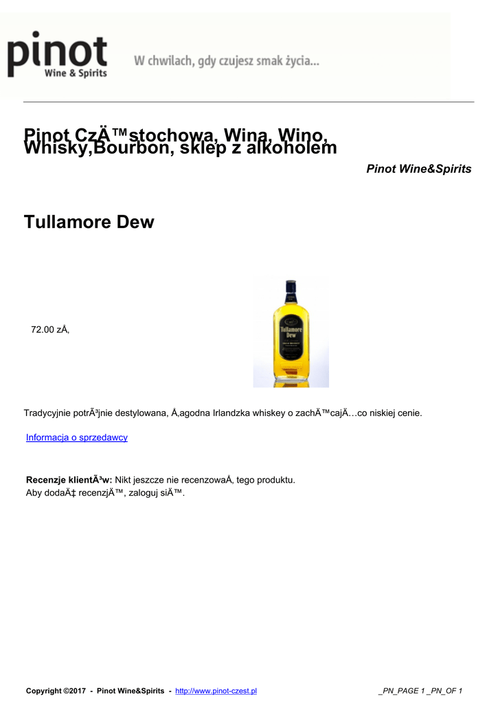 Pinot CzÄ™stochowa, Wina, Wino, Whisky,Bourbon, sklep z alkoholem Pinot Wine&Spirits Tullamore Dew 72.00 zÅ‚ Tradycyjnie potrójnie destylowana, Å‚agodna Irlandzka whiskey o zachÄ™cajÄ…co niskiej cenie. Informacja o sprzedawcy Recenzje klientów: Nikt jeszcze nie recenzowaÅ‚ tego produktu. Aby dodać recenzjÄ™, zaloguj siÄ™. Copyright ©2017 - Pinot Wine&Spirits - http://www.pinot-czest.pl _PN_PAGE 1 _PN_OF 1