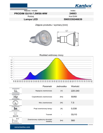 Nazwa / model Index PRODIM GU10-7,5WS6-WW 24663 Rodzaj Kod EAN Lampa LED 5905339246639 Zdjęcie produktu / wymiary [mm] Rozkład widmowy mocy 1 0,9 0,8 0,7 0,6 0,5 0,4 0,3 0,2 0,1 180 280 380 390 400 410 420 430 440 450 460 470 480 490 500 510 520 530 540 550 560 570 580 590 600 610 620 630 640 650 660 670 680 690 700 710 720 730 740 750 760 770 780 790 800 0 Jednostka Wartość Napięcie znamionowe [V] 220-240 Częstotliwość znamionowa [Hz] 50/60 Moc znamionowa [W] 7,5 Prąd znamionowy lampy [A] 0,038 - GU10 Parametr Trzonek Znamionowy użyteczny strumień świetlny [lm] 560 2000K Deklaracja równoważności dotycząca mocy [W] 7,5-45 Temperatura barwowa [K] 2700 4000K - ≤6 Liczba cykli włącz / wyłącz - 15000 Nominalny kąt promieniowania [°] 60 Nominalny użyteczny strumień świetlny [lm] 450 Znamionowa trwałość lampy [h] 25000 - ≥0,5 Współczynnik zachowania strumienia świetlnego na zakończenie nominalnego okresu trwałości [%] ≥65 Czas zapłonu [s] <0,5 - ≥80 Znamionowa światłość szczytowa [cd] 440 Znamionowy kąt promieniowania [°] Oddawanie barw Zawartość rtęci w lampie 6000h LSF 6000h 8000K Jednolitość barw Współczynnik mocy lampy LLMF 5500K [mg] 60 brak Czas nagrzewania się lampy do 60% pełnego strumienia świetlnego [s] Współczynnik zachowania strumienia świetlnego po okresie 6000h - ≥80% Czas nagrzewania się lampy do 95% - <2 sek Współczynnik trwałości lampy po okresie 6000h - ≥90% Wskaźnik przedwczesnego końca eksploatacji lampy - <5% po 1000h Lampa jest przeznaczona do ściemniania - TAK Lampa jest przeznaczona do oświetlenia akcentowego - TAK pomijalny Etykieta efektywności energetycznej Zabronione jest używanie dokumentu niezgodnie z jego przeznaczeniem. Kanlux SA zastrzega sobie możliwość dokonywana zmian bez podania przyczyny. * wyniki uzyskane podczas badania konkretnego egzemplarza
