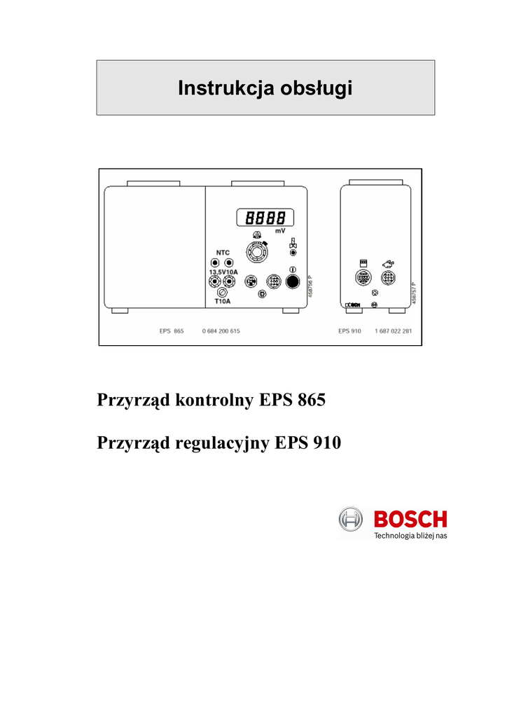 Instrukcja obsługi Przyrząd kontrolny EPS 865 Przyrząd regulacyjny EPS 910 Spis treści 1. Przeznaczenie .......................................................................................................... 3 2. Budowa .................................................................................................................... 4 3. Przygotowanie do badania........................................................................................ 5 4. Wykonanie badania .................................................................................................. 6 4.1 Pomiar dawki paliwa ................................................................................................. 6 4.2 Sprawdzanie zderzaka STOP ................................................................................... 6 4.3 Sprawdzanie zderzaka START ................................................................................. 6 4.4 Sprawdzanie czujnika temperatury............................................................................ 7 4.5 Źródło napięcia ......................................................................................................... 7 5. Połączenia systemów ............................................................................................... 7 6. Uruchamianie ........................................................................................................... 7 7. Usuwanie usterek ..................................................................................................... 8 8. Serwis....................................................................................................................... 9 9. Wymiary i dane techniczne ....................................................................................... 9 2 Wskazówki dotyczące bezpieczeństwa pracy oraz ochrony przyrządów i zespołów pojazdu PoniŜsza instrukcja obsługi powinna być stosowana tylko razem z instrukcją obsługi odpowiedniego stanowiska probierczego pomp wtryskowych. NaleŜy przestrzegać podanych tam wskazówek dotyczących bezpieczeństwa pracy. Podłączenie zasilania: Przyrząd moŜe być podłączony tylko za pomocą dostarczonego przewodu do odpowiednio uziemionego gniazda wtykowego z zestykiem ochronnym. Wirujące części: Podczas pracy silnika istnieje zagroŜenie zranienia przez wirujące części. Ryzyko takie stwarzają równieŜ elektrycznie napędzane wentylatory, które mogą się uruchamiać przy zatrzymanym silniku i wyłączonym zapłonie. 1. Przeznaczenie a) Przyrząd kontrolny EPS 865 Przyrząd kontrolny EPS 865 jest przeznaczony do badania rozdzielaczowych pomp wtryskowych (VE), stosowanych w elektronicznie sterowanych układach wtryskowych EDC (Elektronic Diesel Control). W tego typu układach pompa wtryskowa nie jest regulowana jak do tej pory mechanicznie, lecz przez elektroniczne urządzenie sterujące. Przyrząd kontrolny EPS 865 przejmuje tę funkcję podczas badania pompy na stanowisku probierczym. Przyrząd EPS 865 zawiera funkcje urządzenia sterującego, które są potrzebne do sprawdzania pompy i mierzy sygnały zwrotne z pompy wtryskowej. Ponadto za pomocą przyrządu kontrolnego następuje uaktywnienie elektromagnetycznego zaworu przestawiacza wtrysku. Chwilowa wartość rezystancji (zaleŜna od temperatury, patrz arkusz wartości pomiarowych) jest określana multimetrem w gniazdach przyłączeniowych NTC (poz. 12, rys. 1) (czujnik temperatury paliwa). b) Przyrząd regulacyjny EPS 910 Przyrząd regulacyjny EPS 910 moŜe pracować tylko w połączeniu z przyrządem kontrolnym EPS 865. Oba te przyrządy słuŜą do badania rozdzielaczowych pomp wtryskowych (VE), stosowanych w elektronicznie sterowanych układach wtryskowych EDC (Elektronic Diesel Control) z czujnikiem HDK (pierścień zwierający półróŜnicowy). Bezstykowy czujnik HDK zastępuje czujnik czynno-oporowy czujnika skoku suwaka. 3 2. Budowa a) Przyrząd kontrolny EPS 865 (rys. 1) 1 2 3 4 5 6 7 8 9 10 11 12 23 24 uchwyt obudowa ścianka przednia wskaźnik cyfrowy pokrętło potencjometru regulacyjnego wyłącznik elektromagnetycznego zaworu przestawiacza wtrysku wyłącznik główny złącze dla mechanizmu ustalającego złącze dla elektromagnetycznego zaworu przestawiacza wtrysku bezpiecznik 10 A gniazda przyłączeniowe 13,5 V/10 A gniazda przyłączeniowe NTC przewód do łączenia z układem kołek do przyłączenia masy Na tylnej ściance gniazdo wtykowe dla urządzenia chłodzącego (nie pokazane na rysunku). b) Przyrząd kontrolny EPS 865 z przyrządem regulacyjnym EPS 910 (rys. 2) 8 11 13 14 15 16 17 18 19 20 21 22 23 24 złącze dla przewodu sygnałowego gniazda przyłączeniowe 13,5 V/10 A uchwyt obudowa ścianka przednia złącze dla przewodu zasilającego i sygnałowego złącze dla mechanizmu ustalającego przewód zasilający i sygnałowy przewód sygnałowy przewód zasilający wtyczka bananowa czerwona wtyczka bananowa czarna przewód do łączenia z układem kołek do przyłączenia masy 4 3. Przygotowanie do badania Na stanowisku probierczym zamontować pompę wraz z wymaganym wyposaŜeniem badawczym oraz elementami mocującymi. Zasilić odpowiednim napięciem elektrozawór odcinający biegu jałowego (ELAB). Do tego celu uŜyć przewodów i zacisków istniejących przy EPS od 704 do 711 (patrz takŜe instrukcja obsługi stanowiska probierczego). JeŜeli nie dysponuje się zasilaniem zewnętrznym, to moŜna wykorzystać do tego celu akumulator lub prostownik. Wielkość napięcia zasilania jest podawana w odpowiednim arkuszu wartości kontrolnych. a) Pompa wtryskowa rozdzielaczowa z EDC bez czujnika HDK - Podłączyć pompę z adapterem (patrz punkt 5) przewodem (poz. 23, rys. 1) do przyrządu kontrolnego EPS 865. Ustawić potencjometr regulacyjny (poz. 5, rys. 1) na zero. Włączyć przyrząd EPS 865 za pomocą włącznika głównego (poz. 7, rys. 1). b) Pompa wtryskowa rozdzielaczowa z EDC oraz z czujnikiem HDK - Podłączyć