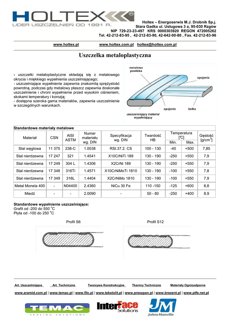 Holtex – Energoserwis M.J. Drobnik Sp.j. Stara Gadka ul. Usługowa 3 a, 95-030 Rzgów NIP 729-23-23-497 KRS 0000303920 REGON 472005262 Tel. 42-212-83-95 , 42-212-83-90, 42-642-00-80 , Fax. 42-212-83-96 www.holtex.pl www.holtex.com.pl [email protected] Uszczelka metaloplastyczna - uszczelki metaloplastyczne składają się z metalowego okrycia i miękkiego wypełnienia uszczelniającego; - uszczelniające wypełnienie zapewnia znakomitą sprężystość powrotną, podczas gdy metalowy płaszcz zapewnia doskonałe uszczelnienie i chroni wypełnienie przed wysokim ciśnieniem, skokami temperatury i korozją; - dostępna szeroka gama materiałów, zapewnia uszczelnienie w szczególnych warunkach. Standardowe materiały metalowe Materiał CSN AISI ASTM Numer materiału wg. DIN Specyfikacja wg. DIN Twardość HB Temperatura [°C] Min. Max. Stal węglowa 11 375 238-C 1.0038 RSt.37.2. CS 100 - 130 -40 +500 7,85 Stal nierdzewna 17 247 321 1.4541 X10CrNiTi 189 130 - 190 -250 +550 7,9 Stal nierdzewna 17 249 304 L 1.4306 X2CrNi 189 130 - 190 -250 +550 7,9 Stal nierdzewna 17 348 316Ti 1.4571 X10CrNiMoTi 1810 130 - 190 -100 +550 7,8 Stal nierdzewna 17 349 316L 1.4404 X2CrNiMo 1810 130 - 190 -100 +550 7,9 Metal Monela 400 - N04400 2.4360 NiCu 30 Fe 110 -150 -125 +600 8,8 Miedź - - 2.0090 - 50 - 80 -250 +400 8,9 Gęstość 3 [g/cm ] Standardowe wypełnienie uszczelniające: o Grafit od -200 do 550 C o Płyta od -100 do 250 C Profil S6 Art. Uszczelniające Art. Techniczne Profil S12 Tworzywa Konstrukcyjne Tkaniny Techniczne Materiały Ognioodporne www.aramid.com.pl | www.temac.pl | www.filc.pl | www.tekstolit.pl | www.preszpan.pl | www.brezent.pl | www.ptfe.net.pl Holtex – Energoserwis M.J. Drobnik Sp.j. Stara Gadka ul. Usługowa 3 a, 95-030 Rzgów NIP 729-23-23-497 KRS 0000303920 REGON 472005262 Tel. 42-212-83-95 , 42-212-83-90, 42-642-00-80 , Fax. 42-212-83-96 www.holtex.pl www.holtex.com.pl [email protected] Standardowe profile uszczelek: Wszelkie podane dane mają charakter wyłącznie informacyjny. Ponadto Holtex Energoserwis zastrzega sobie prawo do dokonywania zmian w dowolnym czasie i bez powiadomienia, w stosunku do informacji umieszczonych na niniejszych stronach. Art. Uszczelniające Art. Techniczne Tworzywa Konstrukcyjne Tkaniny Techniczne Materiały Ognioodporne www.aramid.com.pl | www.temac.pl | www.filc.pl | www.tekstolit.pl | www.preszpan.pl | www.brezent.pl | www.ptfe.net.pl