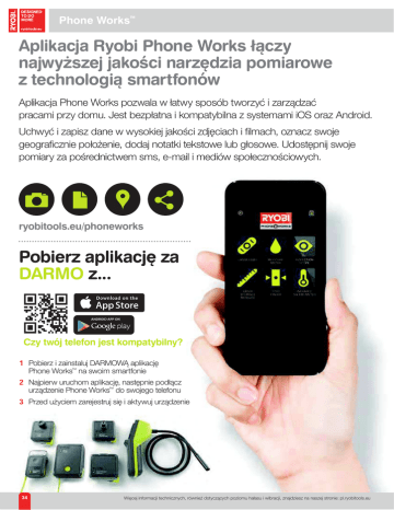 3KRQH:RUNV™ $SOLNDFMD5\REL3KRQH:RUNVîÇF]\ QDMZ\ĝV]HMMDNRĂFLQDU]ÙG]LDSRPLDURZH ]WHFKQRORJLÇVPDUWIRQöZ Aplikacja Phone Works pozwala w łatwy sposób tworzyć i zarządzać pracami przy domu. Jest bezpłatna i kompatybilna z systemami iOS oraz Android. Uchwyć i zapisz dane w wysokiej jakości zdjęciach i filmach, oznacz swoje geograficznie położenie, dodaj notatki tekstowe lub głosowe. Udostępnij swoje pomiary za pośrednictwem sms, e-mail i mediów społecznościowych. U\RELWRROVHXSKRQHZRUNV 3RELHU]DSOLNDFMÙ]D '$502] ANDROID APP ON &]\WZöMWHOHIRQMHVWNRPSDW\ELOQ\" 1 2 3 34 02 Pobierz i zainstaluj DARMOWĄ aplikację Phone Works™ na swoim smartfonie Najpierw uruchom aplikację, następnie podłącz urządzenie Phone Works™ do swojego telefonu Przed użyciem zarejestruj się i aktywuj urządzenie Więcej informacji technicznych, również dotyczących poziomu hałasu i wibracji, znajdziesz na naszej stronie: pl.ryobitools.eu 3KRQH:RUNV™ 53: 'DOPLHU] • • • • Namierz cel, naciśnij przycisk i odczytaj wynik z dokładnością do 2 mm Używaj wskaźnika poziomu do dokładnych pomiarów Wynik pomiaru błyskawicznie pojawi się na ekranie Twojego smaftfonu Udostępniaj swoje pomiary za pośrednictwem sms, e-maila lub mediów społecznościowych Zakres pomiaru (mm) Dokładność Liczba pomiarów Funkcja Pitagorasa Waga (kg) Numer Artykułu Kod EAN 30 +/- 2mm Nieograniczona Tak 0.07 5133002373 4892210132611 Wyposażenie standardowe (RPW-1000) Uchwyt do telefonu, (2) Baterie alkaliczne AAA 53: 3R]LRPLFDODVHURZD]HVWDW\ZHP • • • • • Dzięki poziomicy laserowej skomplikowane wyrównywanie obiektów należy już do przeszłości Użyj elastycznych nóg statywu, aby Twoje wyniki były precyzyjne w każdej sytuacji Technika lasorowa i prosta obsługa pozwala szybko i precyzyjnie wykonać wszystkie prace niwelacyjne Wynik pomiaru błyskawicznie pojawi się na ekranie Twojego smaftfonu Udostępniaj swoje pomiary za pośrednictwem sms, e-maila lub mediów społecznościowych Zakres pomiaru (mm) Klasyfikacja lasera Liczba pomiarów Tripod Mount Waga (kg) Numer Artykułu Kod EAN 5 Klasa 2 Nieograniczona 1/4” 0.14 5133002470 4892210137425 Wyposażenie standardowe (RPW-1650) Uchwyt do telefonu, (1) Baterie alkaliczne AAA Dostępne także jako: Dwuliniowy laser krzyżowy Typ: Numer Artykułu: Kod EAN: RPW-1600 5133002375 4892210132628 Więcej informacji technicznych, również dotyczących poziomu hałasu i wibracji, znajdziesz na naszej stronie: pl.ryobitools.eu 35 03 3KRQH:RUNV™ 53: :LOJRWQRĂFLRPLHU] • • • Urządzenie mierzy wilgotność materiałów w zakresie 6-44% w drewnie, płytach gipsowo-kartonowych, cemencie i innych materiałach budowlanych Wynik pomiaru błyskawicznie pojawi się na ekranie Twojego smaftfonu Przejrzysta prezentacja danych pomiarowychUdostępnij pomiary za pośrednictwem sms, e-maila i mediów społecznościowych Materiał Zakres pomiaru wilgotności betonu Zakres pomiaru drewna Liczba pomiarów Waga (kg) Numer Artykułu Kod EAN Drewno iglaste, Sosna, Buk, Liściaste, Dąb, Brzoza, Świerk, Płyta kartongips, Tynki gipsowe, Beton, Cement, Jastrych, Beton C20, Beton C25, Beton komórkowy 0.2-2% 6-44% Nieograniczona 0.05 5133002378 4892210132659 Wyposażenie standardowe (RPW-3000) (1) Zawiera baterię AAA oraz nakładkę mocującą 53: 7HUPRPHWUQDSRGF]HUZLHð • • • • Metodą bezdotykowego pomiaru temperatury na podczerwień RPW-2000 określi dokładną temperaturę każdej powierzchni Wynik pomiaru błyskawicznie pojawi się na ekranie Twojego smaftfonu Przejrzysta prezentacja danych pomiarowych Udostępnij pomiary sms, e-maila i mediów społecznościowych Zakres temperatur (°C) Pole widzenia (°) Liczba pomiarów Waga (kg) Numer Artykułu Kod EAN -30 do 350 8:1 Nieograniczona 0.08 5133002377 4892210132642 Wyposażenie standardowe (RPW-2000) Uchwyt do telefonu, (1) Baterie alkaliczne AAA 36 02 Więcej informacji technicznych, również dotyczących poziomu hałasu i wibracji, znajdziesz na naszej stronie: pl.ryobitools.eu 3KRQH:RUNV™ 53: .DPHUDLQVSHNF\MQD • • • • • • Dzięki wbudowanemu złączu Wi-Fi możliwa jest komunikacja nawet z 3 m Przystawka posiada wysięgnik długości 91 cm, wyposazony w jasne diody LED z trzema poziomami jasności Kolorowy ekran dotykowy upraszcza obsługę i zwiększa łatwość użytkowania Wynik pomiaru błyskawicznie pojawi się na ekranie Twojego smaftfonu Przejrzysta prezentacja danych pomiarowych Udostępniaj swoje pomiary za pośrednictwem sms, e-maila lub mediów społecznościowych Średnica głowicy kamery (mm) 9 Poziom jasności LED Długość przewodu (mm) Waga (kg) Numer Artykułu Kod EAN 3 910 0.3 5133002376 4892210132635 Wyposażenie standardowe (RPW-5000) Uchwyt do telefonu, (3) Baterie alkaliczne AA 53: 'HWHNWRU5DP\ • • • • Użyj strzałek na ekranie, aby znaleźć środek słupka w ścianie Wbudowany uchwyt pozwala zaznaczyć środek wykrytego stojaku Wynik pomiaru błyskawicznie pojawi się na ekranie Twojego smaftfonu Przejrzysta prezentacja danych pomiarowych Pomiar ramy Głębokość detekcji (mm) Waga (kg) Numer Artykułu Kod EAN Drewniane 19 0.08 5133002379 4892210132666 Wyposażenie standardowe (RPW-5500) (1) AAA battery 53: :DOL]ND • • • • Etui do przechowywania narzędzi Phone Works Odporne na wpływ czynników atmosferycznych Wkładki piankowe chroniące przed uszkodzeniem Schowek na dodatkowe baterie, spinacze, itp. Więcej informacji technicznych, również dotyczących poziomu hałasu i wibracji, znajdziesz na naszej stronie: pl.ryobitools.eu 37 03
