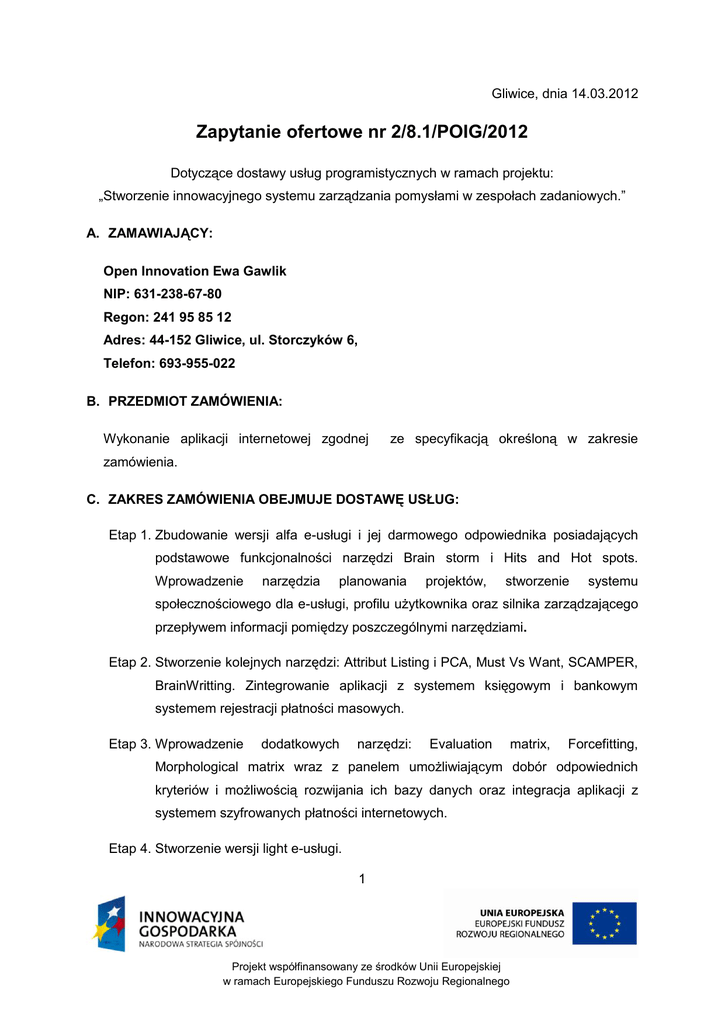 Gliwice, dnia 14.03.2012 Zapytanie ofertowe nr 2/8.1/POIG/2012 Dotyczące dostawy usług programistycznych w ramach projektu: „Stworzenie innowacyjnego systemu zarządzania pomysłami w zespołach zadaniowych.” A. ZAMAWIAJĄCY: Open Innovation Ewa Gawlik NIP: 631-238-67-80 Regon: 241 95 85 12 Adres: 44-152 Gliwice, ul. Storczyków 6, Telefon: 693-955-022 B. PRZEDMIOT ZAMÓWIENIA: Wykonanie aplikacji internetowej zgodnej ze specyfikacją określoną w zakresie zamówienia. C. ZAKRES ZAMÓWIENIA OBEJMUJE DOSTAWĘ USŁUG: Etap 1. Zbudowanie wersji alfa e-usługi i jej darmowego odpowiednika posiadających podstawowe funkcjonalności narzędzi Brain storm i Hits and Hot spots. Wprowadzenie narzędzia planowania projektów, stworzenie systemu społecznościowego dla e-usługi, profilu użytkownika oraz silnika zarządzającego przepływem informacji pomiędzy poszczególnymi narzędziami. Etap 2. Stworzenie kolejnych narzędzi: Attribut Listing i PCA, Must Vs Want, SCAMPER, BrainWritting. Zintegrowanie aplikacji z systemem księgowym i bankowym systemem rejestracji płatności masowych. Etap 3. Wprowadzenie dodatkowych narzędzi: Evaluation matrix, Forcefitting, Morphological matrix wraz z panelem umożliwiającym dobór odpowiednich kryteriów i możliwością rozwijania ich bazy danych oraz integracja aplikacji z systemem szyfrowanych płatności internetowych. Etap 4. Stworzenie wersji light e-usługi. 1 Projekt współfinansowany ze środków Unii Europejskiej w ramach Europejskiego Funduszu Rozwoju Regionalnego Etap 5. Integracja aplikacji z Tabletami i SmartPhone’ami pracującymi w systemie operacyjnym Mac OS4. Etap 6. Wprowadzenie narzędzia wspomagającego bieżące tłumaczenie pomysłów oraz narzędzia czytającego pomysły (dla osób z dysfunkcjami wzroku). Etap 7. Integracja e-usługi z Tabletami i SmartPhone’ami pracującymi w systemie operacyjnym Android. Etap 8. Wdrożenie systemu statystyk, wyszukiwania informacji i wprowadzenie funkcjonalności umożliwiającej integrację narzędzia z komunikatorem gadu-gadu poprzez stworzenie odpowiedniego BOTa. Integracji aplikacji ze SmartPhonami BlackBerry. Przedmiot zamówienia musi być wykonany z zastosowaniem poniższych technologii lub bardziej aktualnych wersji: - Baza danych MySQL(5.1) - Język programowania Ruby(1.9.2) - Framework Ruby on Rails(3.0)[RoR3] - AJAX - Platforma BotAPI D. TERMIN REALIZACJI ZAMÓWIENIA Termin realizacji przedmiotu zamówienia: Etap 1. – nie później niż do 15 czerwca 2012; Etap 2. – nie później niż do 14 września 2012; Etap 3. – nie później niż do 14 grudnia 2012; Etap 4. – nie później niż do 15 marca 2013; Etap 5. – nie później niż do 14 czerwca 2013; Etap 6. – nie później niż do 13 września 2013; Etap 7. – nie później niż do 13 grudnia 2013; Etap 8. – nie później niż do 14 marca 2014. 2 Projekt współfinansowany ze środków Unii Europejskiej w ramach Europejskiego Funduszu Rozwoju Regionalnego E. KRYTERIUM WYBORU OFERT: Kryteria konieczne: Złożenie na formularzu oferty stanowiącym Załącznik nr 2 niniejszego zapytania ofertowego, w określonym terminie oferty, która powinna zawierać takie informacje jak: - Pełna nazwa dostawcy; - Adres, numer telefonu oraz numer NIP dostawcy; - e-mail do kontaktów roboczych; - PKD działalności spójne z zakresem zamówienie; - Cenę netto i brutto całości zamówienia oraz cenny netto i brutto za wykonanie każdej poszczególnej usługi; - Termin ważności oferty; - Oferta musi być podpisana przez osobę lub osoby uprawnione do występowania w obrocie prawnym w imieniu oferenta, przy czym podpis musi być czytelny lub opisany pieczęciami imiennymi. Związanie złożoną ofertą: 30 dni od upływu terminu składania ofert. Kryterium decydujące: - 100% cena Zamawiający zastrzega sobie prawo do podzielenia oferty na oferty częściowe w przypadku, gdy tego typu działanie zmierzało do uzyskania bardziej korzystnej ekonomicznie oferty. F. MIEJSCE I TERMIN SKŁADANIA OFERT: 1. Ofertę należy złożyć w terminie do 28.03.2012 do godz. 12:00. 2. Oferta może być przesłana za pośrednictwem: Poczty elektronicznej na adres: [email protected] (skany dokumentów z podpisem i pieczęcią), pocztą/kurierem lub też dostarczone osobiście do siedziby zamawiającego. 3. Oferty złożone po terminie nie będą rozpatrywane. 3 Projekt współfinansowany ze środków Unii Europejskiej w ramach Europejskiego Funduszu Rozwoju Regionalnego 4. W toku badania i oceny ofert Zamawiający może żądać od oferentów wyjaśnień dotyczących treści złożonych ofert. G. DODATKOWE INFORMACJE: 1) Płatność za usługę nastąpi przelewem w ciągu 14 dni od daty otrzymania przez Zamawiającego poprawnie wystawionej faktury; podstawą do wystawienia faktury będzie podpisany przez obie strony protokół odbioru usługi. 2) Informacje szczegółowe można uzyskać bezpośrednio od zamawiającego. Zapytania o informacje szczegółowe prosimy kierować na adres e-mail: [email protected] lub pod tel.: 693-955-022. 3) Zamawiający zastrzega sobie prawo do odwołania niniejszego ogłoszenia bez podawania przyczyn. Zamawiający zastrzega sobie prawo do wezwania wykonawców do wyjaśnienia treści złożonej oferty. 4) Dostawca zapewni 6 miesięczną gwarancję na dostarczony kod. 5) W przypadku nie dostarczenia zamawianych usług w określonym terminie dostawca zobowiązuje się do wypłaty kary umownej zgodnie z projektem umowy stanowiącej załącznik nr 1 do niniejszego zapytania. Załączniki: 1. Projekt umowy 2. Formularz oferty 4 Projekt współfinansowany ze środków Unii Europejskiej w ramach Europejskiego Funduszu Rozwoju Regionalnego