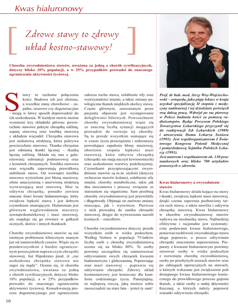Kwas hialuronowy [ Zdrowe stawy to zdrowy układ kostno-stawowy! ] Choroba zwyrodnieniowa stawów, uważana za jedną z chorób cywilizacyjnych, dotyczy blisko 10% populacji, a w 25% przypadków prowadzi do znacznego ograniczenia aktywności życiowej. S tawy to ruchome połączenia kości. Budowa ich jest złożona, a wszelkie stany chorobowe – zapalne, urazowe czy degeneracyjne - mogą w łatwy sposób doprowadzić do ich uszkodzenia. W każdym stawie można wymienić trzy składniki główne: powierzchnie stawowe pokryte chrząstką szklistą, szparę stawową oraz torebkę stawową z układem więzadeł. Chrząstka stawowa jest unikatową strukturą, która pokrywa powierzchnie stawowe. Tkanka chrzęstna jest odmianą tkanki łącznej – tkanką łączną szklistą. Składa się ona z galaretowatej substancji podstawowej oraz z komórek chrzęstnych. Torebka stawowa oraz więzadła zapewniają prawidłową stabilność stawu. Od wewnątrz torebka stawowa wyścielona jest błoną maziową: silnie unaczynioną i unerwioną strukturą wytwarzającą maź stawową. Maź ta odżywia chrząstkę, ponadto zawiera znaczne ilości kwasu hialuronowego, który zwiększa lepkość stawu i jest dobrym czynnikiem smarującym. Hialuronian jest głównym węglowodanem macierzy zewnątrzkomórkowej i mazi stawowej, ale znajduje się go również w gałkach ocznych, skórze i innych tkankach. Choroby zwyrodnieniowe stawów są zaś istotnym problemem klinicznym znanym już od zamierzchłych czasów. Wiąże się to przedewszystkim z bardzo ograniczonym potencjałem naprawczym chrząstki stawowej. Już Hipokrates pisał, iż „raz uszkodzona chrząstka stawowa nie zagoi się nigdy”. Ocenia się, iż choroba zwyrodnieniowa, uważana za jedną z chorób cywilizacyjnych, dotyczy blisko 10% populacji, a w 25% przypadków prowadzi do znacznego ograniczenia aktywności życiowej. Konsekwencją procesu degeneracyjnego jest ograniczenie 10 zakresu ruchu stawu, osłabienie siły oraz wytrzymałości mięśni, a także zmiany patologiczne tkanek miękkich okolicy stawu. Często głównym, zauważanym przez pacjenta objawem jest występowanie dolegliwości bólowych. Powszechność choroby zwyrodnieniowej wiąże się ze znaczną liczbą sytuacji mogących prowadzić do rozwoju tej choroby. Są to przede wszystkim sumujące się w czasie życia przeciążenia i mikrourazy powodujące zapalenie błony maziowej, obniżenie stopnia lepkości mazi stawowej, która odżywia chrząstkę (chrząstki nie mają naczyń krwionośnych) oraz uszkodzenie warstwy podchrzęstnej. Czynnikami przyspieszającymi zwyrodnienie stawów są m.in. otyłość (dotyczy zwłaszcza stawów kolana), osłabienie siły mięśni, choroby metaboliczne, takie jak dna moczanowa i procesy związane ze starzeniem się organizmu. Sam przebieg choroby zwyrodnieniowej jest przewlekły i długotrwały. Objmuje on zarówno zmiany niszczące, jak i wytwórcze. Pierwsze z nich prowadzą do zaniku chrząstki stawowej, drugie do wytworzenia narośli kostnych – osteofitów. Choroba zwyrodnieniowa dotyczy przede wszystkim osób w wieku podeszłym. Według Nettera w populacji 75-latków liczbę osób z chorobą zwyrodnieniową ocenia się na blisko 80%. Te osoby powinny szczególnie się zainteresować odżywianiem swych chrząstek kwasem hialuronowym i glukozaminą. Poprawiając stan mazi stawowej – poprawia się odżywianie chrząstki. Zdrowy układ kostnostawowy jest konieczny dla komfortu codziennego życia. Pamiętajmy, że najlepszą rzeczą, jaką możesz sobie zaoszczędzić na stare lata – jesteś ty sam! Prof. dr hab. med. Jerzy Woy-Wojciechowski – ortopeda, jako piąty lekarz w kraju uzyskał specjalizację II stopnia z medycyny nuklearnej i tej dziedzinie poświęcił swą dalszą pracę. Wdrożył po raz pierwszy w Polsce badania kości za pomocą radioizotopów. Będąc Prezesem Polskiego Towarzystwa Lekarskiego przyczynił się do reaktywacji Izb Lekarskich (1989) i utworzenia Domu Lekarza Seniora (1991). Jest współorganizatorem I Światowego Kongresu Polonii Medycznej i pomysłodawcą Sejmiku Polskich Lekarzy (1991). Jest autorem i współautorem ok. 130 prac naukowych oraz blisko 700 artykułów prasowych o zdrowiu. Kwas hialuronowy a zwyrodnienie stawów Kwas hialuronowy działa kojąco na stawy i tkanki, zwiększa lepkość mazi stawowej, dzięki czemu zapewnia pozbawiony tarcia ruch stawu, a także nawilża i odżywia chrząstkę stawową. Kwas hialuronowy w chorobie zwyrodnieniowej stawów wpływa na mechanikę stawu. Najbardziej efektywne i racjonalne jest systematyczne podawanie kwasu hialuronowego, ponieważ ruchliwość zwyrodniałego stawu ulega poprawie, a proces odżywiania chrząstki znacznemu usprawnieniu. Preparaty z kwasem hialuronowym powinny stosować osoby w wieku podeszłym z rozwinięta chorobą zwyrodnieniową, osoby po przebytych urazach stawów oraz po zabiegach operacyjnych na stawach, u których wskazane jest zwiększenie puli dostępnego kwasu hialuronowego koniecznego do prawidłowego procesu gojenia tkanek, a także osoby o małej aktywności fizycznej, u których należy poprawić warunki odżywienia chrząstki. AS ON KW Gwarancja sprawnych stawów IERA AW OWY Z Reklama HIALU R Orton to innowacyjny preparat zawierający kwas hialuronowy niezbędny do prawidłowego funkcjonowania stawów: Odżywia chrząstkę stawową Zwiększa lepkość mazi stawowej Wspomaga pozbawiony tarcia ruch stawów ORTON zalecany jest: • dla osób starszych • dla osób z nadwagą • dla osób aktywnych fizycznie ORT/09/2010 Producent: Przedsiębiorstwo Farmaceutyczne Lek-Am Sp. z o.o. Zapytaj o Orton w swojej aptece! 11