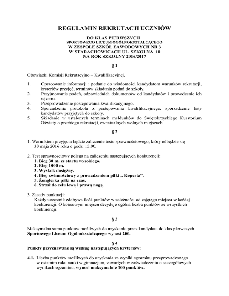 REGULAMIN REKRUTACJI UCZNIÓW DO KLAS PIERWSZYCH SPORTOWEGO LICEUM OGÓLNOKSZTAŁCĄCEGO W ZESPOLE SZKÓŁ ZAWODOWYCH NR 3 W STARACHOWICACH UL. SZKOLNA 10 NA ROK SZKOLNY 2016/2017 §1 Obowiązki Komisji Rekrutacyjno – Kwalifikacyjnej. 1. 2. 3. 4. 5. Opracowanie informacji i podanie do wiadomości kandydatom warunków rekrutacji, kryteriów przyjęć, terminów składania podań do szkoły. Przyjmowanie podań, odpowiednich dokumentów od kandydatów i prowadzenie ich rejestru. Przeprowadzenie postępowania kwalifikacyjnego. Sporządzenie protokołu z postępowania kwalifikacyjnego, sporządzenie listy kandydatów przyjętych do szkoły. Składanie w ustalonych terminach meldunków do Świętokrzyskiego Kuratorium Oświaty o przebiegu rekrutacji, ewentualnych wolnych miejscach. §2 1. Warunkiem przyjęcia będzie zaliczenie testu sprawnościowego, który odbędzie się 30 maja 2016 roku o godz. 15.00. 2. Test sprawnościowy polega na zaliczeniu następujących konkurencji: 1. Bieg 30 m. ze startu wysokiego. 2. Bieg 1000 m. 3. Wyskok dosiężny. 4. Bieg zwinnościowy z prowadzeniem piłki „ Koperta”. 5. Żonglerka piłki na czas. 6. Strzał do celu lewą i prawą nogą. 3. Zasady punktacji: Każdy uczestnik zdobywa ilość punktów w zależności od zajętego miejsca w każdej konkurencji. O końcowym miejscu decyduje ogólna liczba punktów ze wszystkich konkurencji. §3 Maksymalna suma punktów możliwych do uzyskania przez kandydata do klas pierwszych Sportowego Liceum Ogólnokształcącego wynosi 200. §4 Punkty przyznawane są według następujących kryteriów: 4.1. Liczba punktów możliwych do uzyskania za wyniki egzaminu przeprowadzonego w ostatnim roku nauki w gimnazjum, zawartych w zaświadczeniu o szczegółowych wynikach egzaminu, wynosi maksymalnie 100 punktów. 4.2. Liczba punktów możliwych do uzyskania za oceny z zajęć edukacyjnych wynosi maksymalnie 80 punktów. 4.2.1. 1. 2. 3. 4. Punkty są przyznawane za oceny z następujących zajęć edukacyjnych: język polski , matematyka, język niemiecki/angielski biologia 4.2.2. Punkty są obliczane według następujących zasad: 1. 2. 3. 4. 5. za każdą ocenę celującą kandydat otrzymuje 20 punktów, za każdą ocenę bardzo dobrą kandydat otrzymuje 16 punktów, za każdą ocenę dobrą kandydat otrzymuje 12 punktów, za każdą ocenę dostateczną kandydat otrzymuje 8 punktów, za każdą ocenę dopuszczającą kandydat otrzymuje 2 punkty. 4.3. Liczba punktów możliwych do uzyskania za osiągnięcia kandydata wymienione na świadectwie ukończenia gimnazjum i potwierdzone stosownymi zaświadczeniami wynosi maksymalnie 20. 4.3.1. Punkty są przyznawane za niżej wymienione osiągnięcia, według następujących zasad: 1. Za świadectwo z wyróżnieniem maksymalnie 5 pkt. 2. Szczególne osiągnięcia ucznia wymienione na świadectwie: -potwierdzone osiągnięcia- co najmniej na szczeblu wojewódzkim w konkursach wiedzy organizowanych przez kuratora oświaty: a) finaliści jednego konkursu przedmiotowego - 7 pkt. b) finaliści dwóch lub więcej konkursów przedmiotowych - 10 pkt. 3. Konkursy tematyczne o zasięgu ponadwojewódzkim organizowane przez kuratorów na podstawie zawartych porozumień: a) laureat 7 pkt. b) finalista 5 pkt. 4. Potwierdzone osiągnięcia sportowe – maksymalnie 3 pkt. (zgodnie z wykazem dyscyplin zał.1): a) na szczeblu powiatowym ( rejonowym) za miejsca dające awans do finału wojewódzkiego – 2 pkt. lub b) na szczeblu wojewódzkim za miejsca: I, II, III - 3 pkt. 5. potwierdzone osiągnięcia artystyczne – maksymalnie 3 pkt. a) na szczeblu powiatowym – 1 pkt. lub b) na szczeblu wojewódzkim - 3 pkt. c) na szczeblu krajowym -3 pkt. d) na szczeblu między narodowym 4 pkt. 5. Osiągnięcia w aktywności na rzecz innych ludzi, zwłaszcza w formie wolontariatu ( udokumentowana działalność ) maksymalnie 2 pkt. §5 1. Laureaci i finaliści ogólnopolskich olimpiad przedmiotowych oraz laureaci konkursów o zasięgu wojewódzkim i ponadwojewódzkim, których program obejmuje w całości lub poszerza treści podstawy programowej, co najmniej z jednego przedmiotu, przyjmowani są na wybrany zawód po spełnieniu § 2 niezależnie od kryteriów, o których mowa w § 3 i § 4. 2. Konkursami, o których mowa w ust.1 są konkursy przedmiotowe dla gimnazjalistów. Lista konkursów przedmiotowych organizowanych przez Świętokrzyskiego Kuratora Oświaty w roku szkolnym 2014/2015: 1) język polski 2) język angielski 3) język niemiecki 4) język rosyjski 5) historia 6) matematyka 7) fizyka 8) biologia 9) chemia 10) geografia 11) informatyka. §6 W przypadku większej liczby kandydatów niż miejsc o przyjęciu decyduje większa ilość otrzymanych punktów. Jeżeli ilość punktów u kilku kandydatów jest jednakowa o przyjęciu decyduje lepsza ocena z zachowania. §7 Ustala się minimalną ilość punktów, którą kandydat powinien otrzymać na poziomie 30. §8 Rekrutacja rozpoczyna się 11.04.2016r. §9 Niżej wymienione dokumenty kandydaci składają wyłącznie w sekretariacie szkoły przy ulicy Szkolnej 10 w Starachowicach w godzinach od 8.00 do 14.00 : 1. Podanie + 3 zdjęcia + numer PESEL. 2. Kartę zdrowia. 3. Kopię świadectwa ukończenia gimnazjum i zaświadczenia o szczegółowych wynikach egzaminu / kopie ponumerowane i potwierdzone przez dyrektora / § 10 1. Składanie wniosków o przyjęcie do szkoły – druk potwierdzający rejestrację w systemie komputerowego wspomagania rekrutacji. od 11 kwietnia do 28 czerwca 2016 r. 2. Przeprowadzenie prób sprawności fizycznej 30 maja 2016r. 3. Podanie do publicznej wiadomości prze komisję rekrutacyjną listy kandydatów, którzy uzyskali pozytywne wyniki: prób sprawności fizycznej do 8 czerwca 2016 r 3. Doręczanie przez kandydatów do szkoły kopii świadectwa ukończenia szkoły, kopii zaświadczeń o wynikach egzaminu gimnazjalnego poświadczonych przez dyrektora gimnazjum, które ukończył kandydat od 24 do 28 czerwca 2016 r. 4.