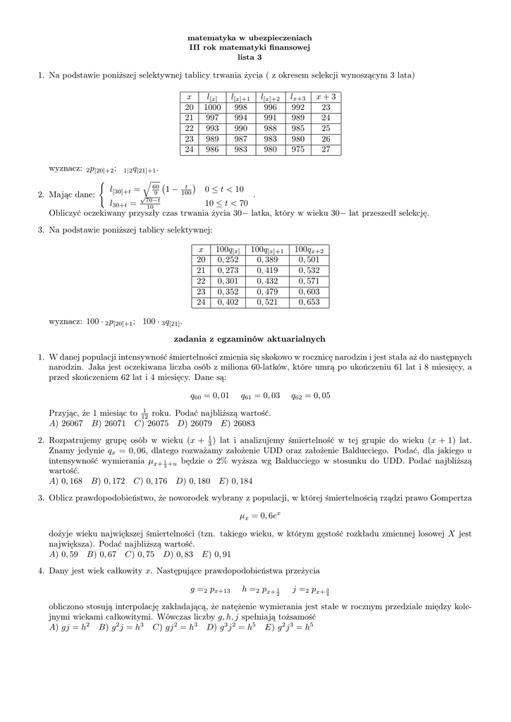 matematyka w ubezpieczeniach III rok matematyki finansowej lista 3 1. Na podstawie poniższej selektywnej tablicy trwania życia ( z okresem selekcji wynoszącym 3 lata) x 20 21 22 23 24 l[x] 1000 997 993 989 986 l[x]+1 998 994 990 987 983 l[x]+2 996 991 988 983 980 lx+3 992 989 985 980 975 x+3 23 24 25 26 27 wyznacz: 2 p[20]+2 ; 1|2 q[21]+1 . q ( t l[30]+t = 60 1 − 100 0 ≤ t < 10 9 2. Mając dane: . √ 70−t 10 ≤ t < 70 l30+t = 10 Obliczyć oczekiwany przyszły czas trwania życia 30− latka, który w wieku 30− lat przeszedł selekcję. 3. Na podstawie poniższej tablicy selektywnej: x 20 21 22 23 24 100q[x] 0, 252 0, 273 0, 301 0, 352 0, 402 100q[x]+1 0, 389 0, 419 0, 432 0, 479 0, 521 100qx+2 0, 501 0, 532 0, 571 0, 603 0, 653 wyznacz: 100 · 2 p[20]+1 ; 100 · 3 q[21] . zadania z egzaminów aktuarialnych 1. W danej populacji intensywność śmiertelności zmienia się skokowo w rocznicę narodzin i jest stała aż do następnych narodzin. Jaka jest oczekiwana liczba osób z miliona 60-latków, które umrą po ukończeniu 61 lat i 8 miesięcy, a przed skończeniem 62 lat i 4 miesięcy. Dane są: q60 = 0, 01 q61 = 0, 03 q62 = 0, 05 1 Przyjąc, że 1 miesiąc to 12 roku. Podać najbliższą wartość. A) 26067 B) 26071 C) 26075 D) 26079 E) 26083 2. Rozpatrujemy grupę osób w wieku (x + 13 ) lat i analizujemy śmiertelność w tej grupie do wieku (x + 1) lat. Znamy jedynie qx = 0, 06, dlatego rozważamy założenie UDD oraz założenie Balducciego. Podać, dla jakiego u intensywność wymierania µx+ 31 +u będzie o 2% wyższa wg Balducciego w stosunku do UDD. Podać najbliższą wartość. A) 0, 168 B) 0, 172 C) 0, 176 D) 0, 180 E) 0, 184 3. Oblicz prawdopodobieństwo, że noworodek wybrany z populacji, w której śmiertelnością rządzi prawo Gompertza µx = 0, 6ex dożyje wieku największej śmiertelności (tzn. takiego wieku, w którym gęstość rozkładu zmiennej losowej X jest największa). Podać najbliższą wartość. A) 0, 59 B) 0, 67 C) 0, 75 D) 0, 83 E) 0, 91 4. Dany jest wiek całkowity x. Następujące prawdopodobieństwa przeżycia g =2 px+13 h =2 px+ 21 j =2 px+ 34 obliczono stosują interpolację zakładającą, że natężenie wymierania jest stałe w rocznym przedziale między kolejnymi wiekami całkowitymi. Wówczas liczby g, h, j spełniają tożsamość A) gj = h2 B) g 2 j = h3 C) gj 2 = h3 D) g 3 j 2 = h5 E) g 2 j 3 = h5 5. Dany jest wiek całkowity x oraz 3 px = 0, 83904 2 px+ 12 = 0, 893388 px+1 = 0, 95 Oblicz px oraz px+2 stosując założenie o jednostajnym rozkładzie śmierci w ciągu roku. Podać najbliższą wartość. A) px = 0, 94 px+2 = 0, 92 B) px = 0, 96 px+2 = 0, 94 C) px = 0, 96 px+2 = 0, 92 D) px = 0, 98 px+2 = 0, 94 E) px = 0, 98 px+2 = 0, 91 6. Rozważamy dwie niezależne populacje, w których śmiertelnością rządzi prawo Gompertza x µ(1) x = B2 x µ(2) x = 2B8 (1) wiemy, że P (X (2) ≤ 50) = 13 . Oblicz 150 p1 . Podać najbliższą wartość. A) 0, 10 B) 0, 15 C) 0, 20 D) 0, 25 E) 0, 30 7. W populacji osób urodzonych 1 stycznia, dla pewnego całkowitego wieku x, prawdopodobieństwo qx = 0, 6. Podać, którego dnia roku (rok ma 365 dni) nastapi zrównanie: prawdopodobieństwa śmierci u qx u ∈ [0, 1), wyznaczonego przy hipotezie Balducciego z prawdopodobieństwem przeżycia u px wyznaczonym przy jednostajnym rozkładzie zgonów w x-tym roczniku. 8. Rozważmy grupę 1000 osób urodzonych 1 kwietnia 1950 roku, żyjących 1 stycznia 2001. Wyznaczyć dalsze trwanie życia tych osób (sumę przeżytych lat) w okresie od 1 stycznia 2001 do 31 grudnia 2002, jeżeli wiadomo, że w tej populacji intensywność zgonów jest funkcją schodkową ze skokiem w każdą rocznicę urodzin i stałym poziomem aż do następnych urodzin. Dane są: q50 = 0, 10 Podać najbliższą wartość. A) 1587 B) 1632 C) 1687 D) 1717 q51 = 0, 15 q52 = 0, 20 E) 1842 9. Wyznacz prawdopodobieństwo przeżycia przez osobę 55-letnią co najmniej 10 lat, jeśli analogiczne prawdopodobieństwo dla osoby 25-letniej wynosi 0,8 oraz natężenie zgonów opisuje funkcja µx = kx dla x > 0 A) 0, 40 B) 0, 64 C) 0, 80 D) 0, 81 E) 0, 90 10. Rozpatrzmy osobę, która ukończyła 1 stycznia 1998 roku 30 lat. Przy założeniu Balducciego (1−u qx+u = (1 − u)qx dla całkowitego x i u ∈ [0, 1]) prawdopodobieństwo śmierci tej osoby w ciągu pierwszych 170 dni roku 2028 jest równe prawdopodobieństwu jej śmierci w pozostałej części tego roku. Znajdź p60 (podaj najbliższą liczbę). Przyjmujemy, że 1 rok = 365 dni. A) dane są sprzeczne B) 0, 77 C) 0, 82 D) 0, 87 E) 0, 92 ◦ ◦ 11. Znajdź ex wiedząc, że px = 0, 9 oraz ex+1 = 35, 2. Zakładamy liniowy rozkład umieralności w przedziale (x, x + 1). Podaj najbliższą wartość. A) 31, 7 B) 32, 6 C) 34, 6 D) 35, 7 E) 36, 1 12. Oczekiwane dalsze trwanie życia osoby w wieku x wynosi ex = E(K(x)) = 28, 5 roku. Znajdź px , jeśli ex+1 = 27, 7 roku. Podaj najbliższą wartość. A) 0, 99011 B) 0, 99125 C) 0, 99278 D) 0, 99303 E) za mało danych 13. Natężenie zgonów opisuje funkcja µx+t = bex+t gdzieb > 0 Dla jakiej wartości parametru b prawdopodobieństwo tego, że 30-latek przeżyje następne 10 lat, po czym umrze w ciągu kolejnych 5 lat, wynosi r, oraz prawdopodobieństwo 10 p30 = 5r ln5−ln2 ln5−2ln2 A) ln2(eln5 B) 2ln2(eln5 C) 2(e D) 2(e E) ln5−2ln2 45 −e40 ) 45 −e40 ) 45 −e40 ) 45 −e40 ) e45 −e40 14. W danej populacji intensywność śmiertelności mężczyzn jest dla każdego wieku o połowę wyższa niż w przypadku kobiet. Oblicz prawdopodobieństwo, że losowo wybrany mężczyzna w wieku (x) będzie żył co najmniej tak długo jak losowo wybrana kobieta w wieku (x). A) 0, 27 B) 0, 30 C) 0, 33 D) 0, 37 E) 0, 40 15. W danej populacji śmiertelnością rządzi prawo de Moivre’a z wiekiem granicznym ω. O wieku x wiadomo, że osoby starsze w tym wieku umierają w ciągu doby dwa razy rzadziej niż osoby dwukrotnie starsze. Oblicz prawdopoodbieństwo, że osoba w wieku x dożyje wieku 2x