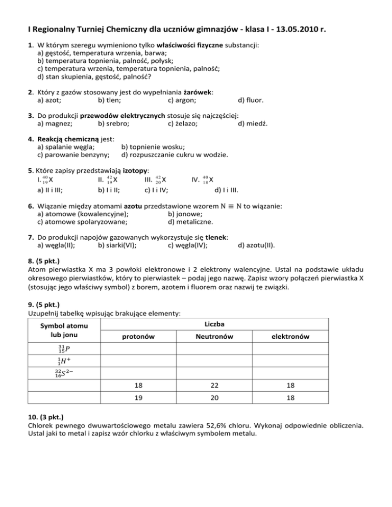 I Regionalny Turniej Chemiczny dla uczniów gimnazjów - klasa I - 13.05.2010 r. 1. W którym szeregu wymieniono tylko właściwości fizyczne substancji: a) gęstość, temperatura wrzenia, barwa; b) temperatura topnienia, palność, połysk; c) temperatura wrzenia, temperatura topnienia, palność; d) stan skupienia, gęstość, palność? 2. Który z gazów stosowany jest do wypełniania żarówek: a) azot; b) tlen; c) argon; d) fluor. 3. Do produkcji przewodów elektrycznych stosuje się najczęściej: a) magnez; b) srebro; c) żelazo; d) miedź. 4. Reakcją chemiczną jest: a) spalanie węgla; b) topnienie wosku; c) parowanie benzyny; d) rozpuszczanie cukru w wodzie. 5. Które zapisy przedstawiają izotopy: I. 40 II. 42 III. 42 19 X 19 X 20 X a) II i III; b) I i II; c) I i IV; IV. 40 18 X d) I i III. 6. Wiązanie między atomami azotu przedstawione wzorem a) atomowe (kowalencyjne); b) jonowe; c) atomowe spolaryzowane; d) metaliczne. 7. Do produkcji napojów gazowanych wykorzystuje się tlenek: a) węgla(II); b) siarki(VI); c) węgla(IV); to wiązanie: d) azotu(II). 8. (5 pkt.) Atom pierwiastka X ma 3 powłoki elektronowe i 2 elektrony walencyjne. Ustal na podstawie układu okresowego pierwiastków, który to pierwiastek – podaj jego nazwę. Zapisz wzory połączeń pierwiastka X (stosując jego właściwy symbol) z borem, azotem i fluorem oraz nazwij te związki. 9. (5 pkt.) Uzupełnij tabelkę wpisując brakujące elementy: Symbol atomu lub jonu Liczba protonów Neutronów elektronów 18 22 18 19 20 18 10. (3 pkt.) Chlorek pewnego dwuwartościowego metalu zawiera 52,6% chloru. Wykonaj odpowiednie obliczenia. Ustal jaki to metal i zapisz wzór chlorku z właściwym symbolem metalu. Klucz odpowiedzi Zadania zamknięte 1-7 – 7 x 1 pkt. 1 a; 2 c; 3 d; 4 a; 5 b; 6 a; 7 c Zad. 8 max. 5 pkt. Za podanie nazwy pierwiastka (magnez) Za podanie wszystkich wzorów i nazwy (6 elementów) 5 elementów 4-3 elementy 2-1 element Mg3B2 – borek magnezu Mg3N2 – azotek magnezu MgF2 – fluorek magnezu Zad. 9 max. 5 pkt. Za każdy poprawnie uzupełniony wiersz 5 x 1 pkt. Symbol atomu lub jonu protonów 15 1 16 – 1 pkt. – 4 pkt. – 3 pkt. (np. bez jednej nazwy) – 2 pkt. – 1 pkt. Liczba Neutronów 16 0 16 elektronów 15 0 18 Zad. 10 max. 3 pkt. Za obliczenie masy atomowej pierwiastka - 2 pkt. ( metoda obliczania 1 pkt.; poprawność rachunkowa (1 pkt.) Przykładowe rozwiązanie: 100% - 52,6% = 47,4% (zawartość metalu w chlorku) Za ustalenie, który to metal – podanie wzoru chlorku z właściwym symbolem metalu CuCl2 (zaliczamy również podanie nazwy metalu lub symbolu). Maksymalna liczba punktów do uzyskania 20.