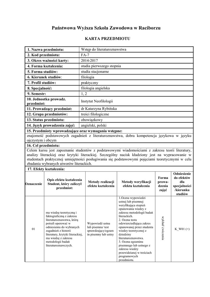 Państwowa Wyższa Szkoła Zawodowa w Raciborzu KARTA PRZEDMIOTU Wstęp do literaturoznawstwa 1. Nazwa przedmiotu: FA-7 2. Kod przedmiotu: 2014-2017 3. Okres ważności karty: studia pierwszego stopnia 4. Forma kształcenia: studia stacjonarne 5. Forma studiów: 6. Kierunek studiów: filologia praktyczny 7. Profil studiów: filologia angielska 8. Specjalność: 1, 2 9. Semestr: 10. Jednostka prowadz. Instytut Neofilologii przedmiot: dr Katarzyna Rybińska 11. Prowadzący przedmiot: treści filologiczne 12. Grupa przedmiotów: 13. Status przedmiotu: obowiązkowy 14. Język prowadzenia zajęć: angielski, polski 15. Przedmioty wprowadzające oraz wymagania wstępne: znajomość podstawowych zagadnień z literaturoznawstwa, dobra kompetencja językowa w języku ojczystym i obcym 16. Cel przedmiotu: Celem kursu jest zapoznanie studentów z podstawowymi wiadomościami z zakresu teorii literatury, analizy literackiej oraz krytyki literackiej. Szczególny nacisk kładziony jest na wypracowanie w studentach praktycznej umiejętności posługiwania się podstawowymi pojęciami teoretycznymi w celu zbadania wybranych utworów literackich. 17. Efekty kształcenia: 01 Opis efektu kształcenia Student, który zaliczył przedmiot: ma wiedzę teoretyczną i faktograficzną z zakresu literaturoznawstwa, którą potrafi operować w odniesieniu do wybranych zagadnień z historii literatury, krytyki literackiej, ma wiedzę z zakresu metodologii badań literaturoznawczych. Metody realizacji efektu kształcenia Metody weryfikacji efektu kształcenia Wypowiedź ustna lub pisemna/ test sprawdzający/egzam in pisemny lub ustny 1.Ocena wypowiedzi ustnej lub pisemnej weryfikująca stopień opanowania wiedzy z zakresu metodologii badań literackich. 2. Ocena testu odzwierciedlająca zakres opanowanej przez studenta wiedzy teoretycznej z dziedziny literaturoznawstwa. 3. Ocena egzaminu pisemnego lub ustnego z zakresu wiedzy przewidzianej w treściach programowych przedmiotu. wykład/ ćwiczenia Oznaczenie Forma prowadzenia zajęć Odniesienie do efektów dla specjalności /kierunku studiów K_W01 (+) 03 ma wiedzę z zakresu metodologii interpretacji dzieł literackich z uwzględnieniem ich kontekstu kulturowego i historycznego w odniesieniu do wybranych utworów literackich. Prezentacja/ wypowiedź kontrolna w formie pisemnej 04 ma wiedzę z zakresu teorii dzieła literackiego i jego odbioru oraz pojęć z zakresu poetyki w odniesieniu do wybranych utworów literackich. Wypowiedź ustna/ esej semestralny K_W02 (++) K_W07 (++) wykład, ćwiczenia Wypowiedź ustna i pisemna/ egzamin pisemny lub ustny wykład, ćwiczenia zna terminologię z zakresu literaturoznawstwa potrzebną do analizy dzieł literackich. wykład, ćwiczenia 02 1. Ocena wypowiedzi ustnej w formie np. dialogu, dyskusji, wywiadu, komentarza, recenzji pozwalająca ocenić stopień znajomości terminologii z zakresu literaturoznawstwa przy jednoczesnym uwzględnieniu umiejętności jej praktycznego zastosowania w odniesieniu do analizy wybranego dzieła literackiego. 2. Ocena wypowiedzi pisemnej sprawdzająca znajomość aparatu pojęciowego i definicji teoretyczno-literackich. 3. Ocena egzaminu pisemnego lub ustnego z zakresu wiedzy przewidzianej w treściach programowych przedmiotu. 1. Ocena prezentacji odzwierciedlająca stopień praktycznego opanowania wiedzy z zakresu wybranych metod interpretacji dzieł literackich. 2. Ocena wypowiedzi kontrolnej w formie pisemnej (np. analiza stylistyczno- strukturalna tekstu literackiego) sprawdzająca znajomość metodologii badań filologicznych z uwzględnieniem ich kontekstu kulturowohistorycznego. 1.Ocena wypowiedzi ustnej odzwierciedlająca stopień zaawansowania poznanych zasad i teorii z zakresu dzieła literackiego i jego odbioru. 2.Ocena eseju semestralnego dokumentująca zastosowanie praktyczne wiedzy teoretycznoliterackiej w odniesieniu do przeprowadzonej analizy wybranego i określonego tematem eseju dzieła literackiego. K_W08 (+++) 07 posiada umiejętność posługiwania się językiem specjalistycznym w trakcie analizy wybranych dzieł literackich. Wypowiedź ustna lub pisemna 08 potrafi ocenić poziom swoich kompetencji w zakresie literaturoznawstwa, rozwijać swoje umiejętności badawcze, pracować w grupie, aktywnie uczestniczyć w dyskusji, formułować obiektywne, przekonywujące poglądy/argumenty Wypowiedź ustna/dyskusja z wykorzystaniem samooceny własnych kompetencji badawczych. Ocena wypowiedzi ustnej/dyskusji sprawdzająca poczynione przez studenta postępy z dziedziny literaturoznawstwa w trakcie trwania zajęć. K_U09 (+++) K_U012 (+++) ćwiczenia Opracowanie dossier tematycznego ćwiczenia 06 potrafi ocenić przydatność typowych metod, procedur i dobrych praktyk do realizacji zadań z obszaru literaturoznawstwa. K_U03 (++) ćwiczenia Analiza tekstu literackiego ustna lub pisemna/ ćwiczenia ustne lub pisemne ćwiczenia 05 potrafi zastosować podstawowe terminy i pojęcia w praktyce w celu analizy wybranych utworów literackich. 1.Ocena analizy tekstu literackiego ustna lub pisemna sprawdzająca umiejętność wykorzystania nabytej przez studenta wiedzy teoretycznej oraz zapamiętanych przezeń definicji teoretycznoliterackich. 2. Ocena ćwiczeń ustnych lub pisemnych odzwierciedlająca umiejętność doboru właściwego aparatu pojęciowego w trakcie analizy wybranego tekstu. Ocena dossier tematycznego weryfikująca nabytą przez studenta umiejętność dostosowania metod, procedur i praktyk filologicznych do określonego tematyką zagadnienia. Ocena wypowiedzi ustnej lub pisemnej sprawdzająca stopień opanowania przez studenta podstawowych pojęć teoretycznych i terminologicznych na podstawie dokonanej przezeń analizy wybranego fragmentu z prozy, dramatu lub poezji. K_K01 (++) 18. Formy i wymiar zajęć: W. (15h + 15h) Ćw. (15h + 15h) 19. Treści kształcenia: What is literature? Literature and literary study. Fiction: some elements of a short story – escape and interpret