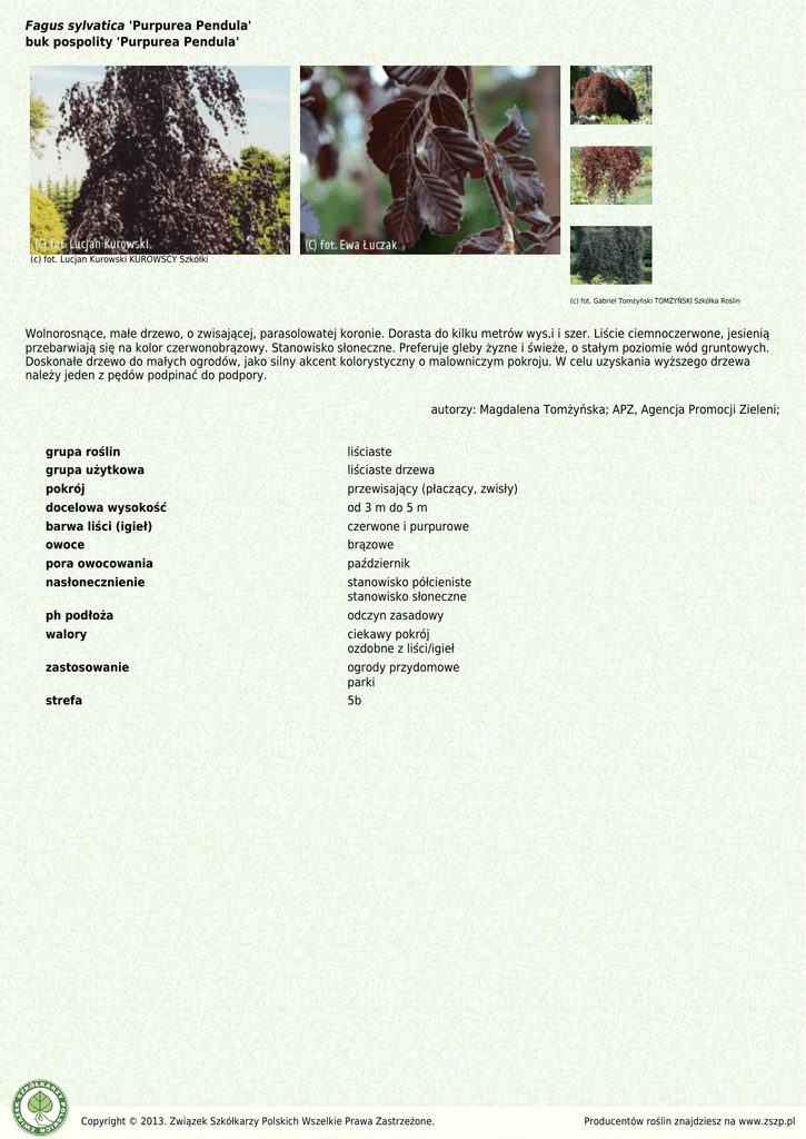 Fagus sylvatica 'Purpurea Pendula' buk pospolity 'Purpurea Pendula' (c) fot. Lucjan Kurowski KUROWSCY Szkółki (c) fot. Gabriel Tomżyński TOMŻYŃSKI Szkółka Roślin Wolnorosnące, małe drzewo, o zwisającej, parasolowatej koronie. Dorasta do kilku metrów wys.i i szer. Liście ciemnoczerwone, jesienią przebarwiają się na kolor czerwonobrązowy. Stanowisko słoneczne. Preferuje gleby żyzne i świeże, o stałym poziomie wód gruntowych. Doskonałe drzewo do małych ogrodów, jako silny akcent kolorystyczny o malowniczym pokroju. W celu uzyskania wyższego drzewa należy jeden z pędów podpinać do podpory. autorzy: Magdalena Tomżyńska; APZ, Agencja Promocji Zieleni; grupa roślin liściaste grupa użytkowa liściaste drzewa pokrój przewisający (płaczący, zwisły) docelowa wysokość od 3 m do 5 m barwa liści (igieł) czerwone i purpurowe owoce brązowe pora owocowania październik nasłonecznienie stanowisko półcieniste stanowisko słoneczne ph podłoża odczyn zasadowy walory ciekawy pokrój ozdobne z liści/igieł zastosowanie ogrody przydomowe parki strefa 5b Copyright © 2013. Związek Szkółkarzy Polskich Wszelkie Prawa Zastrzeżone. Producentów roślin znajdziesz na www.zszp.pl