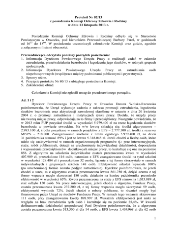 Protokół Nr 82/13 z posiedzenia Komisji Ochrony Zdrowia i Rodziny w dniu 13 listopada 2013 r. Posiedzenie Komisji Ochrony Zdrowia i Rodziny odbyło się w Starostwie Powiatowym w Otwocku, pod kierunkiem Przewodniczącej Barbary Parol, w godzinach od 1615 do 1800. W posiedzeniu uczestniczyli członkowie Komisji oraz goście, zgodnie z załączonymi listami obecności. Przewodnicząca odczytała poniższy porządek posiedzenia: 1. Informacja Dyrektora Powiatowego Urzędu Pracy o realizacji zadań w zakresie zatrudnienia, przeciwdziałania bezrobociu i łagodzenia jego skutków, w różnych grupach społecznych. 2. Informacja Dyrektora Powiatowego Urzędu Pracy nt. zatrudniania osób niepełnosprawnych (współpraca między podmiotami publicznymi i prywatnymi). 3. Sprawy różne. 4. Przyjęcie protokołu Nr 80/13 z ubiegłego posiedzenia Komisji. 5. Zakończenie obrad. Członkowie Komisji nie zgłosili uwag do przedstawionego porządku. Ad. 1 i 2 Dyrektor Powiatowego Urzędu Pracy w Otwocku Danuta Wolska-Rzewuska poinformowała, że Urząd wykonuje zadania z zakresu promocji zatrudnienia, łagodzenia skutków bezrobocia oraz aktywizacji zawodowej określone w ustawie z dnia 20 kwietnia 2004 r. o promocji zatrudnienia i instytucjach rynku pracy. Dodała, że urzędy pracy nie tworzą miejsc pracy, odpowiadają za to firmy i przedsiębiorcy. Następnie powiedziała, że w 2013 roku PUP pozyskał środki w wysokości 5.979.400 zł na rzecz łagodzenia skutków bezrobocia w powiecie otwockim. Na w/w kwotę składają się: środki algorytmowe – 2.983.100 zł, środki pozyskane w ramach projektów z EFS – 2.777.500 zł, środki z rezerwy MPiPS – 218.800. Zaangażowanie środków z limitu ogólnego 5.979.400 zł, na dzień 31 października stanowi 89% i jest to kwota 5.318.048 zł. Jeżeli chodzi o liczbę osób, które udało się zaaktywizować w ramach organizowanych programów tj.: prac interwencyjnych, staży, robót publicznych, dotacji na uruchomienie indywidualnej działalności, doposażenia i wyposażenia przedsiębiorców dodatkowych miejsc pracy, to kształtuje się ona na poziomie 856. Z algorytmu na szkolenia indywidualne została przeznaczona kwota w wysokości 407.909 zł, przeszkolono 116 osób, natomiast z EFS zaangażowano środki na tytuł szkoleń w wysokości 128.484 zł i przeszkolono 32 osoby, łącznie z tej formy skorzystało w ramach indywidualnych i grupowych szkoleń 148 osób. Efektywność szkoleń wyniosła 100% (po uruchomionej formie zostało podjęte zatrudnienie). Dyrektor poinformowała, że jeżeli chodzi o staże, to z algorytmu została przeznaczona kwota 861.750 zł, dzięki czemu z tej formy wsparcia mogło skorzystać 180 osób, działanie na koniec października przyniosło efektywność w wysokości 63%. Kwota przeznaczona na staże z EFS stanowiła 1.033.889 zł, staż odbyło 150 osób. Na prace interwencyjne, jeżeli chodzi o algorytm, Fundusz Pracy, została przeznaczona kwota 237.200 zł, z tej formy wsparcia mogło skorzystać 59 osób, efektywność wyniosła 72%. Jeżeli chodzi o roboty publiczne, to również mogły być finansowane przez Urząd ze środków Funduszu Pracy. W ramach tego wsparcia skierowano 111 osób, przy zaangażowaniu kwoty 898.997 zł. Wskaźnik efektywności jest niski ze względu na brak zatrudnienia tych osób i kształtuje się na poziomie 25,4%. W kwestii dofinansowania działalności gospodarczej Pani Dyrektor poinformowała, że z algorytmu została przeznaczona kwota 313.500 zł dla 14 osób, z EFS kwota 1.469.968 zł dla 62 osób 1 (efektywność 100%, ponieważ bezrobotni w ramach uruchomienia działalności gospodarczych tworzą dla siebie samozatrudnienie). Przedsiębiorcy mogli złożyć wnioski o wyposażenie i doposażenie stanowiska pracy. Dyrektor nadmieniła, iż od stycznia do października br. wpłynęło 957 wniosków o wsparcie w ramach w/w form aktywizacji osób bezrobotnych, zawarto 387 umów, ogółem skierowano 856 osób. Dyrektor poinformowała, iż aktualnie stopa bezrobocia na dzień 31 października br. kształtuje się na poziomie 9,8%, natomiast w 2012 roku – 10%. W październiku br. w PUP: zarejestrowały się 574 osoby (przy czym średnio w ubiegłych latach rejestrowało się 400-500 osób), wyłączono z ewidencji 673 osoby, podjęły pracę 288 osoby, staż – 40 osób, na szkolenia zostały skierowane – 24 osoby; niestawiennictwo 232 osoby. Aktualnie w ewidencji figuruje zarejestrowanych 4368 osób (w rozbiciu na gminy przedstawia się to następująco z: Otwocka 1871 osób, Józefowa 608 osób, Karczewa 597 osób, Celestynowa 426 osób, Wiązowny 337 osób, Kołbieli 228 osób, Osiecka 118 osób, Sobień-Jezior 183 osoby), w tym z prawem do zasiłku: 808 osób, natomiast bez prawa do zasiłku: 3560 osób. Najwięcej bezrobotnych to osoby młode w wieku 25-34 lata tj. 1125 osób, czyli 25,8% ogółu bezrobotnych. Od stycznia br. PUP zarejestrował 5192 osób (ok. 519 osób w miesiącu), wyłączył z ewidencji ogółem 5248 osób (średnio miesięcznie – 525 osób). Zatrudnienie podjęło 2196 osób. Wydanych zostało już 14417 decyzji administracyjnych oraz 8930 zaświadczeń. Dyrektor poinformowała o działaniach podjętych na rzecz usprawnienia pracy, mianowicie od 25 maja br. można dokonywać rejestracji internetowych, poza tym został wdrożony system kolejkowy. Celem usprawnienia współpracy z ośrodkami pomocy społecznej Dyrektor pozyskała środki z Ministerstwa na wprowadzenie platformy SEPI (Samorządowa Elektroniczna Platforma Informacyjna). Pani Dyrektor poinformowała również o dodatkowych zadaniach, które wprowadzi z dniem 1 stycznia 2014 r. ustawa. Zapowiedziała, że na pewno wystąpi do członków Komisji o poparcie wniosku o zwiększenie zatrudnienia w Urzędzie. Powiedziała, iż jednym z założeń na przyszły rok jest utworzenie stowarzyszenia przedsiębiorców, ewentualnie fundacji. Dyrektor ma nadzieję, że dojdzie do skutku zawiązanie p