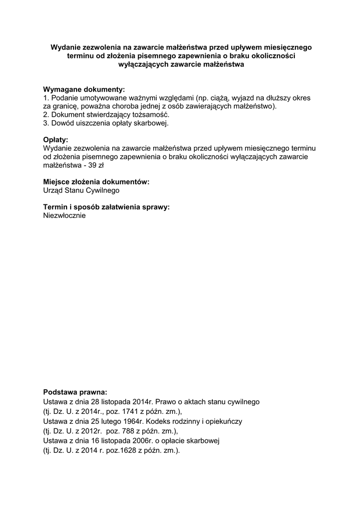 Wydanie zezwolenia na zawarcie małżeństwa przed upływem miesięcznego terminu od złożenia pisemnego zapewnienia o braku okoliczności wyłączających zawarcie małżeństwa Wymagane dokumenty: 1. Podanie umotywowane ważnymi względami (np. ciążą, wyjazd na dłuższy okres za granicę, poważna choroba jednej z osób zawierających małżeństwo). 2. Dokument stwierdzający tożsamość. 3. Dowód uiszczenia opłaty skarbowej. Opłaty: Wydanie zezwolenia na zawarcie małżeństwa przed upływem miesięcznego terminu od złożenia pisemnego zapewnienia o braku okoliczności wyłączających zawarcie małżeństwa - 39 zł Miejsce złożenia dokumentów: Urząd Stanu Cywilnego Termin i sposób załatwienia sprawy: Niezwłocznie Podstawa prawna: Ustawa z dnia 28 listopada 2014r. Prawo o aktach stanu cywilnego (tj. Dz. U. z 2014r., poz. 1741 z późn. zm.), Ustawa z dnia 25 lutego 1964r. Kodeks rodzinny i opiekuńczy (tj. Dz. U. z 2012r. poz. 788 z późn. zm.), Ustawa z dnia 16 listopada 2006r. o opłacie skarbowej (tj. Dz. U. z 2014 r. poz.1628 z późn. zm.).
