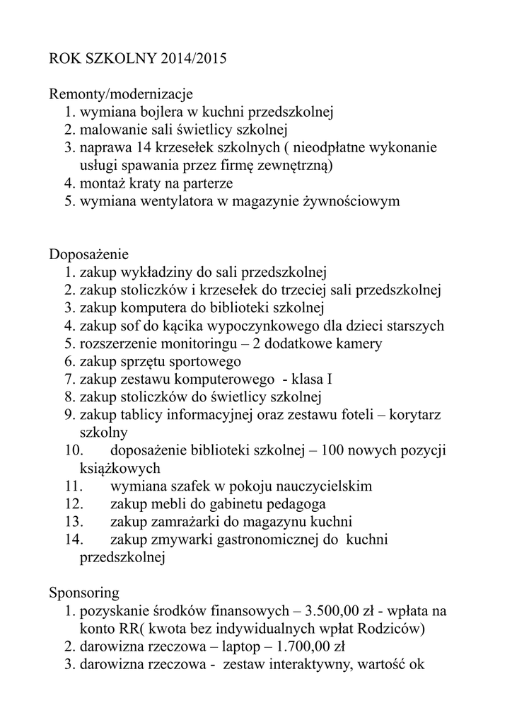 ROK SZKOLNY 2014/2015 Remonty/modernizacje 1. wymiana bojlera w kuchni przedszkolnej 2. malowanie sali świetlicy szkolnej 3. naprawa 14 krzesełek szkolnych ( nieodpłatne wykonanie usługi spawania przez firmę zewnętrzną) 4. montaż kraty na parterze 5. wymiana wentylatora w magazynie żywnościowym Doposażenie 1. zakup wykładziny do sali przedszkolnej 2. zakup stoliczków i krzesełek do trzeciej sali przedszkolnej 3. zakup komputera do biblioteki szkolnej 4. zakup sof do kącika wypoczynkowego dla dzieci starszych 5. rozszerzenie monitoringu – 2 dodatkowe kamery 6. zakup sprzętu sportowego 7. zakup zestawu komputerowego - klasa I 8. zakup stoliczków do świetlicy szkolnej 9. zakup tablicy informacyjnej oraz zestawu foteli – korytarz szkolny 10. doposażenie biblioteki szkolnej – 100 nowych pozycji książkowych 11. wymiana szafek w pokoju nauczycielskim 12. zakup mebli do gabinetu pedagoga 13. zakup zamrażarki do magazynu kuchni 14. zakup zmywarki gastronomicznej do kuchni przedszkolnej Sponsoring 1. pozyskanie środków finansowych – 3.500,00 zł - wpłata na konto RR( kwota bez indywidualnych wpłat Rodziców) 2. darowizna rzeczowa – laptop – 1.700,00 zł 3. darowizna rzeczowa - zestaw interaktywny, wartość ok 9.000,00 zł 4. darowizna rzeczowa - zestaw interaktywny, wartość ok 7.900,00 zł 5. darowizna rzeczowa – krata zewnętrzna 6. darowizna celowa – rozszerzenie monitoringu