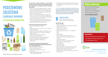 PODSTAWOWE ZAŁOŻENIA SEGREGACJI ODPADÓW na terenie Gminy Międzyzdroje Od 1 lipca 2013 r. każda nieruchomość, na terenie której prowadzona będzie selektywna zbiórka odpadów powinna zostać wyposażona w następujący komplet pojemników i/lub worków: • Pojemniki na zmieszane odpady komunalne – w jednolitym kolorze o odpowiednim oznaczeniu opisowym z wyłączeniem kolorów stosowanych do selektywnej zbiórki; • Pojemnik, ewentualnie worek zielony na szkło o odpowiednim oznaczeniu opisowym; • Pojemnik, ewentualnie worek w kolorze niebieskim na „frakcję suchą”, w którym gromadzone są: papier i tektura, tworzywa sztuczne, metal i opakowania wielomateriałowe tzn. kartoniki po sokach, mleku itp.; • Pojemnik, ewentualnie worek brązowy na odpady komunalne ulegające biodegradacji, w tym odpady kuchenne ulegające biodegradacji oraz odpady zielone. Na terenie Gminy prowadzona będzie zbiórka: • zmieszanych odpadów komunalnych, • szkła, • papieru i tektury, tworzyw sztucznych, metali, opakowań wielomateriałowych, • odpadów komunalnych ulegających biodegradacji, w tym odpadów opakowaniowych ulegających biodegradacji, odpadów zielonych, • przeterminowanych leków i chemikaliów, • zużytych baterii i akumulatorów, • zużytego sprzętu elektrycznego i elektronicznego, • mebli i innych odpadów wielkogabarytowych, • odpadów budowlanych i rozbiórkowych, • zużytych opon. Wskazówki dotyczące segregacji odpadów Pozostałe frakcje odpadów należy dostarczać do Punktu Selektywnego Zbierania Odpadów Komunalnych przy ul. Nowomyśliwskiej 86: • przeterminowane leki i chemikalia, • zużyte baterie i akumulatory, • zużyty sprzęt elektroniczny i elektryczny, • zużyte opony, • odpady wielkogabarytowe (dodatkowo 2 razy w roku w ramach zbiórki objazdowej), • odpady budowlane i rozbiórkowe (limit do 500 kg rocznie), • inne odpady problemowe (kabina prysznicowa, armatura łazienkowa). UWAGA! W przypadku zadeklarowania w deklaracji o wysokości opłaty za gospodarowanie odpadami komunalnymi prowadzenia kompostownika, nie jest konieczne posiadanie pojemnika/worka na odpady kuchenne ulegające biodegradacji. Zachęcamy do korzystania z kompostowników. FRAKCJA SUCHA papier i tektura, tworzywa sztuczne, metale i opakowania wielomateriałowe NALEŻY WRZUCAĆ • gazety i czasopisma, • prospekty, katalogi i reklamy, kalendarze i terminarze, • papierowe torby i worki, • zużyte zeszyty i stare książki, • papier biurowy i szkolny, • kartony i tekturę oraz zrobione z nich opakowania, • koperty, • mapy, • ścinki drukarskie, • zgniecione puszki aluminiowe po napojach, • puszki z blachy stalowej (po konserwach, owocach, napojach), • naczynia do gotowania, • drobny złom żelazny oraz drobny złom metali kolorowych (np. zabawki, narzędzia), • folię aluminiową, • folię opakowaniową, • pokrywki ze słoików, • kapsle z butelek oraz metalowe i plastikowe nakrętki, • zgniecione plastikowe opakowania po napojach, • plastikowe worki, torebki i reklamówki, • plastikowe koszyki po owocach i pojemniki po wyrobach garmażeryjnych, Więcej informacji dotyczących gospodarowania odpadami komunalnymi na terenie Gminy Międzyzdroje można znaleźć na stronie www.zosmiedzyzdroje.pl ZANIM WYRZUCISZ: • Opróżnij i oczyść opakowanie z resztek zawartości • Zgnieć butelki PET, kartony, pudełka i puszki • Nie rozbijaj odpadów ze szkła Zakład Ochrony Środowiska ul. Nowomyśliwska 86, 72-500 Międzyzdroje tel. (91) 328 08 73 • opakowania wielomateriałowe po płynnej żywności, takie jak kartony po mleku, sokach itp. – tzw. tetrapaki, • puste opakowania po kosmetykach i środkach czystości typu PE-LD i PE-HD – polietylen (po płynach do prania, do naczyń, szamponach, kosmetykach), • plastikowe opakowania po żywności (np. po jogurtach, serkach, kefirach, margarynach), • artykuły gospodarstwa domowego (szczoteczki, mydelniczki, wiaderka, miski, kosze). NIE WOLNO WRZUCAĆ • zabrudzonego, szczególnie zatłuszczonego papieru, • worków po cemencie, wapnie, klejach budowlanych, • papieru faxowego, termicznego i przebitkowego, • kalki technicznej, • odpadów higienicznych (np. wacików, podpasek, pieluch), • tapet, • papierowych worków z odkurzaczy, • papieru fotograficznego, • odpadów zawierających polichlorek winylu (PVC), • opakowania z zawartością, • baterii oraz puszek po farbach, • opakowań po lekach i aerozolach, • butelek i opakowań po olejach przemysłowych, • styropianu i innych tworzyw piankowych oraz gumy, • sprzętu AGD, • plastikowych szyb z pleksy, • opakowań po środkach chwastobójczych i owadobójczych, • materiałów poeksploatacyjnych z samochodów np.: deski rozdzielcze, zderzaki, lusterka, • odpadów problemowych. SZKŁO NALEŻY WRZUCAĆ • butelki i słoiki po napojach i żywności, • opakowania po kosmetykach, napojach alkoholowych (białe i kolorowe bez korków i zakrętek), • inne szklane przedmioty wykonane z grubego szkła (spodki pod szklanki, kufle itp.), • szklane flakony. NIE WOLNO WRZUCAĆ • ceramiki, fajansu, porcelany i kryształów, • szkła stołowego, żaroodpornego, okularowego, okiennego i zbrojonego, • doniczek, • szyb samochodowych, • luster, • żarówek, reflektorów, • luksferów (pustaków szklanych), • lamp fluorescencyjnych i neonowych, • ekranów i lamp telewizyjnych, • zniczy z woskiem, • szkła gospodarczego (misek, szklanych talerzy, figurek porcelanowych itp., np. naczyń typu arco), • odpadów problemowych, • szklanych opakowań farmaceutycznych, chemicznych z pozostałościami zawartości, • odpady ze szkła przemysłowego. BIOODPADY (odpady kuchenne i zielone) NALEŻY WRZUCAĆ • obierki warzyw i owoców, • resztki warzyw i owoców, • fusy po kawie i herbacie (razem z filtrami papierowymi), • skorupki jajek i łupiny orzechów, • resztki jedzeni