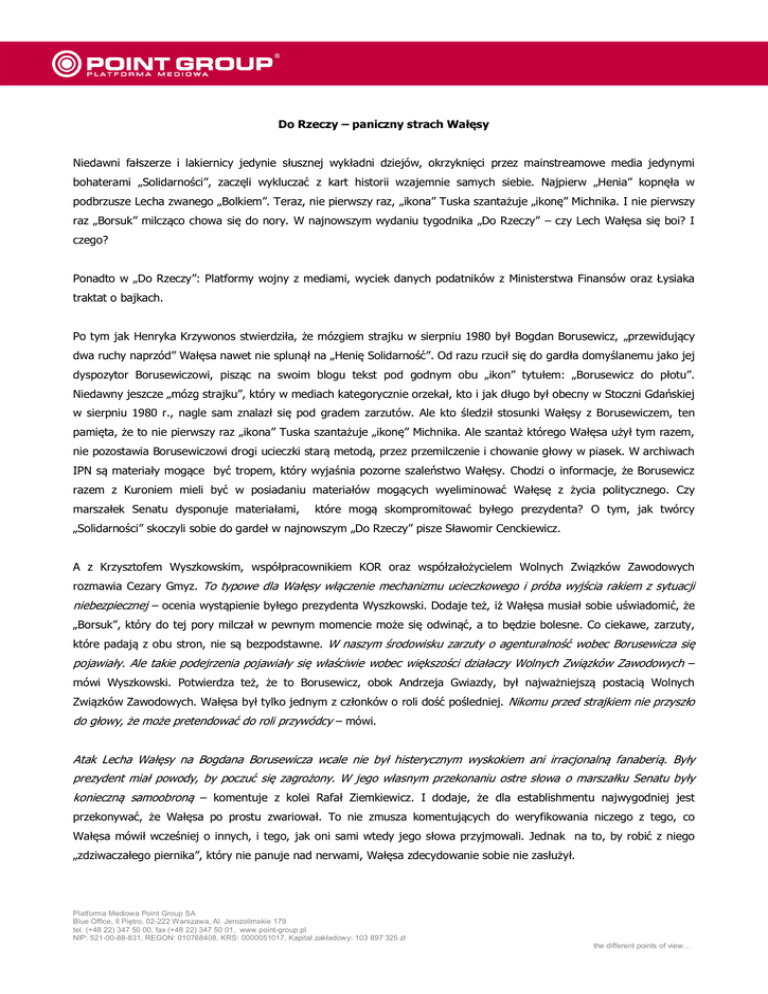 Do Rzeczy – paniczny strach Wałęsy Niedawni fałszerze i lakiernicy jedynie słusznej wykładni dziejów, okrzyknięci przez mainstreamowe media jedynymi bohaterami „Solidarności”, zaczęli wykluczać z kart historii wzajemnie samych siebie. Najpierw „Henia” kopnęła w podbrzusze Lecha zwanego „Bolkiem”. Teraz, nie pierwszy raz, „ikona” Tuska szantażuje „ikonę” Michnika. I nie pierwszy raz „Borsuk” milcząco chowa się do nory. W najnowszym wydaniu tygodnika „Do Rzeczy” – czy Lech Wałęsa się boi? I czego? Ponadto w „Do Rzeczy”: Platformy wojny z mediami, wyciek danych podatników z Ministerstwa Finansów oraz Łysiaka traktat o bajkach. Po tym jak Henryka Krzywonos stwierdziła, że mózgiem strajku w sierpniu 1980 był Bogdan Borusewicz, „przewidujący dwa ruchy naprzód” Wałęsa nawet nie splunął na „Henię Solidarność”. Od razu rzucił się do gardła domyślanemu jako jej dyspozytor Borusewiczowi, pisząc na swoim blogu tekst pod godnym obu „ikon” tytułem: „Borusewicz do płotu”. Niedawny jeszcze „mózg strajku”, który w mediach kategorycznie orzekał, kto i jak długo był obecny w Stoczni Gdańskiej w sierpniu 1980 r., nagle sam znalazł się pod gradem zarzutów. Ale kto śledził stosunki Wałęsy z Borusewiczem, ten pamięta, że to nie pierwszy raz „ikona” Tuska szantażuje „ikonę” Michnika. Ale szantaż którego Wałęsa użył tym razem, nie pozostawia Borusewiczowi drogi ucieczki starą metodą, przez przemilczenie i chowanie głowy w piasek. W archiwach IPN są materiały mogące być tropem, który wyjaśnia pozorne szaleństwo Wałęsy. Chodzi o informacje, że Borusewicz razem z Kuroniem mieli być w posiadaniu materiałów mogących wyeliminować Wałęsę z życia politycznego. Czy marszałek Senatu dysponuje materiałami, które mogą skompromitować byłego prezydenta? O tym, jak twórcy „Solidarności” skoczyli sobie do gardeł w najnowszym „Do Rzeczy” pisze Sławomir Cenckiewicz. A z Krzysztofem Wyszkowskim, współpracownikiem KOR oraz współzałożycielem Wolnych Związków Zawodowych rozmawia Cezary Gmyz. To typowe dla Wałęsy włączenie mechanizmu ucieczkowego i próba wyjścia rakiem z sytuacji niebezpiecznej – ocenia wystąpienie byłego prezydenta Wyszkowski. Dodaje też, iż Wałęsa musiał sobie uświadomić, że „Borsuk”, który do tej pory milczał w pewnym momencie może się odwinąć, a to będzie bolesne. Co ciekawe, zarzuty, które padają z obu stron, nie są bezpodstawne. W naszym środowisku zarzuty o agenturalność wobec Borusewicza się pojawiały. Ale takie podejrzenia pojawiały się właściwie wobec większości działaczy Wolnych Związków Zawodowych – mówi Wyszkowski. Potwierdza też, że to Borusewicz, obok Andrzeja Gwiazdy, był najważniejszą postacią Wolnych Związków Zawodowych. Wałęsa był tylko jednym z członków o roli dość pośledniej. Nikomu przed strajkiem nie przyszło do głowy, że może pretendować do roli przywódcy – mówi. Atak Lecha Wałęsy na Bogdana Borusewicza wcale nie był histerycznym wyskokiem ani irracjonalną fanaberią. Były prezydent miał powody, by poczuć się zagrożony. W jego własnym przekonaniu ostre słowa o marszałku Senatu były konieczną samoobroną – komentuje z kolei Rafał Ziemkiewicz. I dodaje, że dla establishmentu najwygodniej jest przekonywać, że Wałęsa po prostu zwariował. To nie zmusza komentujących do weryfikowania niczego z tego, co Wałęsa mówił wcześniej o innych, i tego, jak oni sami wtedy jego słowa przyjmowali. Jednak na to, by robić z niego „zdziwaczałego piernika”, który nie panuje nad nerwami, Wałęsa zdecydowanie sobie nie zasłużył. Platforma Mediowa Point Group SA Blue Office, II Piętro, 02-222 Warszawa, Al. Jerozolimskie 179 tel. (+48 22) 347 50 00, fax (+48 22) 347 50 01, www.point-group.pl NIP: 521-00-88-831, REGON: 010768408, KRS: 0000051017, Kapitał zakładowy: 103 897 325 zł the different points of view… Na łamach „Do Rzeczy” również o zimnym medialnym prysznicu, który spotyka ostatnio Platformę Obywatelską. Afera wokół zegarków ministra transportu Sławomira Nowaka, dymisja Jarosława Gowina, wpadka szefowej resortu sportu z milionami wyłożonymi na koncert Madonny, przegrane uzupełniające wybory senackie w Rybniku. W badaniu CBOS tak niskiego poparcia (23 proc.) Platforma nie miała od 2005 r. Nic dziwnego, że w partii zrobiło się nerwowo. Dotychczas politycy PO lubili podkreślać swoją wyższość nad innymi politykami (zwłaszcza nad tymi z PiS), jeśli chodzi o rozumienie mediów i pozyskiwanie ich sympatii. W ostatnich tygodniach jednak coś się zmieniło. Czyżby media zaczęły wyczuwać emocje i nastroje społeczne? Bo te są dla Platformy coraz mniej korzystne. I to znajduje wyraz w przekazie medialnym. Nastała jakaś moda na atakowanie PO – oceniają działacze Platformy. Uznanie mediów jest w układance premiera sprawą kluczową. Bez niego posypie się cała reszta. Czy wojna z mediami to w tej sytuacji dobry pomysł – o tym w najnowszym wydaniu tygodnika „Do Rzeczy”. W „Do Rzeczy” także poważna wpadka Ministerstwa Finansów. W trakcie szkoleń dla pracowników urzędów skarbowych doszło do złamania tajemnicy skarbowej i wycieku danych wrażliwych dotyczących szeregu podatników. Chodzi o numery NIP firm i osób prowadzących działalność gospodarczą. Te informacje zostały zgromadzone w hurtowni „WHTAX” – informatycznym magazynie danych podatkowych pochodzących z urzędów skarbowych z całego kraju. Materiał, jaki „wyciekł” na zewnątrz, to łakomy kąsek nie tylko dla wywiadowni gospodarczych. Uczestnicy szkolenia materiały dostali na… pendrive’ach ze szkolenia. W ocenie ekspertów, osoby, które dopuściły do wyniesienia danych, powinny ponieść odpowiedzialność karną. Szkolenie przeprowadziła prywatna firma. Ale wykładowcą-trenerem była